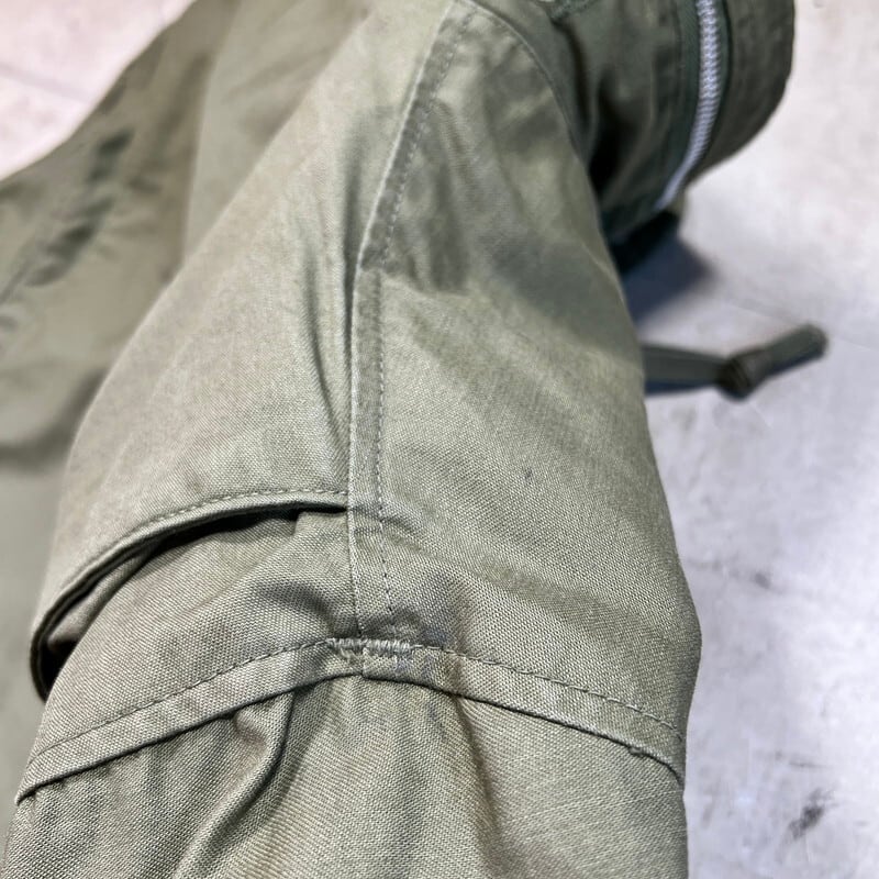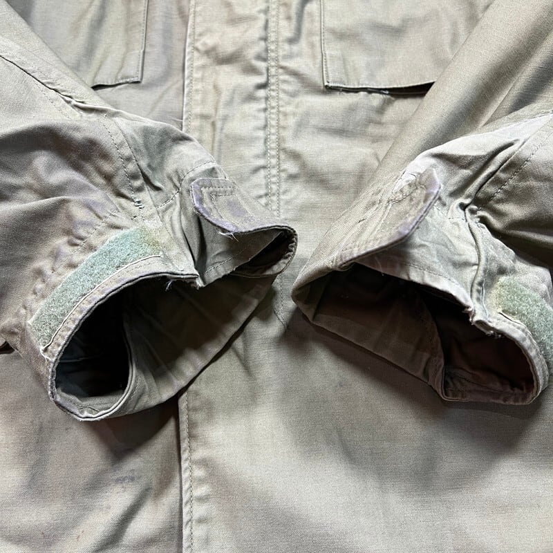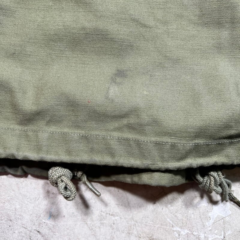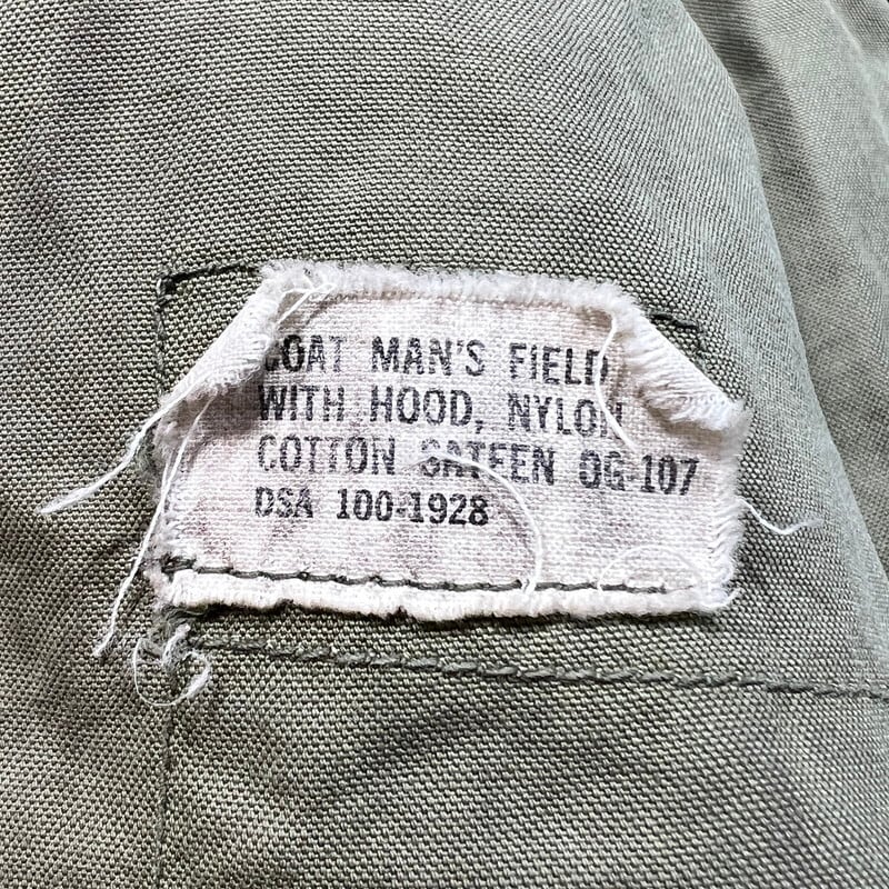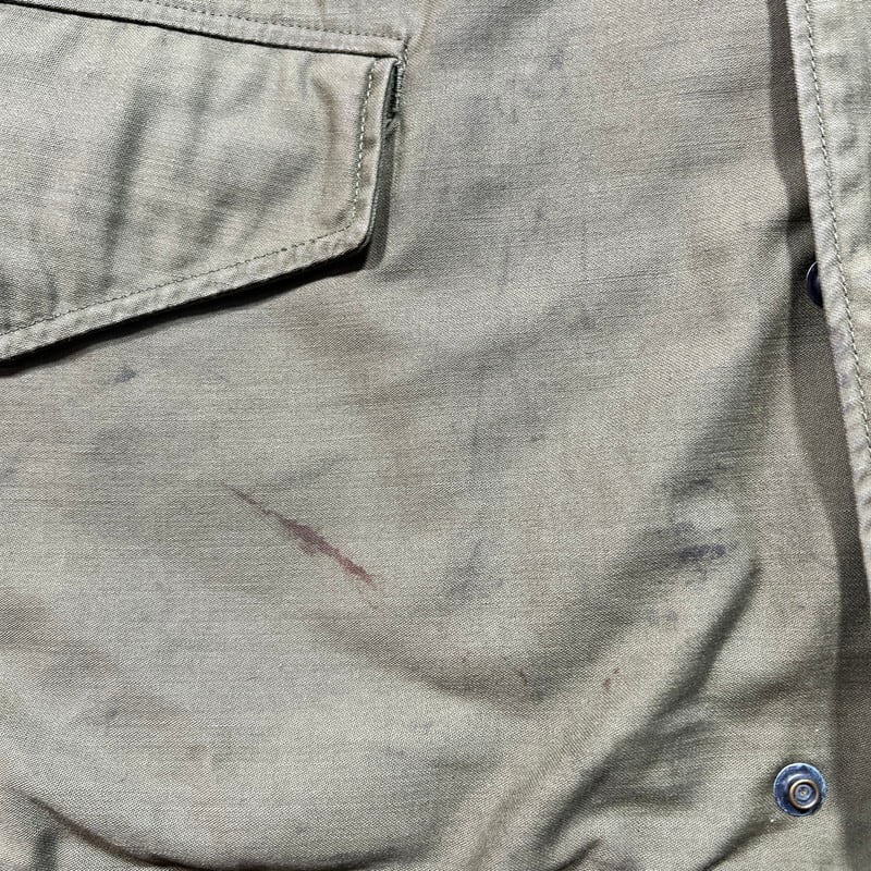 60年代のU.S.ARMY M-65フィールドジャケット1stモデルです。DSA100-1928、コントラクターは不明です。初期モデル特有のエポーレットが付かない仕様です。フロント、襟裏共にあCONMAR社のアルミジッパーが使用されています。両肩に米陸軍スペシャリスト E-4 ランク パッチと左腕には南十字星を模した第23歩兵師団のパッチが縫い付けられています。胸元にはネームパッチとU.S.ARMYパッチが付きます。袖や袖先,腹部に汚れがございます。ジッパー付け根にややほころびが見らえますが、まだ芯は裂けていませんので、開閉もスムーズです。気になるダメージは無く生地のコンディションは良好だと思います。タグのステッチが一部解けています。需要の高いREGULAR SMALLサイズです。ここ数年でM-65の1stモデルは人気も高まり以前に比べると見かけにくくなったように思います。エポーレット無しのこの1stモデルはお探しの方も多いと思いますので、この機会にいかがでしょうか。
