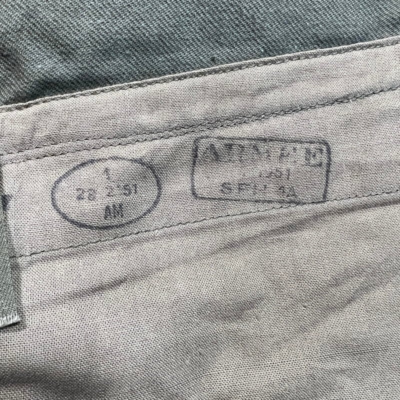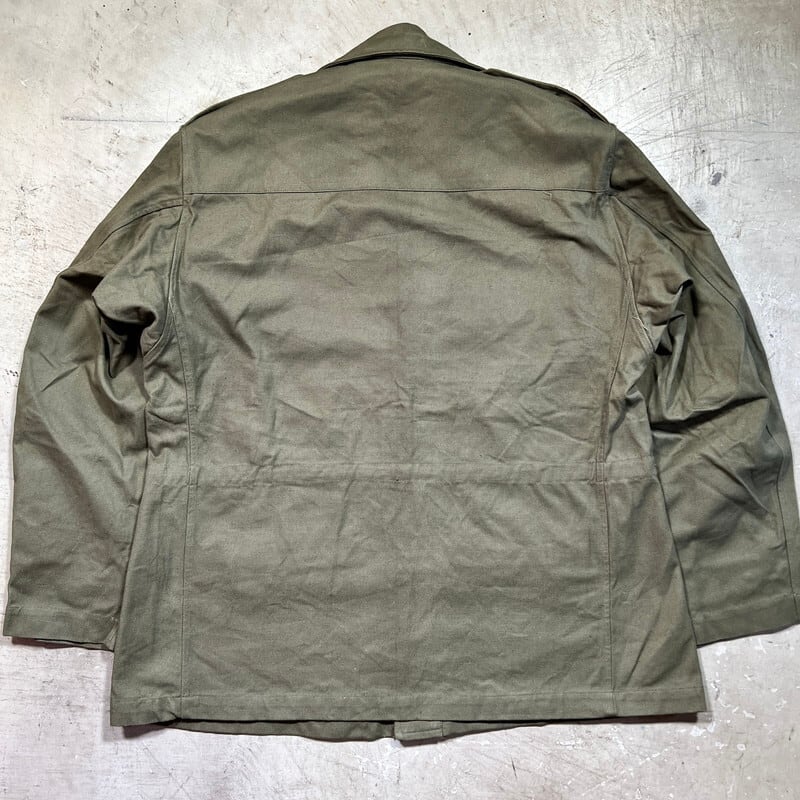 50年代のフランス軍M47フィールドジャケットです。内側のスタンプから1951年頃のモデルだと思われます。米軍のM-1943をベースに作られたという説もあるこちらは,平織のコットンツイルを使用した前期型です。米軍のフィールドジャケットに比べ色味もコヨーテブラウンに近いオリーブで、シルエットもどこかスタイリッシュな印象を受けます。恐らくまだ水に通っていないデッドストックに近いミントコンディションです。腹部あたりにうっすらとヤケがございます。サイズ表記が2桁では無いタイプで、104Lと記載されており、実寸もL相当かと思います。フランス軍特有の少しざらつきのあるコットンツイル地は着込めばアタリ等の経年変化も楽しめます。デッドストックに近い個体ですので1から育てる事も出来ますので、お探しだった方は是非いかがでしょうか。
