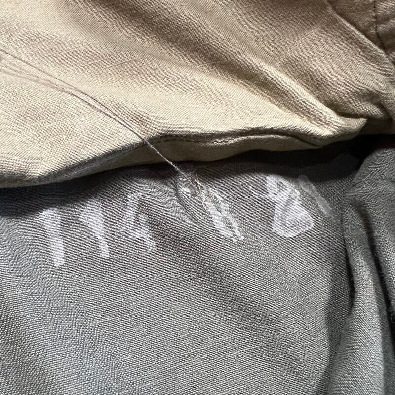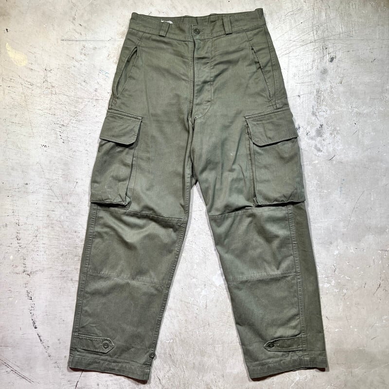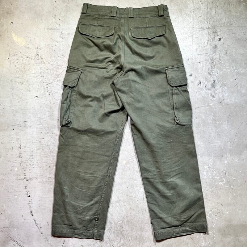 50年代から60年代頃のフランス軍M-47カーゴパンツです。前期型との違いはヘリンボーン地を採用、少しテーパードが入り米軍のカーゴパンツに比べ野暮ったさも無くワイドながらもすっきりとしたシルエットが特徴です。サイドポケットはマチがあるのでたっぷり収納できます。内側スレーキ裏にステンシルが入ります。全体的にやや使用感はございますが、目立つ汚れやダメージは無く状態は良好です。M47では比較的大きいサイズが多いですが、こちらは実寸W31と男女共に穿きやすいサイズ感です。米軍のフィールドパンツと比べると野暮ったく無くシルエットが綺麗ですので、まだお持ちで無い方にはお勧めな1本です。