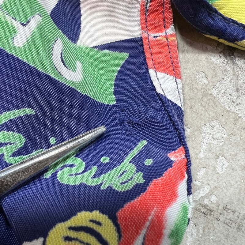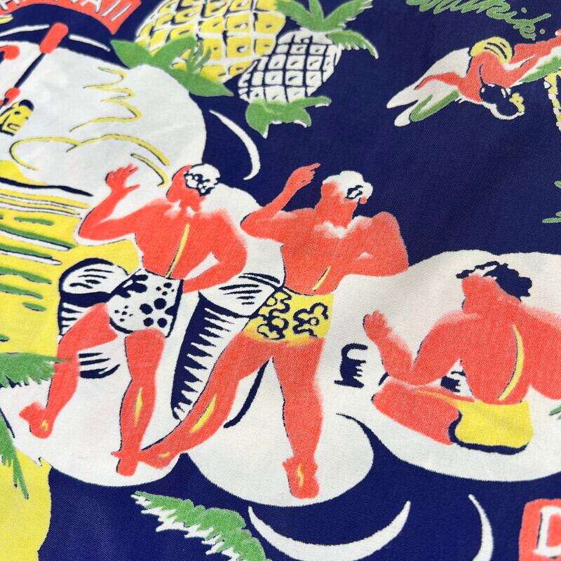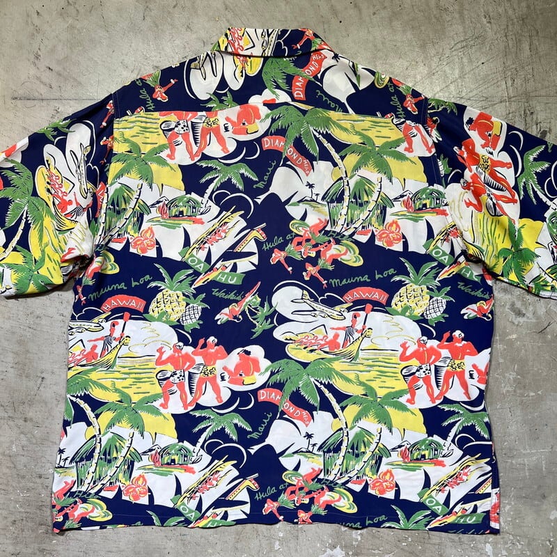 50年代頃のBrewsterレーヨンハワイアンシャツです。ブランド詳細は不明ですが、ヴィンテージシャツで見かける機会もあるかと思います。レーヨン地にランドスケープやフラガール、飛行機等の図柄が全面にプリントされた1着です。襟は袋縫いのロングポイント、ループボタンの開襟仕様です。襟の擦れ、ボタンホール、左肩にリペアがございます。右脇付近に小さなダメージがございます。全体的に色褪せもございますが、ヴィンテージハワイアンシャツとしてはコンディションは良好な部類だと思います。ML表記で着やすいサイズ感です。色のバランスが良くこのタイプのパターンがお好きな方も多いのでは無いでしょうか。年々ヴィンテージアイテムの枯渇が進んでおりますが、ハワイアンシャツも良いサイズ感の物が見つかりづらくなっておりますので、お探しの方は是非この機会にいかがでしょうか。個人的にもオススメな1着です。