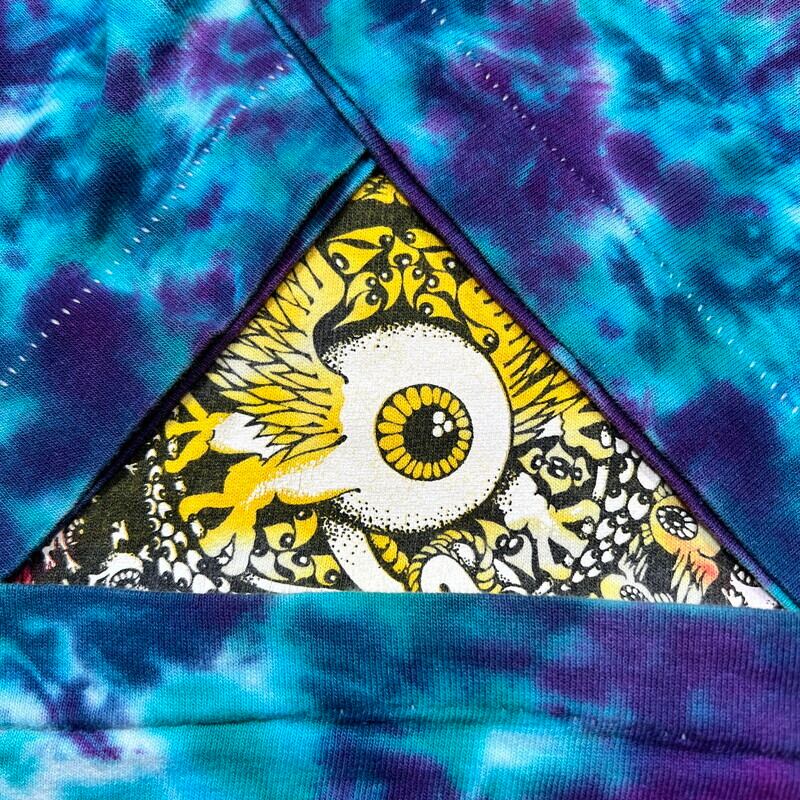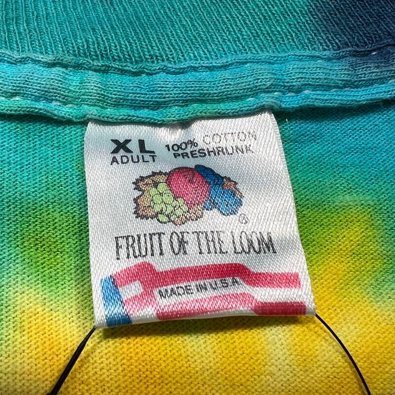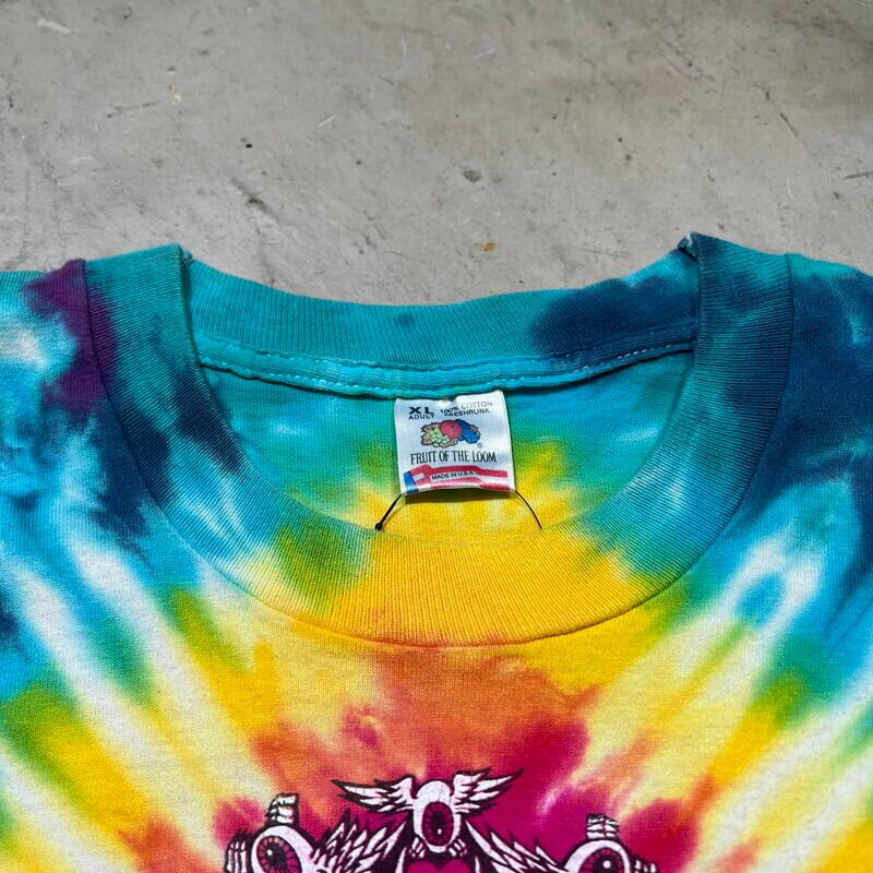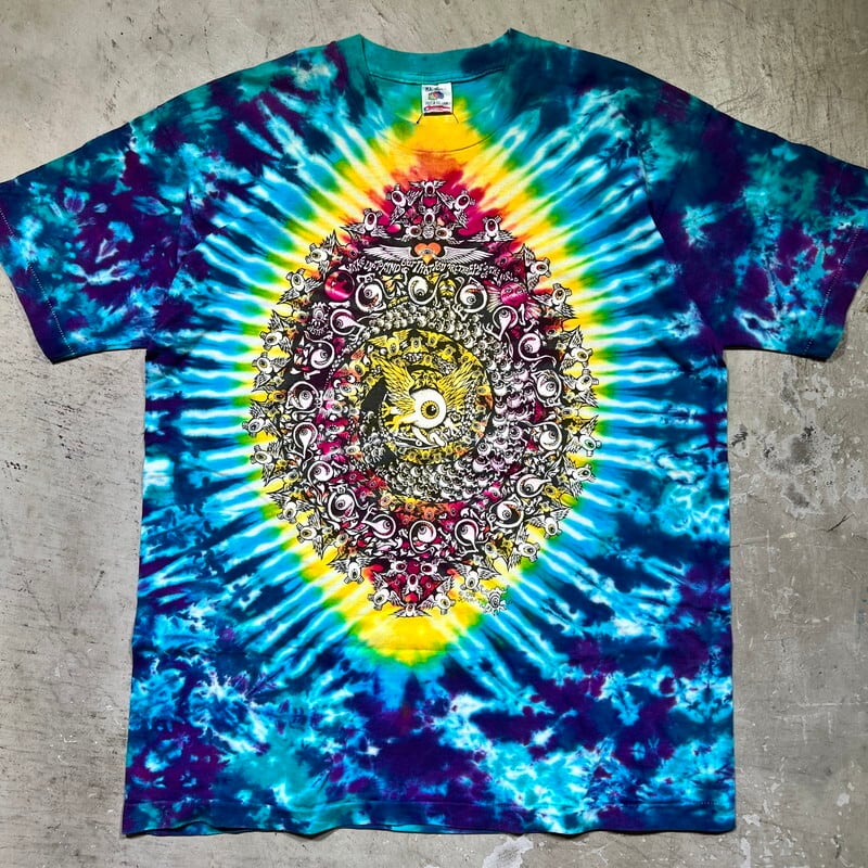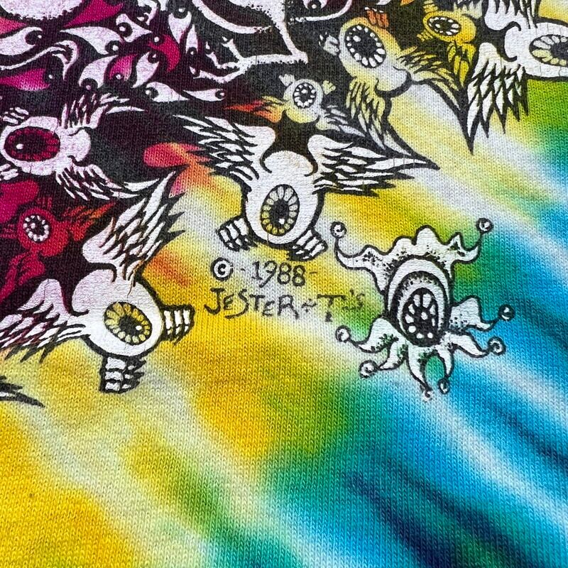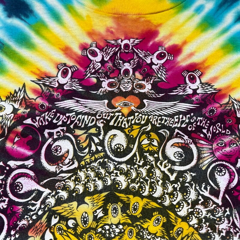80年代のGRATEFUL DEAD EYES OF THE WORLD 歌詞タイダイプリントTeeです。1973年に発売されたアルバム「Wake of the Flood」に収録されている「EYES OF THE WORLD」の歌詞の一部とフライングアイボール等の目玉のプリントが施された1着です。ボディはFRUIT OF THE LOOM社製で、タイダイ染めされております。コピーライトはJESTER T'Sです。サークルアイズとも呼ばれ、細かな物まで入れると数百個の目玉が描かれたサイケデリックなデザインが特徴的です。デッドヘッズ向けに作られたアンオフィシャルTeeだと思われます。若干の使用感はございますがダメージや汚れの少ないグッドコンディションです。サイズはXLでゆったりシルエットです。これからの季節に開催されるフェスや野外イベント等で是非。