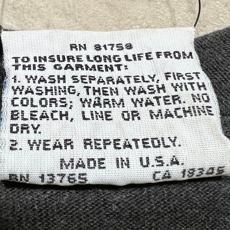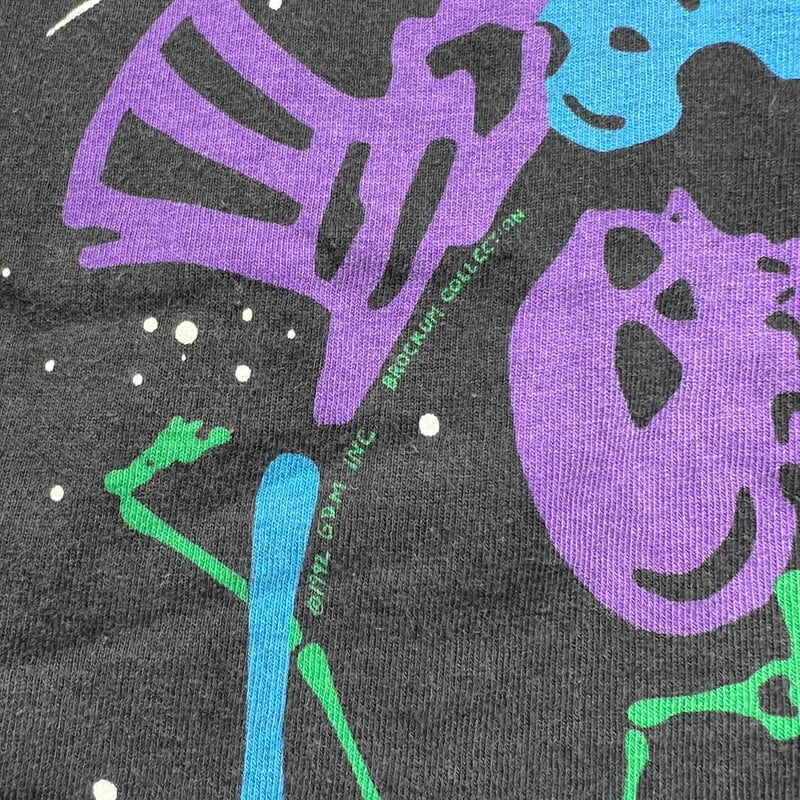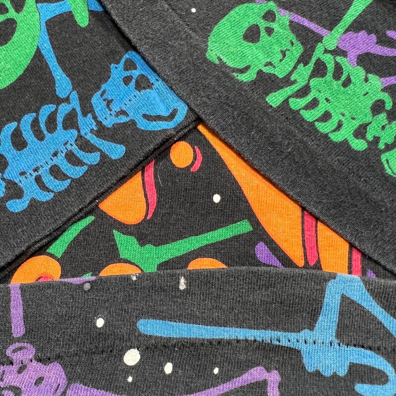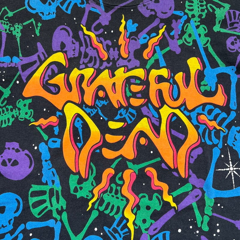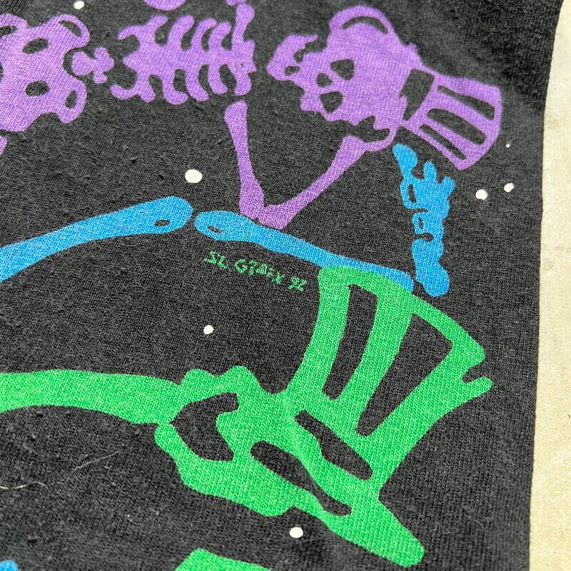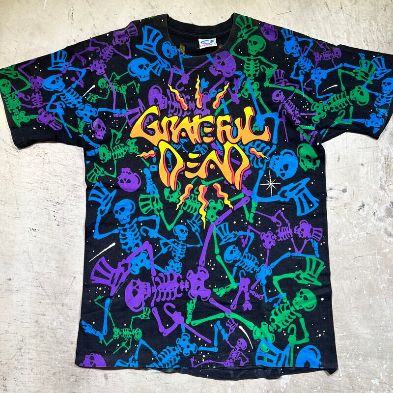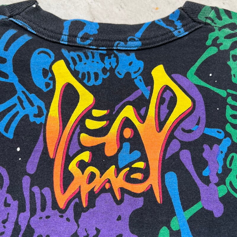 90年代のGRATEFUL DEAD、DEAD SOACE DANCING SKELTON オールオーバープリントTeeです。1992年コピーライトが入るこちらはLIQUID BLUEボディで、全面にダンシングスカルがカラフルにプリントされたインパクト大の1着です。プリントは染み込みのシルクスクリーンプリントで、ボディはタイダイでは無くブラックです。袖と裾共にシングルステッチです。若干の色褪せが有り、裾のステッチが一部ほつれています。その他コンディションは比較的良好です。サイズはLで需要も高いかと思います。グレイトフルデッドの中でもオールオーバーパターンプリント物はなかなか見かけないと思います。デッドヘッズのみならず、このインパクトに惹かれる方も多いのでは無いでしょうか。ガンガンに着倒してボロボロになっても映えるデザインですので、ビビっと来た方は是非この機会にいかがでしょうか。
