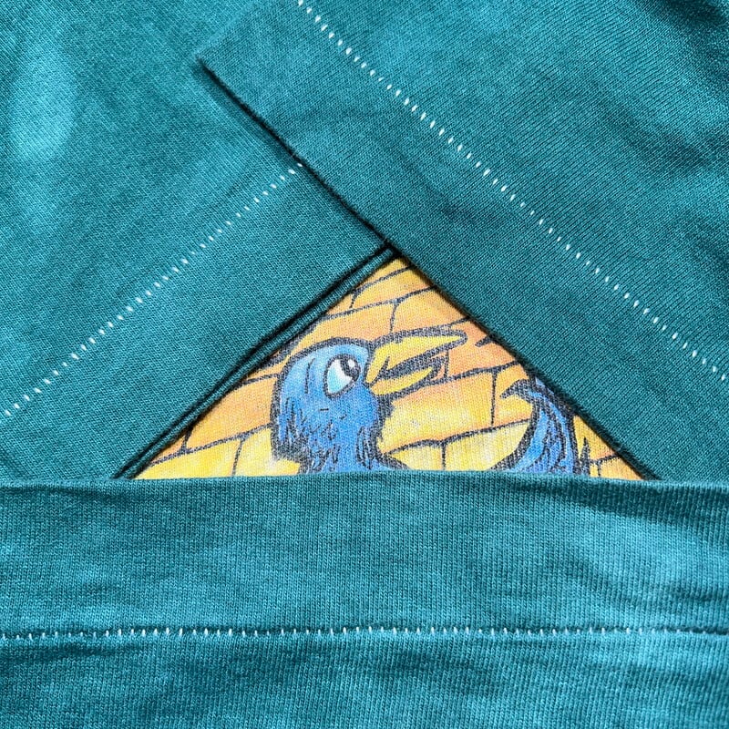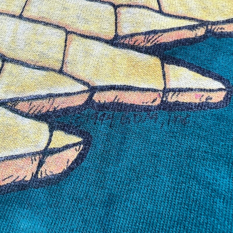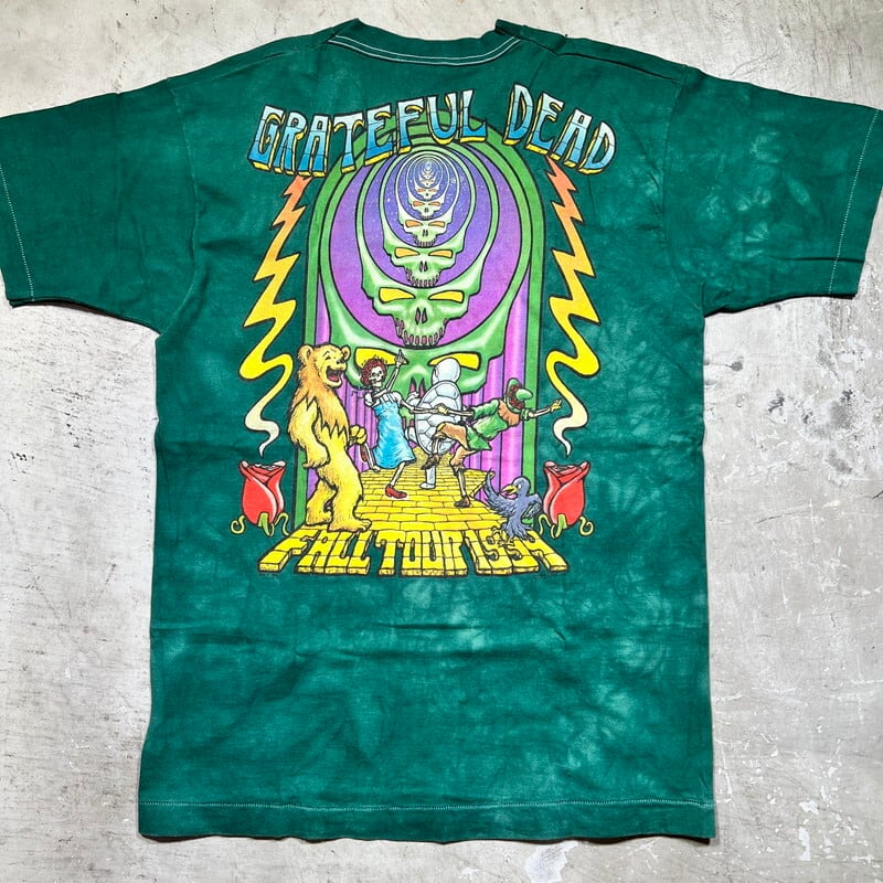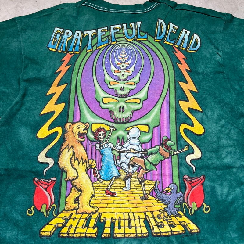 90年代のGRATEFUL DEAD FOLLOW THE GOLDEN ROAD FALL TOUR 1994 プリントTeeです。1994年のFALLツアーの際に作られた物と思われ、オズの魔法使いモチーフにしたパロディデザインが非常に珍しい1着です。ボディはLIQUID BLUEで、コットン100%のUSA製です。袖、裾共にシングルステッチです。タイダイ染めですが、染ムラが少なくパッと見はグリーンボディに見えるのでタイダイの派手さが苦手な方でも着やすい色味です。多少使用感はございますが、撚れ等も少なくコンディションは良好です。Lサイズで着やすいサイズ感です。デッドヘッズのみならず、このインパクトに惹かれる方も多いのでは無いでしょうか。ガンガンに着倒してボロボロになっても映えるデザインですので、ビビっと来た方は是非この機会にいかがでしょうか。