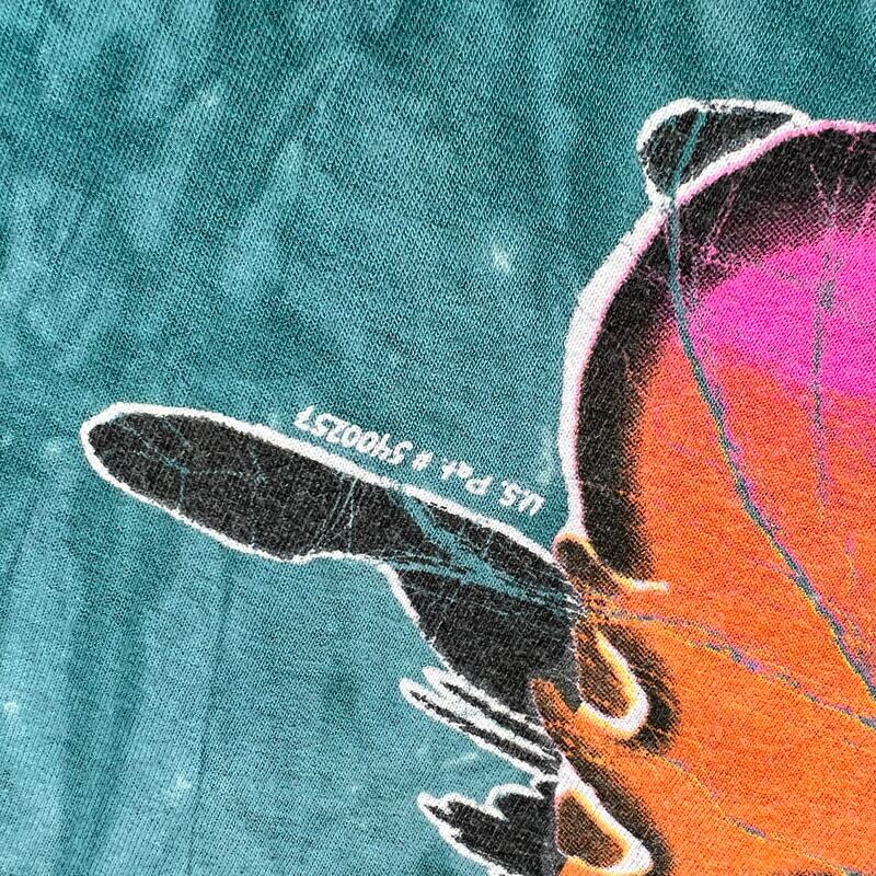 90年代のGRATEFUL DEAD BIG BEARタイダイTeeです。1995年コピーライト入り、ボディはTENNESSEE RIVERです。タイダイ染めの上からクラック模様の入ったバティックプリントが施されています。前後共に大きなデッドベアが目を惹く1着です。コピーライト以外にU.S.PATENTSナンバーが入るのも珍しいかと思います。全体的に若干色褪せはありますが、気になるダメージや汚れはございません。インパクト大ですが、このデザインがお好きな方は多いのでは無いでしょうか。XLでゆったりとしていますので、女性がワンピースの様に合わしても可愛いと思います。フェスやキャンプ等のお共に是非いかがでしょうか。