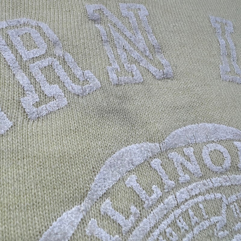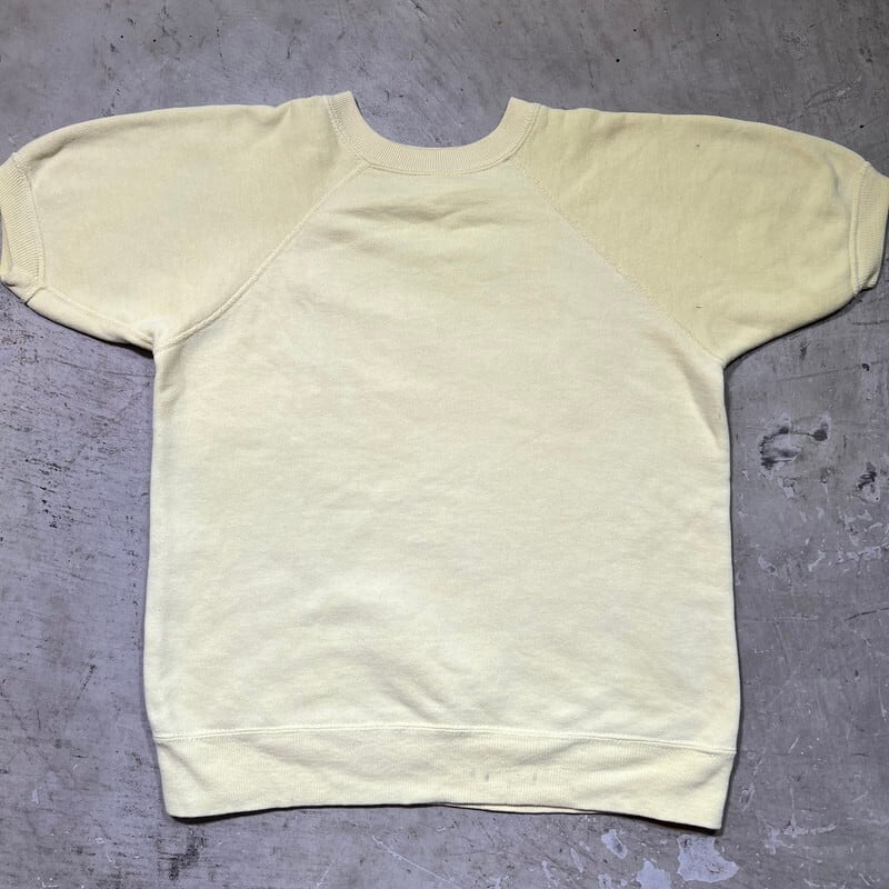 50年代から60年代頃のラグランカレッジスウェットです。1899年にイリノイ州で創立したWestern Illinois Universityのプリントが入る1着です。1957年にこのWestern Illinois Universityへと学校名が変更されたので、1957年から1960年代初頭頃のアイテムかと思われます。タグが欠損している為ボディーメーカーは不明です。ヴィンテージスウェットの中でも格段に出現率の低いレモンイエローボディで、フロントには元々フロッキープリントが施されていたようです。現在はフロッキーのほとんどが剥がれており、細かな毛羽立ちが確認できる程度です。フロントと右袖背面側と裾リブ背面側に薄汚れがございますが、生地のダメージは無く状態は良好です。サイズは小さめでS相当でしょうか。色味も良いのでアメカジ好きな女性にお勧めしたいサイズ感です。レモンイエローカラーはお探しの方も多いと思いますので、サイズが合う方は是非この機会にいかがでしょうか。