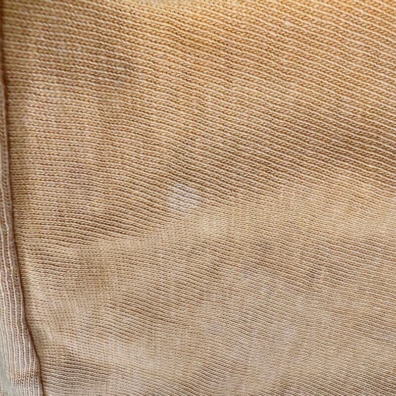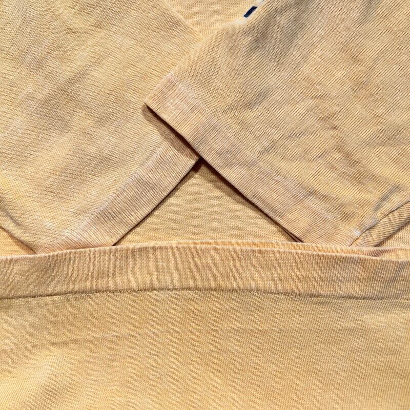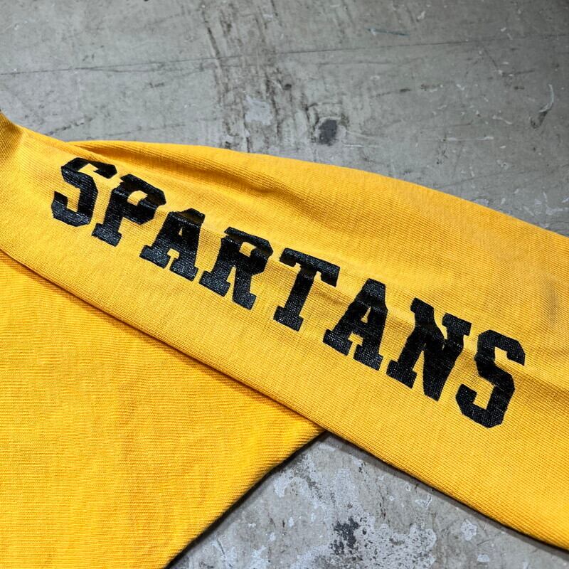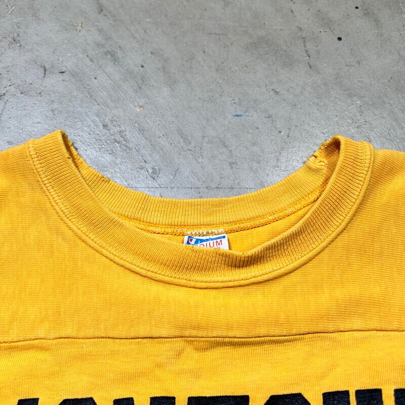 70年代から80年代頃のChampionフットボールTeeです。肌ざわりの良いコットン100%ボディです。左裾にはサイズ表記のタタキタグが縫い付けられています。フロントにMONTOUR、左袖にSPARTANSとプリントが入る珍しい仕様です。袖裾共にシングルステッチです。全体的に使用感が有り、首元のリブに若干ダメージがございます。背面首下にピンホールが1箇所あり、左アーム掘る付け根にも小さなダメージが見られます。全体的にやや色あせがあります。一部丸く薄い色抜けのような箇所があります。ややダメージはありますが、イエロー×ブラックに配色はお好きな方も多いのでは無いでしょうか。袖にプリントが入る個体はあまり見ない印象です。希少なCHAMPION PRODUCTS INC表記で、サイズはMEDIUMで、身幅は細目です。サイズが合う方は単体でも様になる配色ですし、少しタイトに感じる方はオーバーオール等と合わせもカッコ良いと思います。赤系のフットボールTeeが多い印象ですのでイエローをお探しだった方は是非いかがでしょうか。好配色でオススメです。