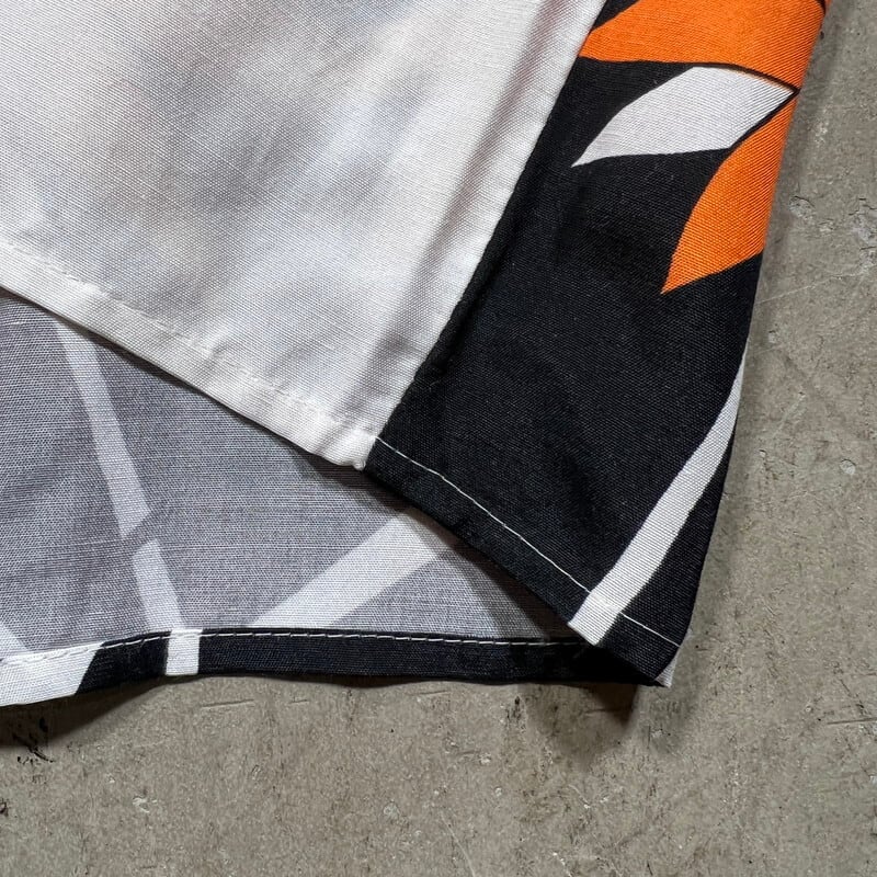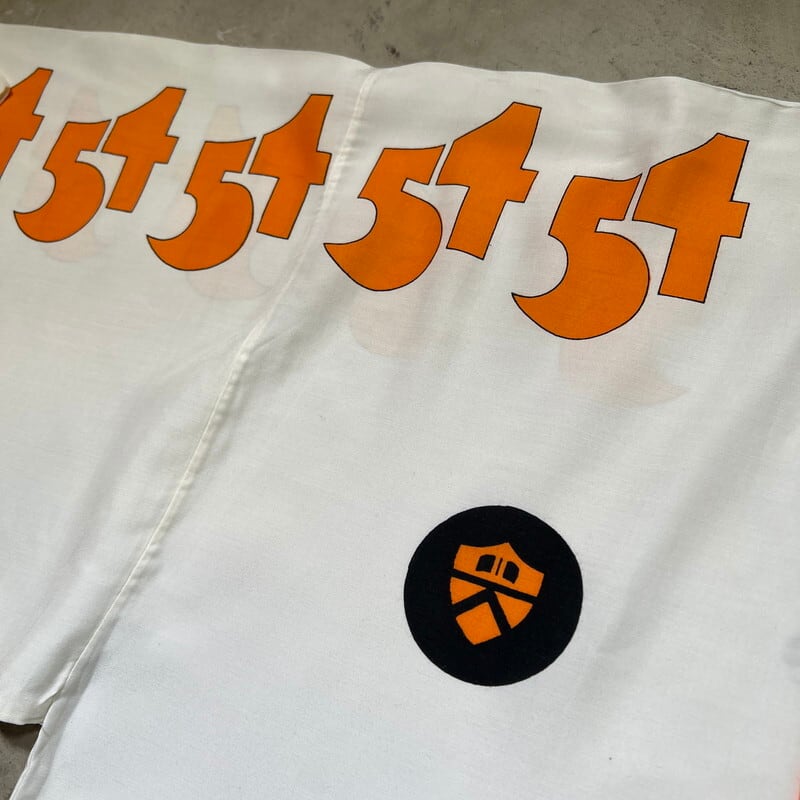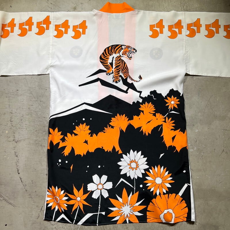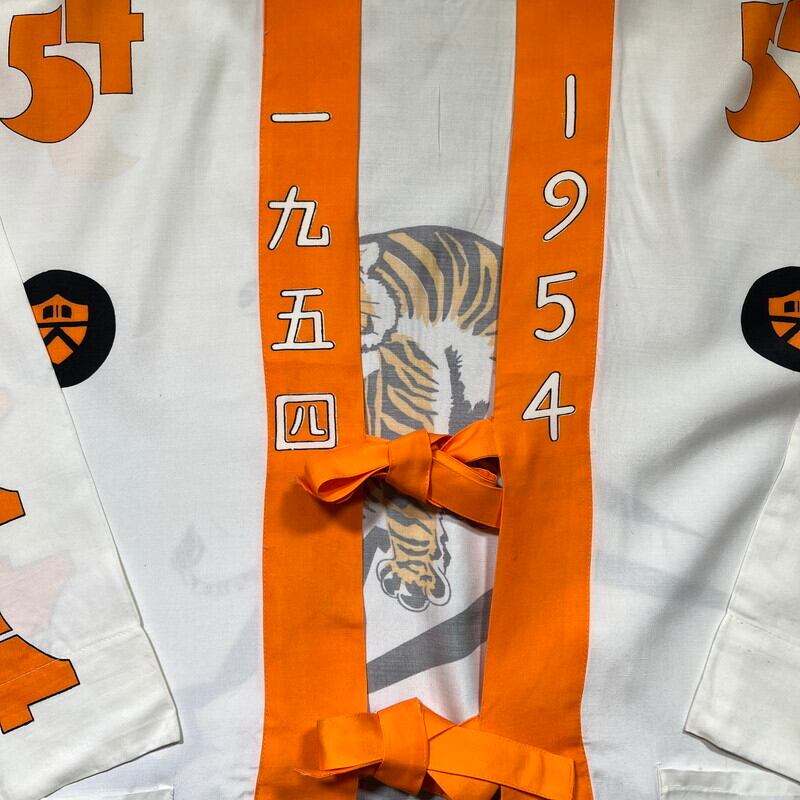 60年代のプリンストン大学メモリアルガウンです。1746年ニュージャージー州で創立した超名門校です。このプリンストン大学では毎年卒業式前に全卒業生で同窓会が行われ、P-RADEというパレードが開催される事で知られています。卒業生はビアジャケットを着用して参加しますが、各卒業生ごとに形やデザインが違うものを身に着けます。ヴィンテージ市場でも有名な手書きのメッセージ入りのメモリアルジャケットもこのプリンストン大学の物が多く、マスコットのタイガーが印象的ですね。ご紹介するこちらは、1954年の卒業生の一人がUSMCに入隊後日本に駐留していた際、日本の文化や歴史に触れこの法被タイプのメモリアルガウンを思いつき制作したようです。卒業してから5年目の1959年に初めて法被スタイルを導入し、こちらは3代目のデザインで、卒業15周年目の1969年のパレードで使用された1着です。漢数字やレトロなフォントの54の文字が両腕に入り、背面には和を連想させる日本画のような虎に花のデザインが全てハンドプリントで施されています。細かく小さな薄汚れはございますが、使用感はほとんど無く非常に綺麗なミントコンディションです。サイズ表記は42ですが、法被ですのでフリーサイズのようなサイズ感です。コレクションとしては申し分ないスペシャルピースです。なかなか普段のコーディネートで使うのは難しいかもしれませんが、法被タイプはほとんど流通しておらず非常に珍しいのでコレクターの方は是非必見です。