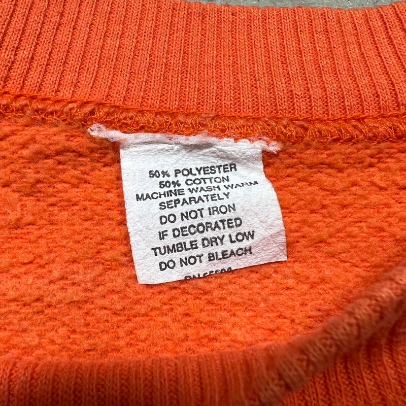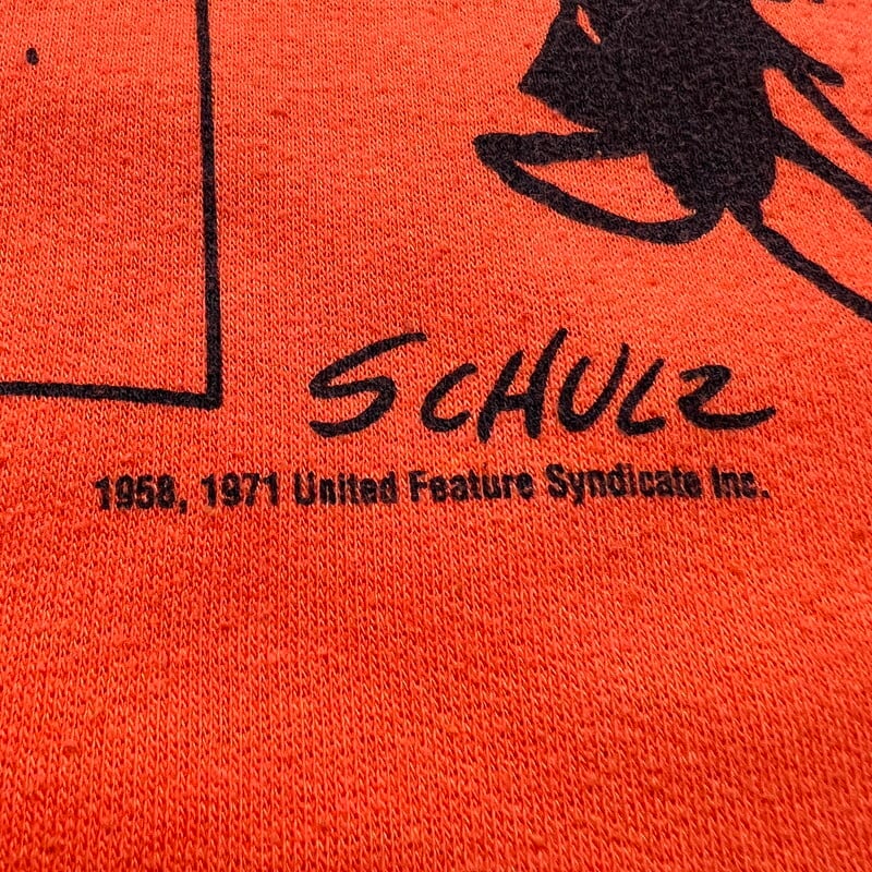 70年代から80年代頃のSNOOPYカレッジプリントスウェットです。タグが一部欠損していますので、ボディーメーカーは不明です。70年代から80年代頃に作られたカレッジシリーズのアイテムだと思われます。スヌーピーが妄想の中で大学生に変装しているJOE COOLがプリンストンと書かれた壁に寄りかかっているプリントが施されています。カレッジカラーのオレンジとブラックが目を惹く1着です。袖はセットインスリーブです。サイズ表記はございませんが、M~L相当です。右脇に小さな汚れがあり、全体的にやや毛羽立ちが見られます。ダメージは特にございません。スヌーピーのキャラクターの中でも人気の高いJOE COOLがお好きな方は是非いかがでしょうか。かなりカジュアルなデザインですが、敢えてプレッピースタイルで合わせてみてはいかがでしょうか。