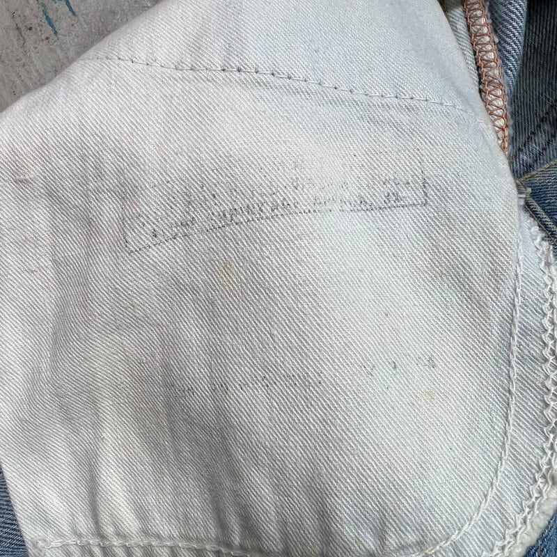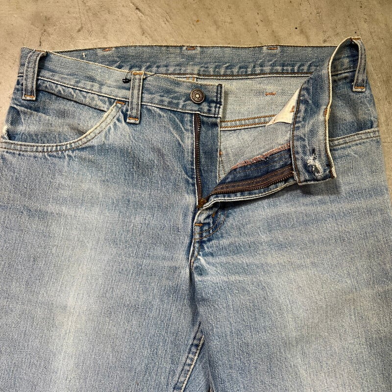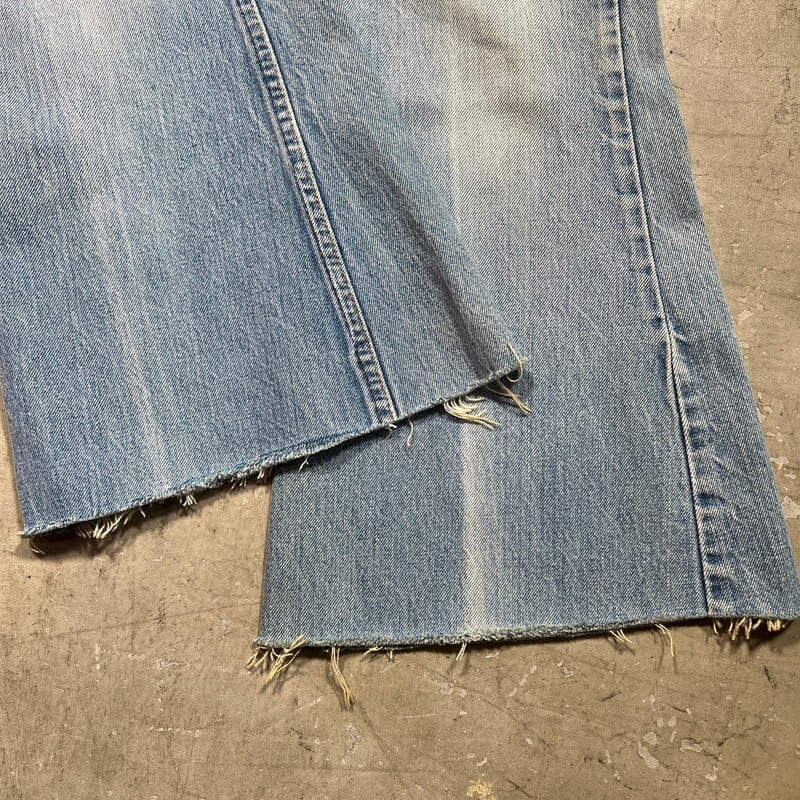 70年代初頭頃の、LEVI'S 684フレアデニムパンツです。トップ裏刻印4、42TALON、スレーキスタンプ、Big Eオレンジタブ、均等V。スレーキスタンプが消えかかっていますが、かなりうっすらと684-0217と確認できました(肉眼では難しいです)。ベルボトムよりさらに裾に広がりがあるビッグベルと呼ばれるモデルです。色は全体に褪色しており、2割程の色残りです。両裾共にかとオフされています。内股に擦れやバックポケットなどにも細かな擦れが見られます。シミ汚れも若干ございます。カットオフ以外に大きなダメージは無く状態は良好です。ウエスト実寸は約W31インチです。60年代から70年代頃のヒッピームーブメントの影響が色濃く残るフレアパンツですので、ディスコシャツやタイダイTee等で当時のスタイルを楽しんでみてはいかがでしょうか。