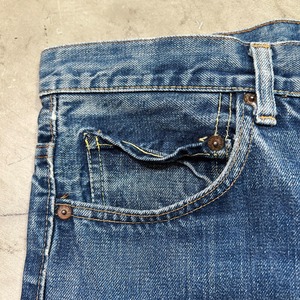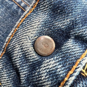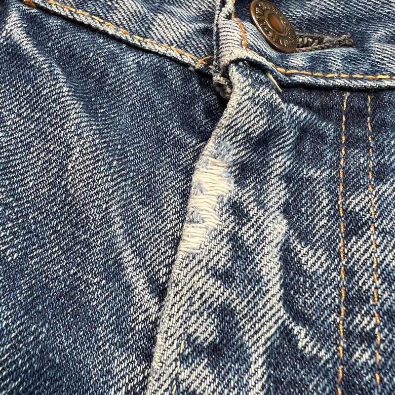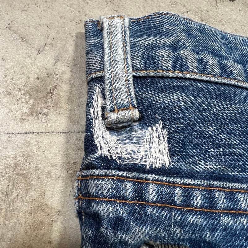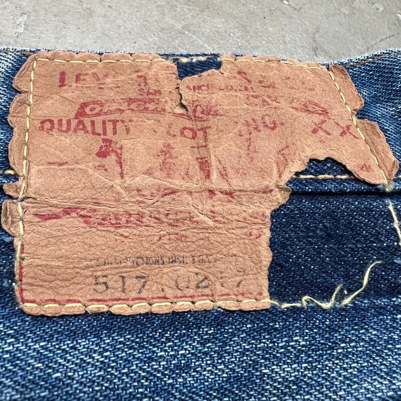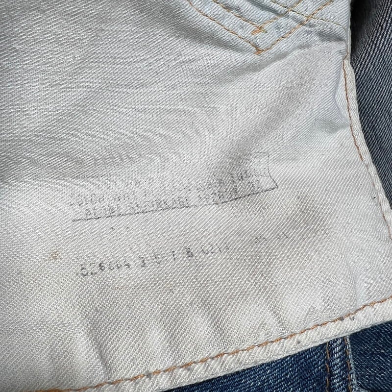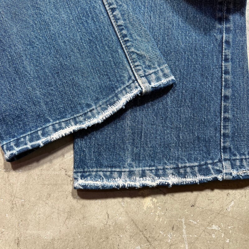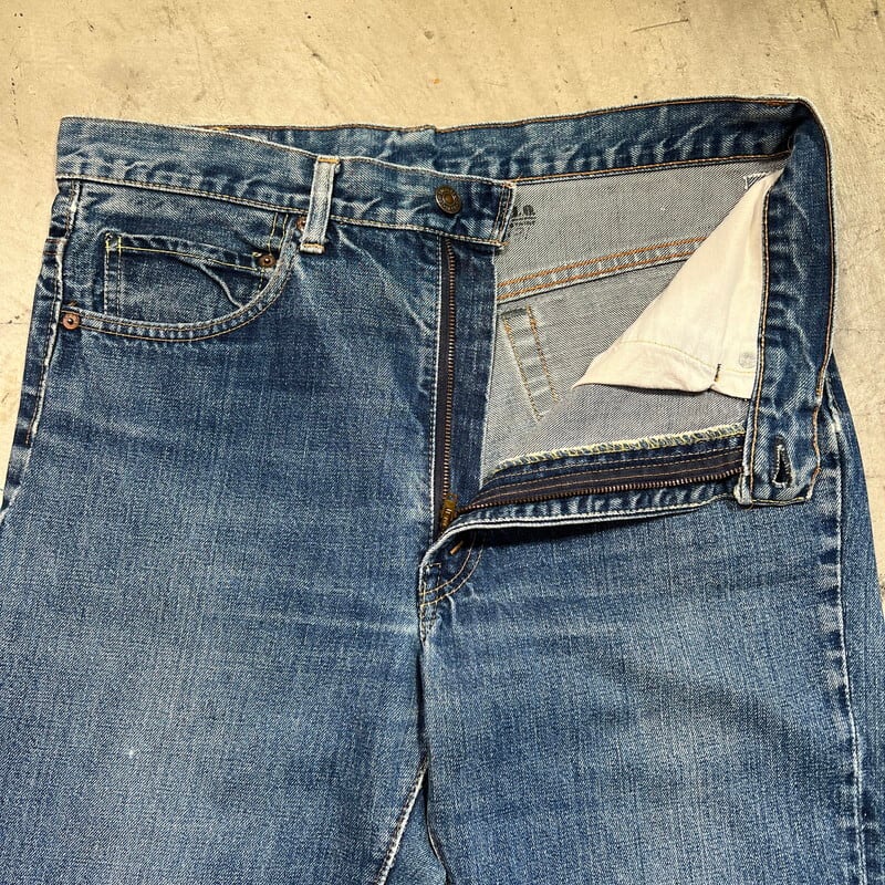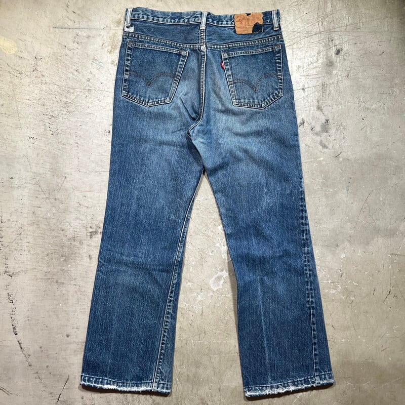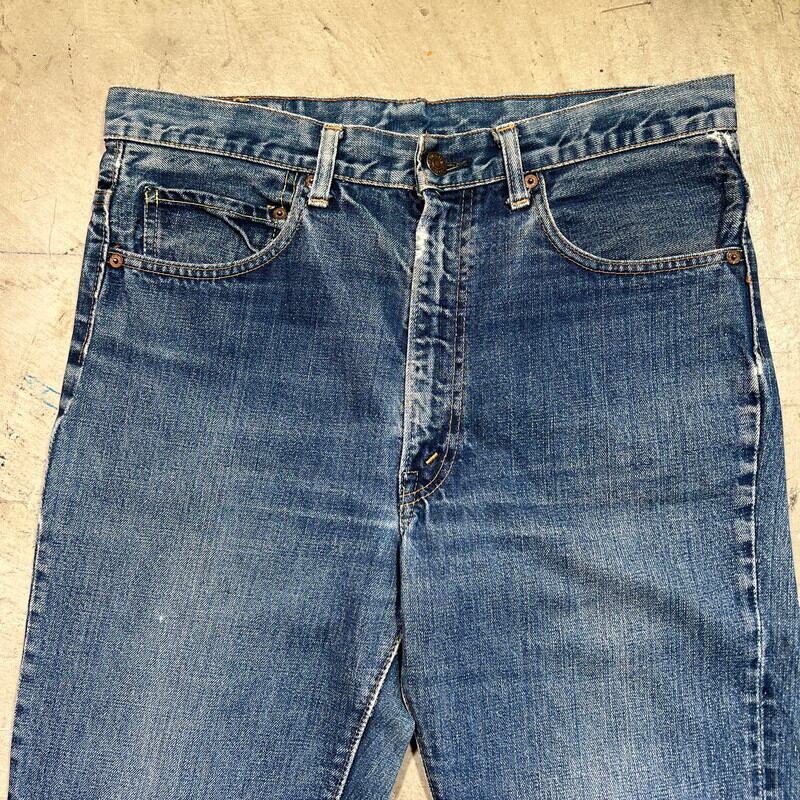 70年代のLEVI'S 517-0217ブーツカットデニムです。トップボタン裏刻印8、42TALON、バックポケット裏シングル、アウトシーム裏両面シングル、スレーキスタンプ、赤タブBig E、不均等V。1971年にデニムラインの517が発売され、66前期へ移行するまでの僅か1~2年程という極めて短い期間のみ製造されていた希少なBig Eモデルです。色残りは5割程で、うっすらと腿にヒゲが確認できます。内側にイタリアにあるANGELO VINTAGE CLOTHINGという大きなヴィンテージショップのスタンプが押されています。左サイドのベルトループ付け根と、両裾に簡易的なリペアがございます。紙パッチは一部欠損しています。その他擦れや小傷などございますが、比較的コンディションの良い個体です。こちらはブーツカットですが、裾の広がりは控えめでストレートに近いシルエットです。ウエストは実寸W34インチとゴールデンサイズです。517のBig Eモデルはなかなか見かける機会も少ないので、お探しだった方は是非いかがでしょうか。
