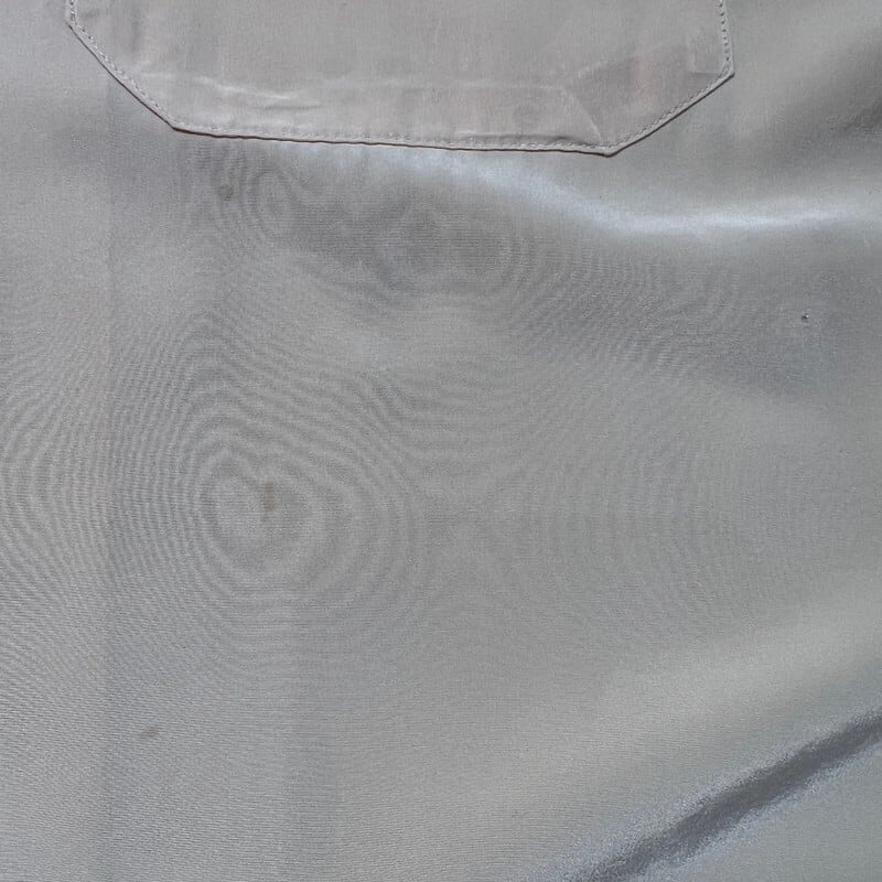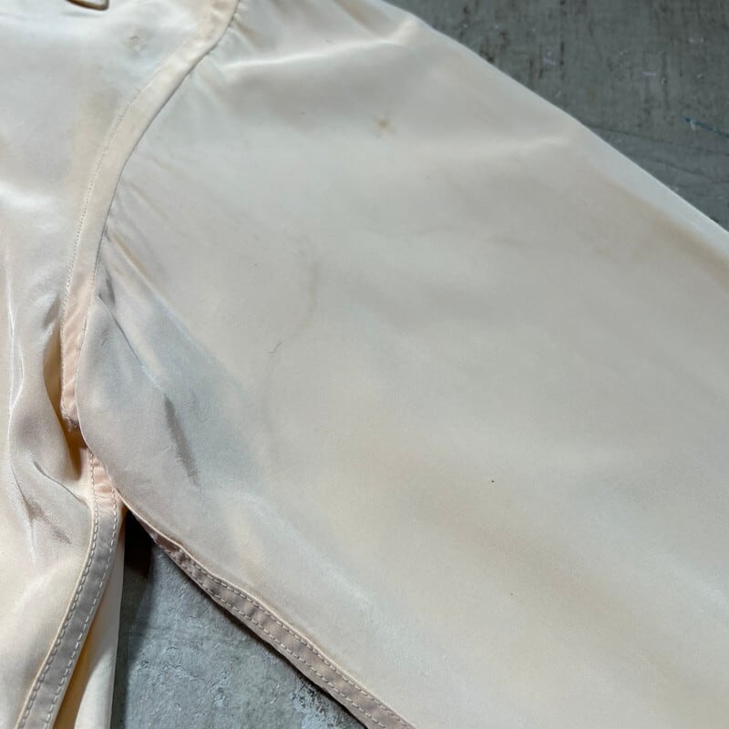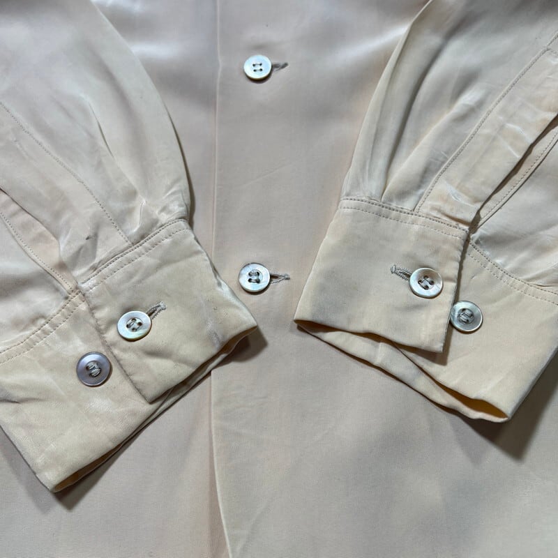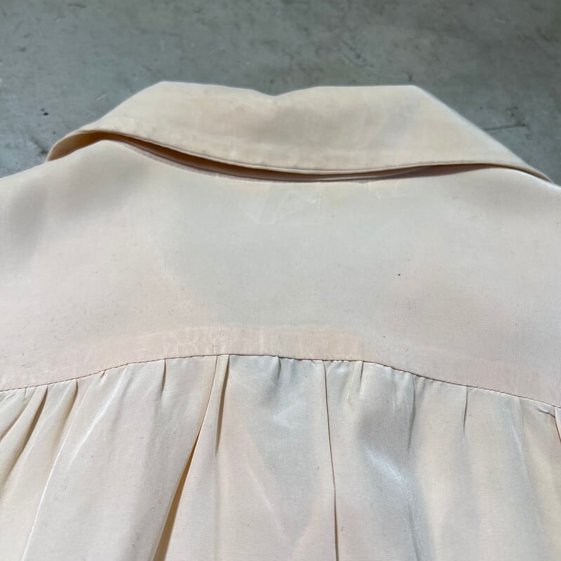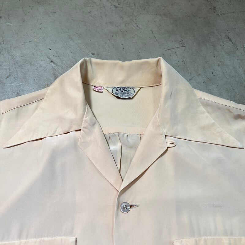 40年代頃のPilgrim ナイロンオープンカラーシャツです。アメリカ3大ストアで知られるSearsがワークウェアを展開していたプライベートブランドです。ご紹介するこちらは、ナイロン地で作られたシャツでループボタンが付くオープンカラー仕様です。古いシェルボタンが使用され、襟先は袋縫いのロングポイントです。hピンクベージュの様な色味で、全体的に薄汚れや色褪せがございます。襟や肩などにシミも見られます。3か所程裏からピンホールを塞いだ箇所がございます。Sサイズ表記ですが、実寸はM相当はあるかと思います。テロっとした素材感が良く、少しルードなスタイルに合わせてみるのも良いと思います。サイズやシルエットが良いのでお勧めです。