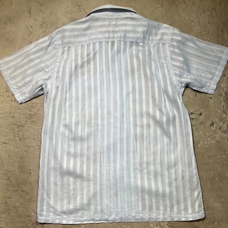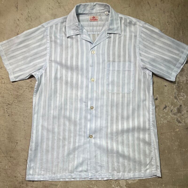 60年代頃のJack Robbinsオープンカラーシャツです。Jack Robbinsは1942年にシカゴで創業し2006年に閉店した衣料品店です。ご紹介するこちらは、シースルータイプのストライプ柄で、コットンでは無い混紡生地が使用されています(ナイロンやアセテートのような感じです)。ループボタンの付く開襟仕様で、襟芯が入ります。ポケットは柄合わせされています。襟元に薄汚れ、右肩やフロント中央付近に薄汚れがございます。ダメージは特に無く生地の状態は良好です。Mサイズ表記で男女共に着やすいサイズ感です。シースルーですので、インナーに柄物は合わせず、シンプルなタンクトップ等でラフに合わせていただくと使い易いと思います。色味も涼し気でこれからの季節にお勧めです。