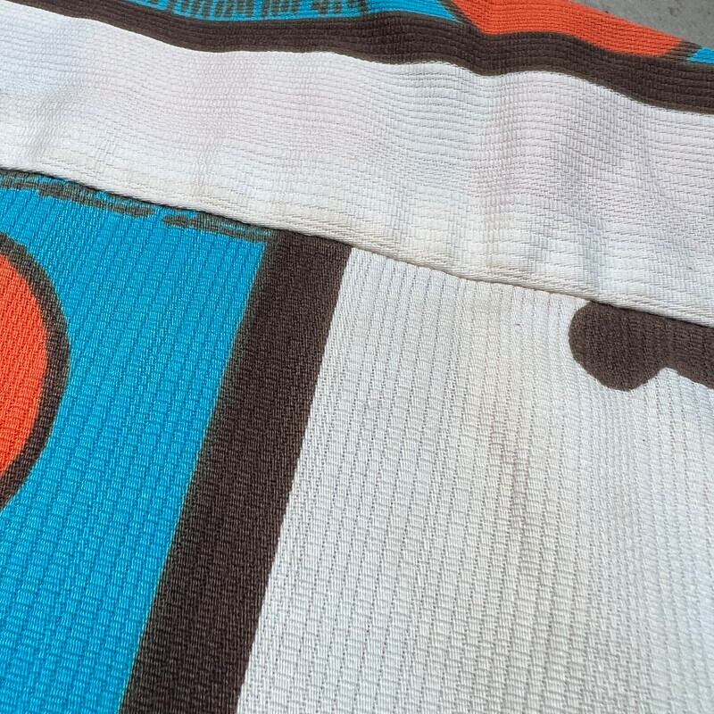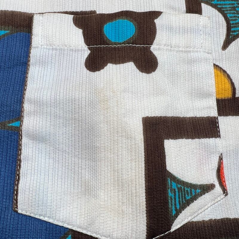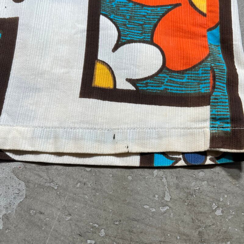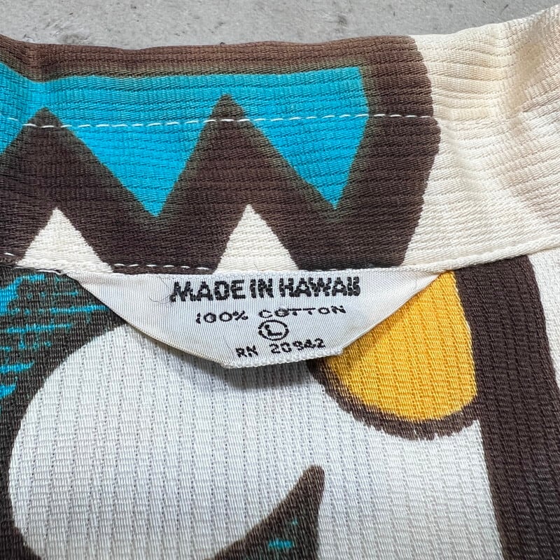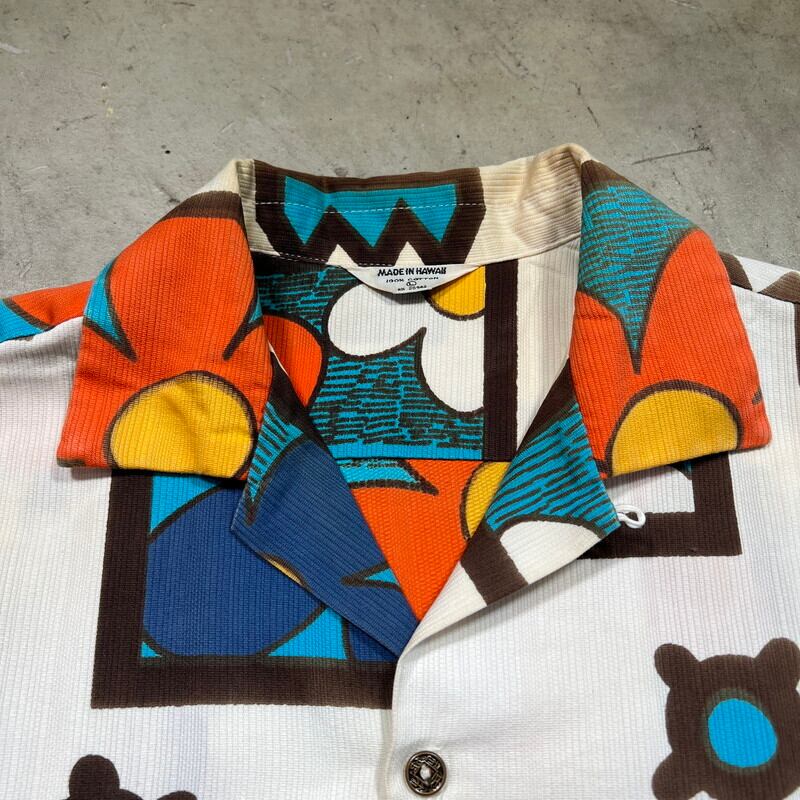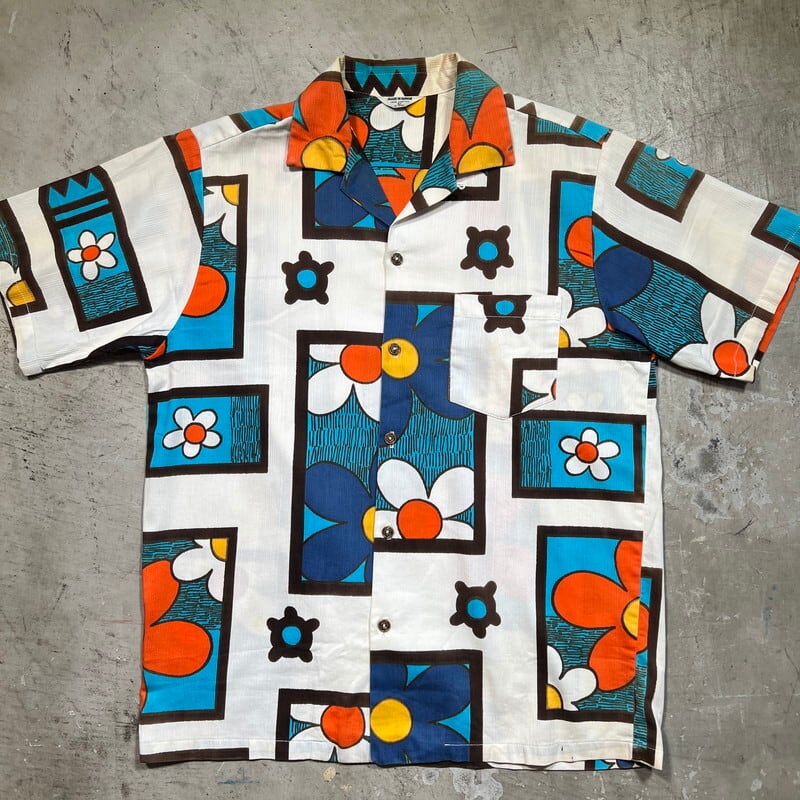 60年代頃のコットンハワイアンシャツです。RN20942と記載がありますが、詳しい製造メーカーは不明です。ループボタンが付くオープンカラー仕様で、古銭の形をしたボタンが使われています。少し畝のような浅い凹凸があるコットン生地にポップなフラワーモチーフがプリントされています。ホヌのようなプリントも入ります。襟や肩回りが若干が若干色褪せており、全体的に薄汚れがございます。目立つダメージは特に無いと思います。着やすいLサイズで需要も高いのでは無いでしょうか。DE LA SOULを彷彿とさせるフラワーモチーフが印象的で色味も派手過ぎないので合わせやすい1着です。こういうポップなデザインのハワイアンシャツは探すと以外と見つからないので、このデザインがお好きな方は是非この機会にいかがでしょうか。