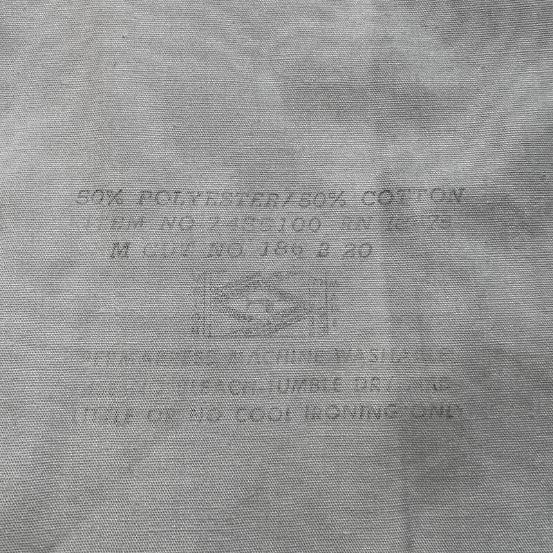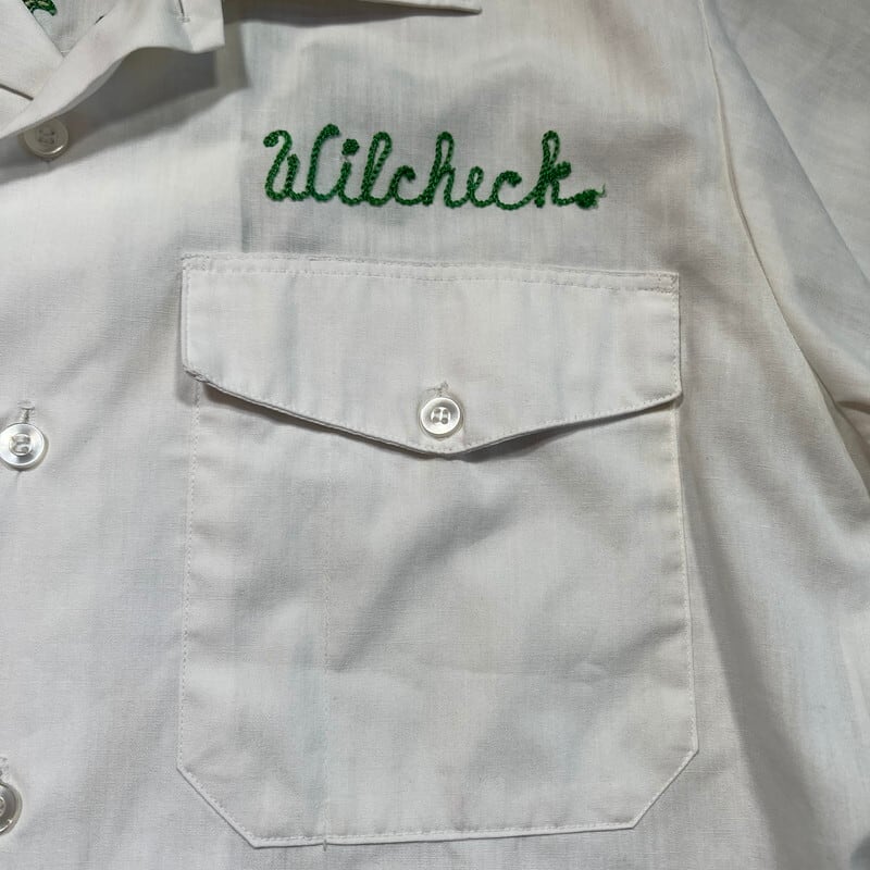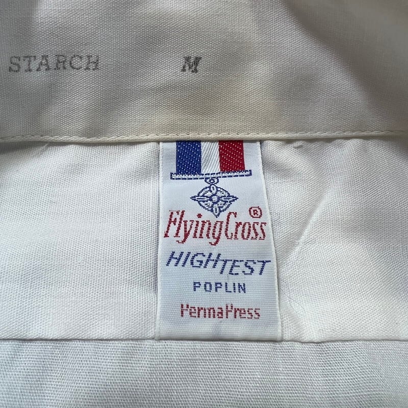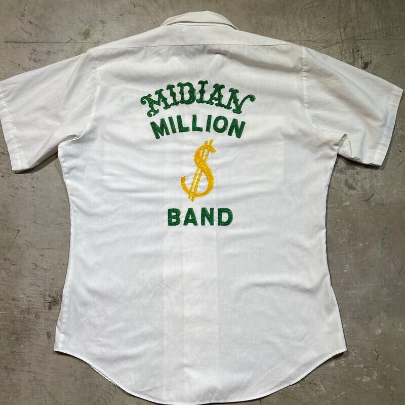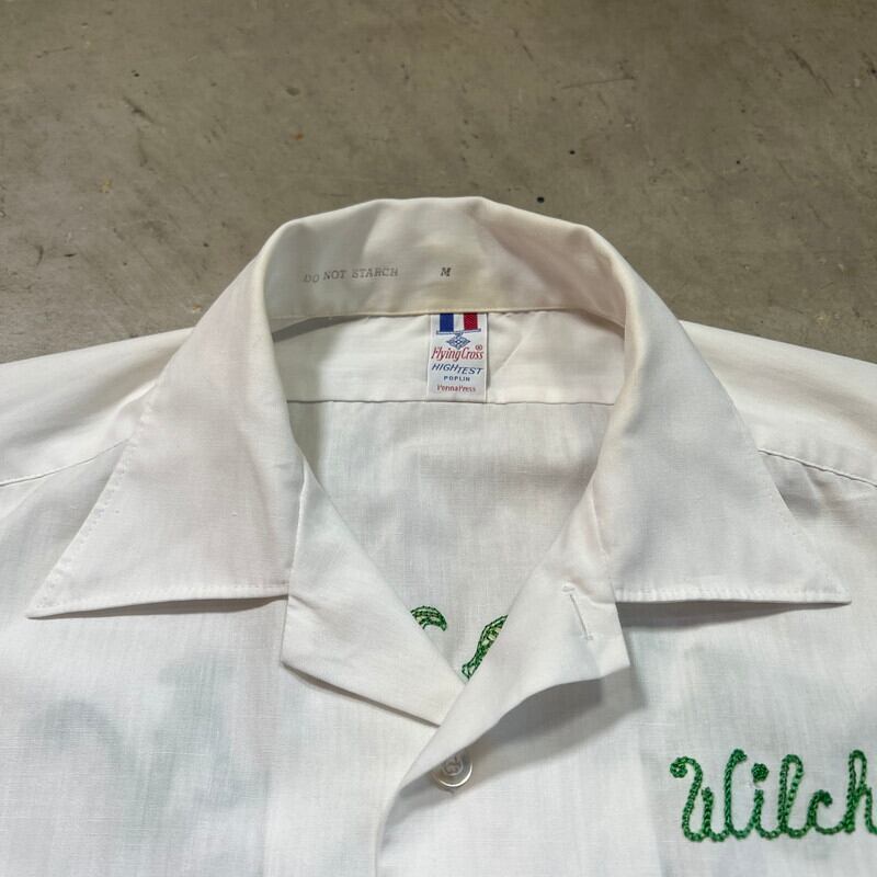 70年代頃のFlying Crossチェーンステッチワークシャツです。民間のミリタリーシャツ等で見る機会が多いブランドです。ご紹介するこちらはフリーメイソンの友愛団体として知られるシュライナーの音楽隊のメンバーシャツです。胸元にはネーム刺繍、背面にMIDIAN MILLION $BANDと刺繍されています。ループボタンではございませんが、開襟スタイルです。裾はボックスでは無くラウンドしており、左すsのにユニオンチケットがプリントされています。非常にシンプルなシャツですが、ホワイトにグリーンとイエローが良く映えるカラーリングでこれからの季節に使い易い1着です。襟元にやや薄汚れがあり、脇付近に極うっすらと変色が見られます。その他小さなシミ等ございますが、ダメージは特にございません。M表記着やすいサイズ感です。フリーメイソン関連のアイテムはコレクターも多いので、お好きな方は是非この機会にいかがでしょうか。