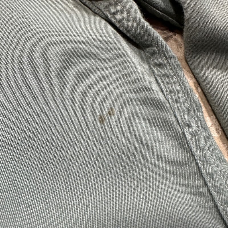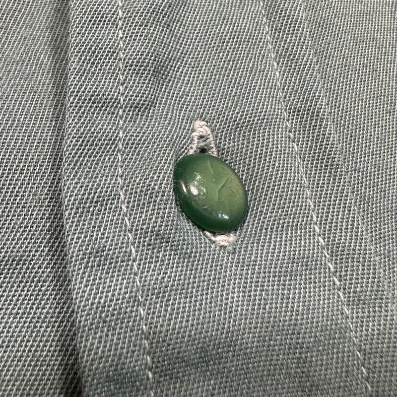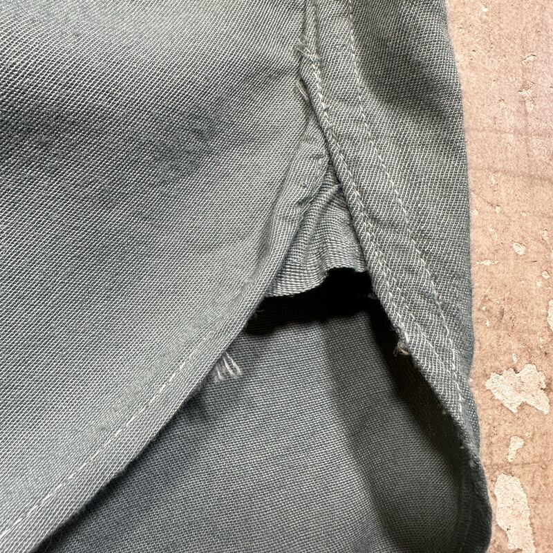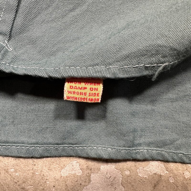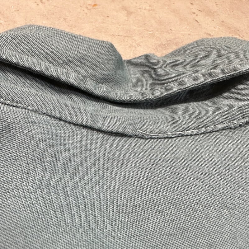 40年代頃のMcGregor FRONTIERS レーヨンギャバジンシャツです。古い筆記体タグが付くこちらは、MADE IN USA表記が入り始めた40年代初頭頃のモデルだと思われます。30年代頃のシャツでも見られる古い小ぶりなベイクライトボタンが使用されています。ポケットはダイアゴナルです。ミシンのピッチ幅も狭く、もしかすると30年代後半に製造されたのかもしれません。台襟付きで、襟先はやや外側向き、サイドにはマチが付きます。細かな擦れや汚れ、毛羽立ちはございますが、年代を考慮すると比較的コンディションは良好かと思います。ボタンの表面に細かなクラックが見られますが、使用に問題は無いかと思います。サイズは16表記でLサイズ相当です。グレーグリーンの様なお色で、江戸時代に使われていた利休鼠という色味が一番近いのかなと思います。シルエットも良くシンプルで使い易いシャツですので、古いワイド目なスラックスと合わせてみても非常にカッコ良いと思います。渋い色味がお好きな方は是非いかがでしょうか。