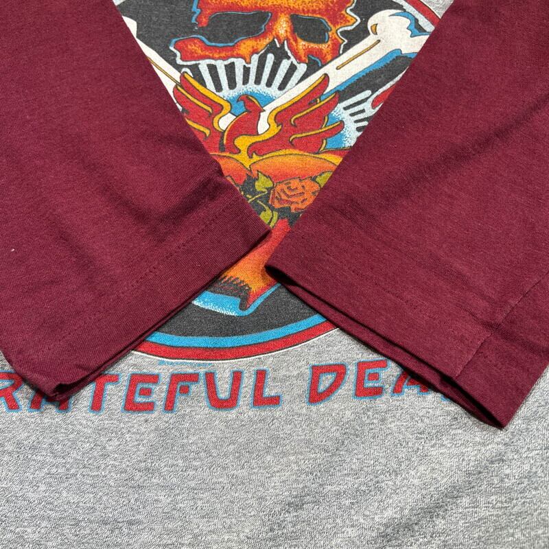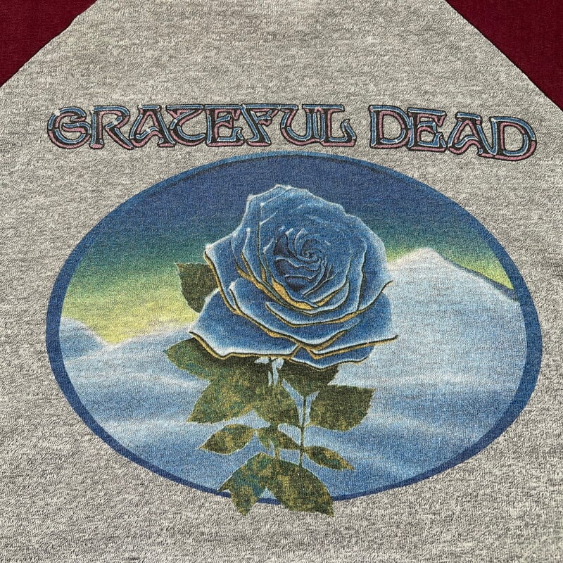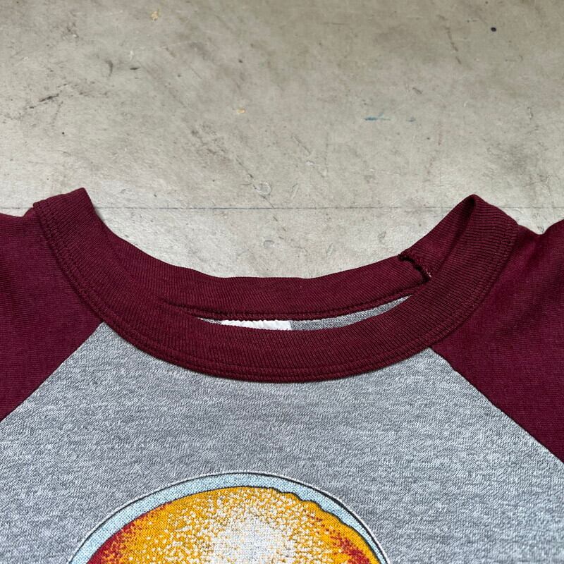 70's GRATEFUL DEADラグランTeeです。1978年12月31日にサンフランシスコのウィンターランドアリーナで開催されたニューイヤーイブコンサートのアイテムで、当時このコンサートではブルースブラザーズやニュー・ライダーズ・オブ・ザ・パープル・セイジが前座で演奏した事が知られています。1928年に創業した由緒あるウィンターランドアリーナを閉鎖するという歴史的なイベントを記念した非常に希少なアイテムです。エンジと霜降りグレーの2トーンで、アートワークはグレイトフルデッドでも多くのデザインを手掛けたスタンリー・マウス&アルトン・ケリーです。1978 Kelly Mouseのコピーライトが入ります。袖先はシングルステッチです。タグはRN46831でSIGNALボディかと思われます。裾付近に細かな汚れや一部生地に引っかきのダメージがございます。引っ掻き部分は裏から薄い接着芯で補強しています。トータル的にはコンディションは良好かと思います。表記XLサイズ(着用感はL)というのも嬉しいポイントです。グレイトフルデッド物でも特に70年代頃のアイテムはなかなか見つかりづらいと思います。この手のアイテム海外での評価も非常に高く、特にサイズが大きい物となるとレア度も高くなります。色味も合わせやすくオア勧めです。デッドヘッズの方は是非コレクションに加えてみてはいかがでしょうか。