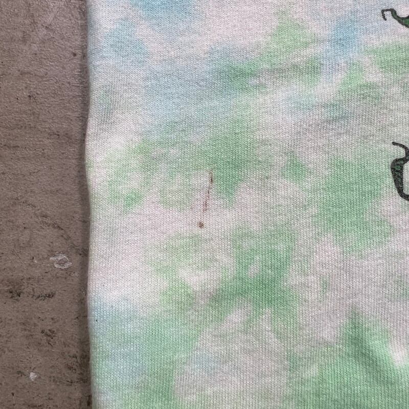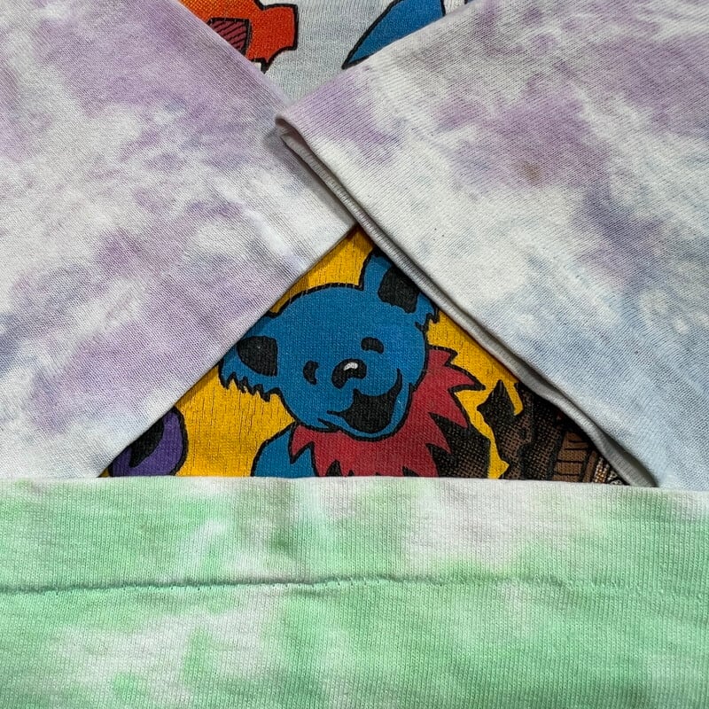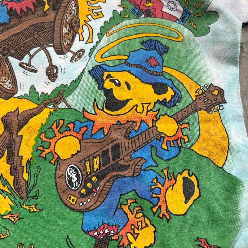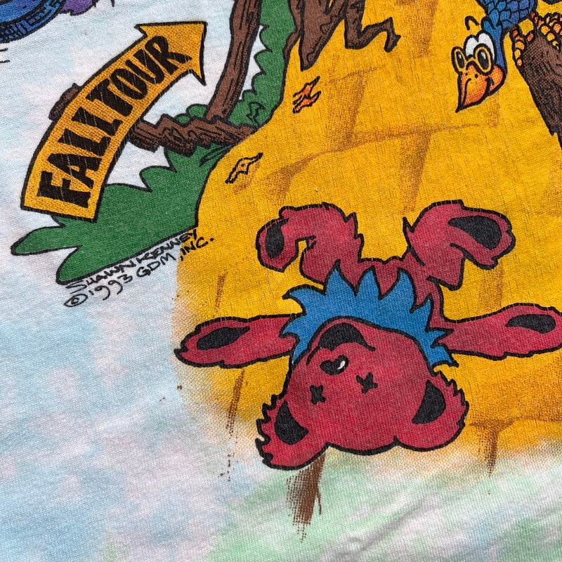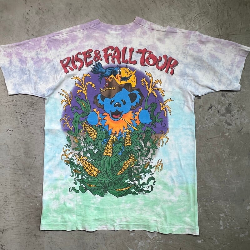 90年代のGRATEFUL DEAD RISE&FALL 1993ツアーTeeです。フロントにはFALL TOUR に向かうベアたちがポップに描かれており、背面は秋らしくスカルを模したトウモロコシとベアが描かれています。LIQUID BLUEボディでタイダイ染めされています。袖、裾共にシングルステッチで、1993年のコピーライトが入ります。アートワークはSHAWN KENNEY氏が手掛けています。首元にうっすらと汚れが見られます。背面左脇腹付近に小さな汚れがございます。その他気になるダメージ等はございません。Lサイズですので程よくゆったりと着ていただけます。色のバランスも良く申し分ないデザインだと思いますので、お好きな方は是非この機会にコレクションに加えてみてはいかがでしょうか。