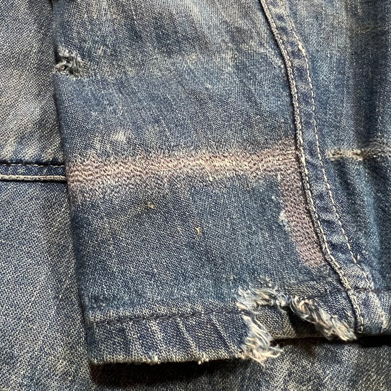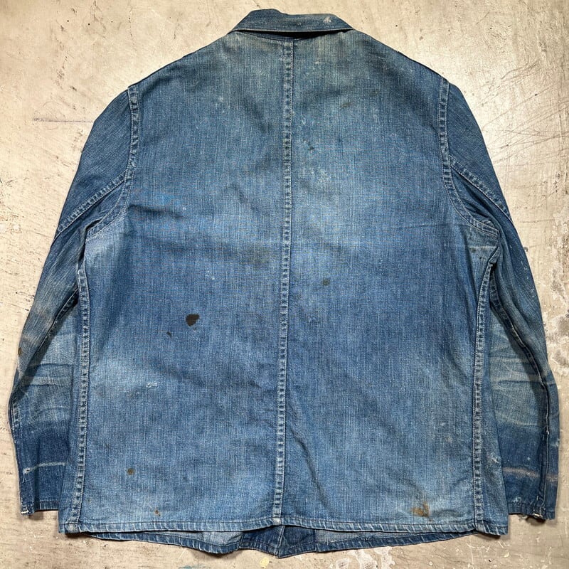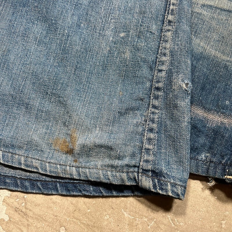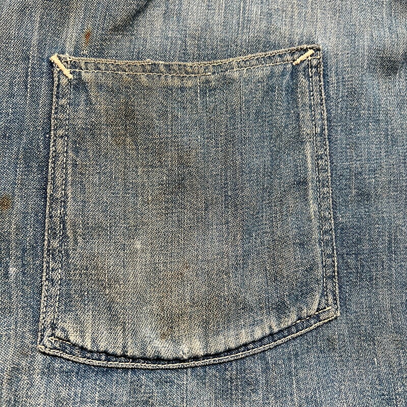 40年代頃のUnknown デニムカバーオールです。タグ等欠損の為製造元は不明ですが、月桂樹ボタンが付く大戦モデルと呼ばれるアイテムです。ライトオンスデニムが使用され、フロントは4つボタンに2ポケットです。ご覧の通りボタンの合わせが逆となっており、肩から胸にかけてダーツが入りますのでレディース向けに作られていたのかもしれません。古い時代の粗い色落ちが見られ、袖のハチノスはなかなかの見ごたえです。小穴やリペア、袖先のダメージなど決して良いコンディションとは言えませんが、醸し出されるオーラは魅力的で古いワークウェアがお好きな方には刺さるのでは無いでしょうか。レディース合わせですが、身幅は充分あり、170cm70kgのスタッフがTシャツの上から羽織って丁度良いサイズ感でした。しいていうなればアームホールや袖がやや細目(カバーオールというよりはシャツに近い)ですので、肩や腕回りががっしりした方には不向きかもしれません。着丈も短めでこのシルエットがお好きな方は多いと思います。年々古い年代のカバーオールは見つかりづらく価格も高騰していますので、サイズ感の合う方は是非この機会にいかがでしょうか。