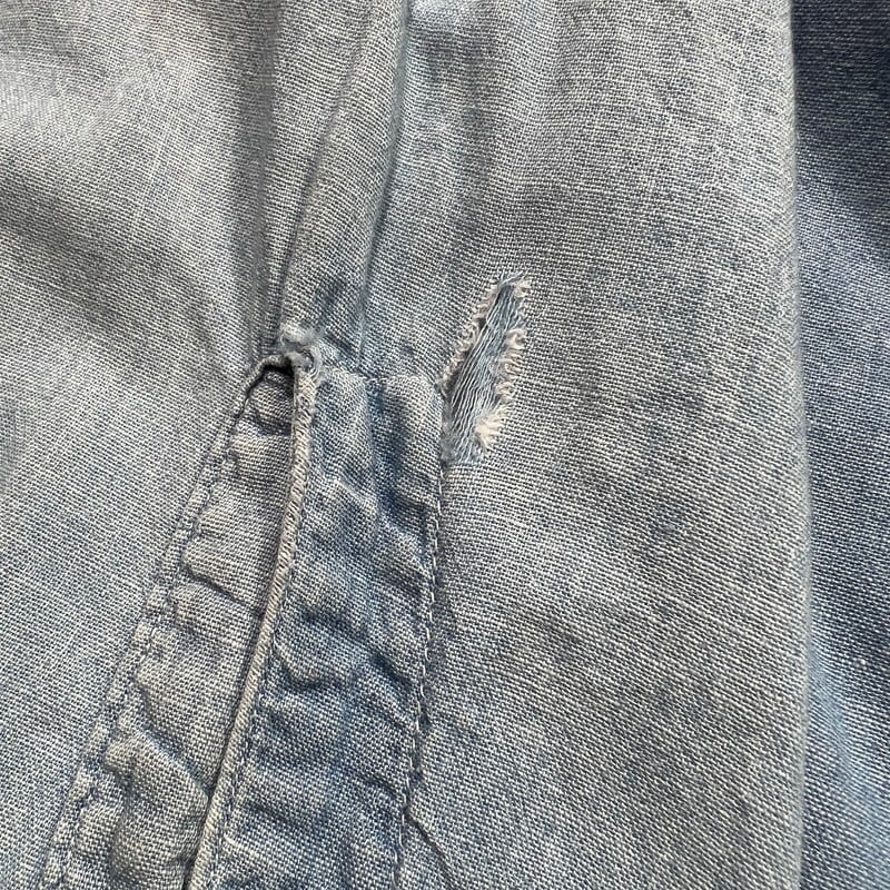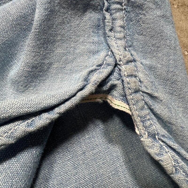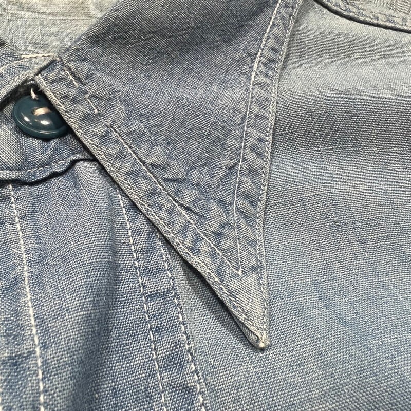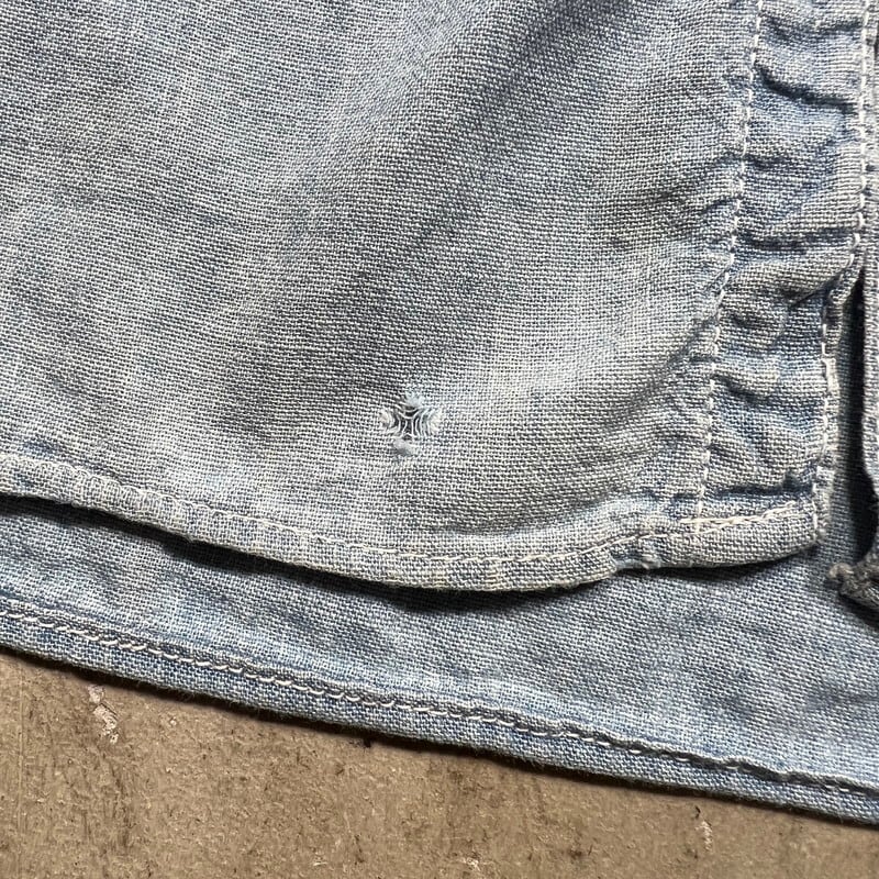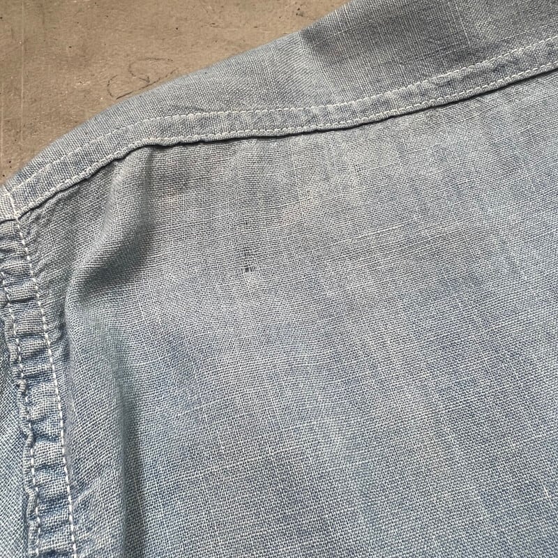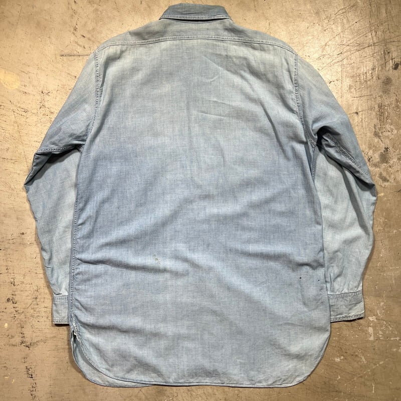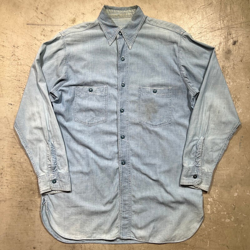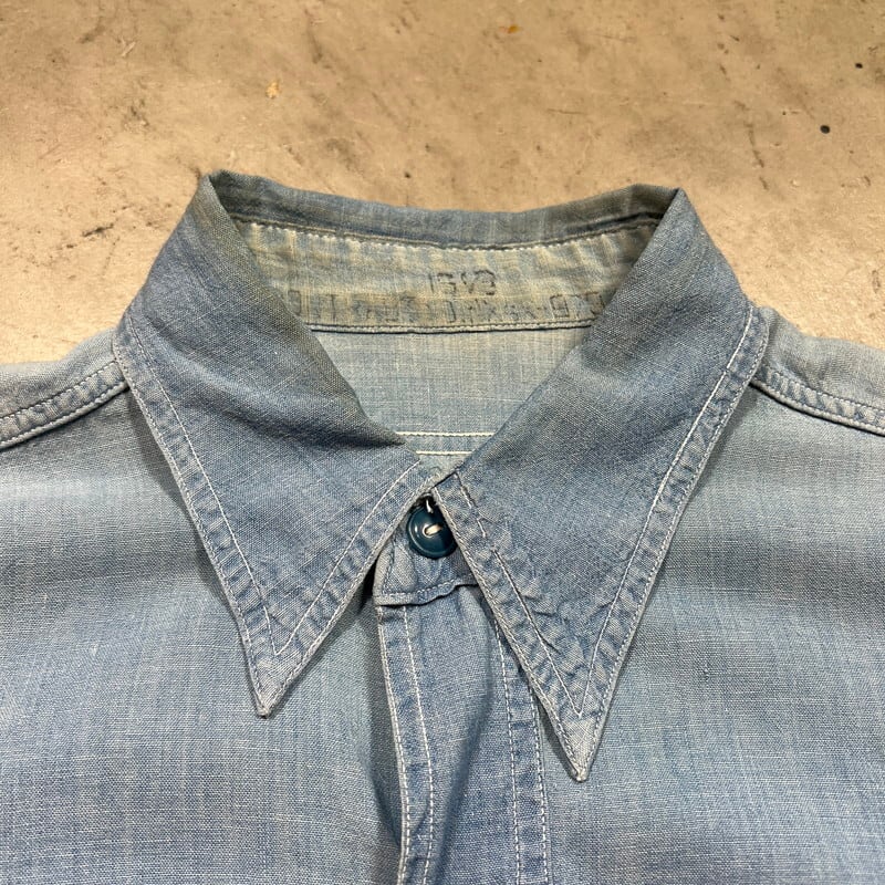 40年代頃のU.S.NAVYシャンブレーシャツです。台襟仕様で襟はダブルステッチで縫製された個体です。ボタンは樹脂製のオーバルボタンで、左袖のみ似たタイプのメタルのオーバルぼちゃんの交換しています。この年代のシャンブレーシャツではコントラクトナンバーが消えてしまっている物が多いですが、NXsx表記がかろうじて読めるオリジナルの官給品となります。サイドはグリーンのセルヴィッジ付きのマチとなっております。首元に汚れがあり、左の胸ポケットにもうっすらと汚れが見られます。左右の袖にややダメージが有った為薄い接着芯で補強しています。その他袖先に擦れもございます。ややダメージはあるものの年代を考慮すればかなりコンディションは良いと思います。15ハーフ表記でM~L相当です。40年代のオリジナルのシャンブレーシャツはお探しの方も多いかと思います。サイズも良いので是非この機会にいかがでしょうか。