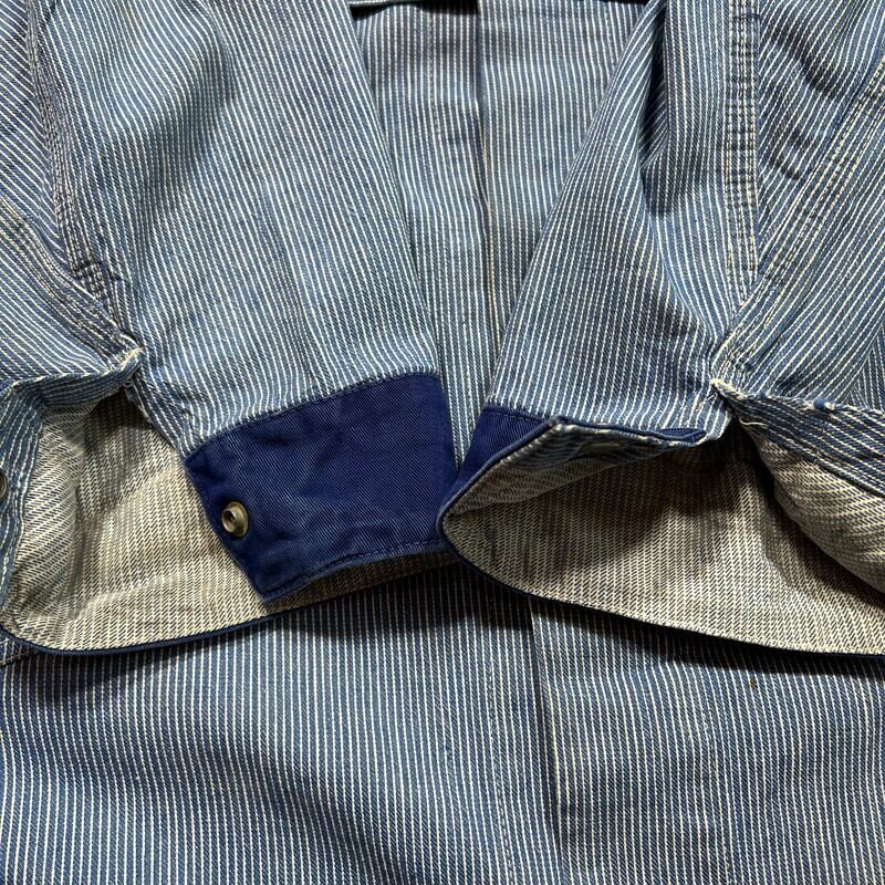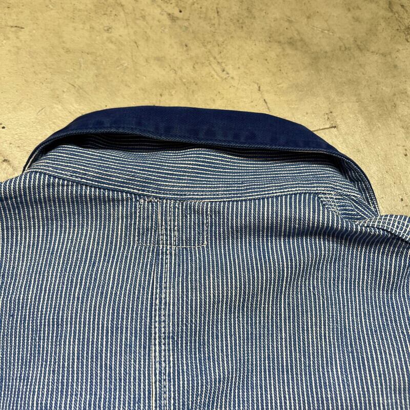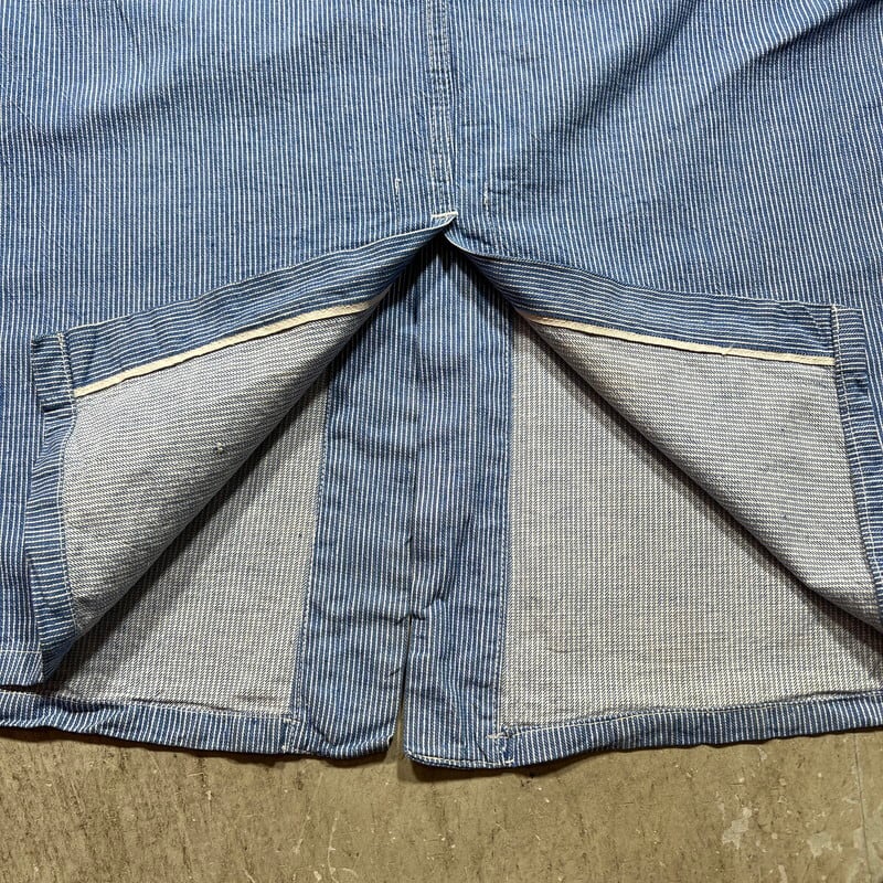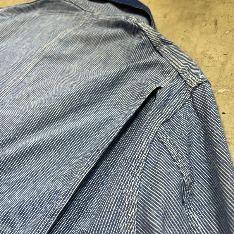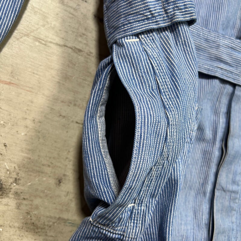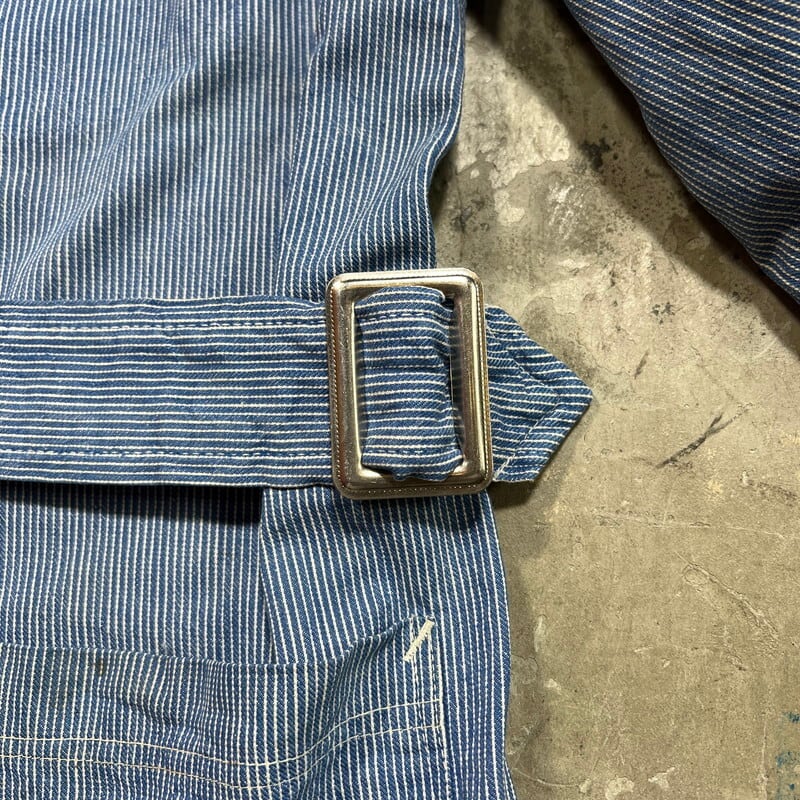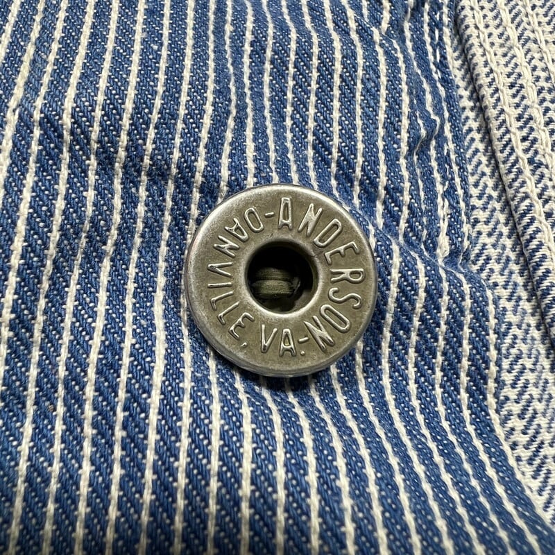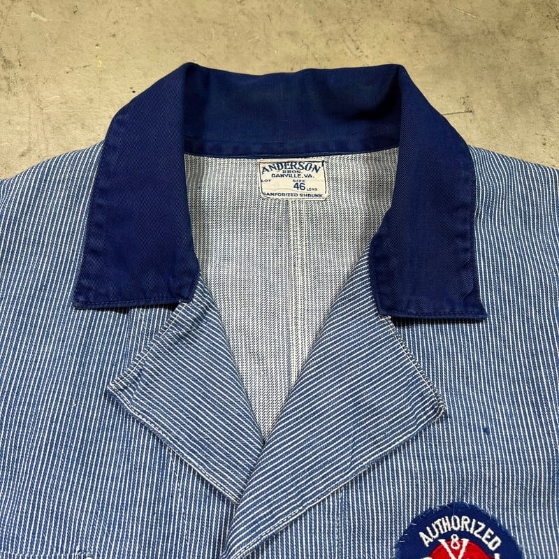 40年代から50年代頃のANDERSON BROS ピンストライプワークコートです。ANDERSON BROSは1900年代初頭にはワークウェアを製造していたとされていますが、創業年などは不明です。ヒッコリーよりも細いピンストライプで襟と袖先はブルーの切り替えとなっています。社名が浮き彫りになったドーナツボタンを使用しており、袖はスナップボタンとなっております。ウエストベルトは背面で元から縫い付けられており、左サイドで絞る事が出来ます。背面センターベント裏にはセルヴィッジが付きます。元はフロント4つポケットにサイドの貫通式ポケットですが、左胸のポケットは綺麗に取り除かれており、そこにGM傘下のBuickのワッペンが手縫いで取り付けられています。細かな擦れや小さなダメージがあり、袖の内側に薄汚れがございます。その他は比較的コンディションは良好です。46 LONG表記で、XL相当のゆったりとした大きさです。古い年代らしいピンストライプの2トーンカラーがお好きな方も多いのでは無いでしょうか。ワークウェアコレクターの方は是非この機会にいかがでしょうか。