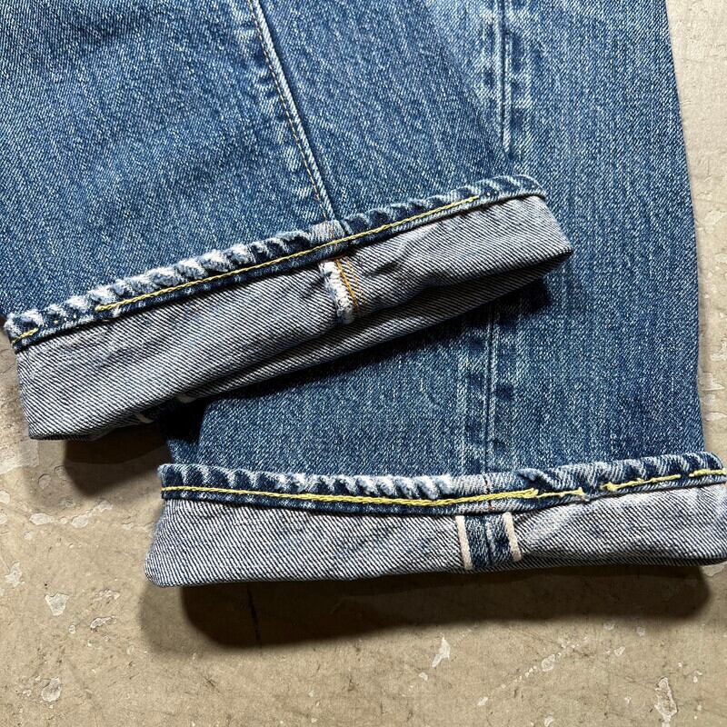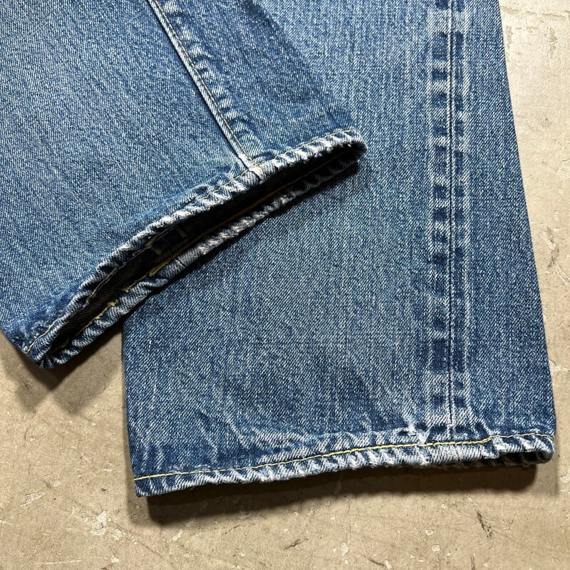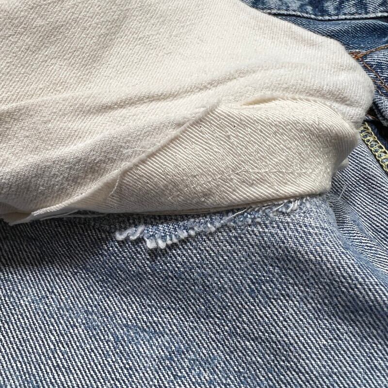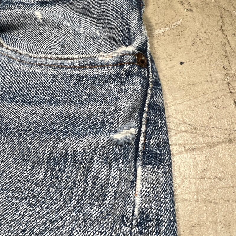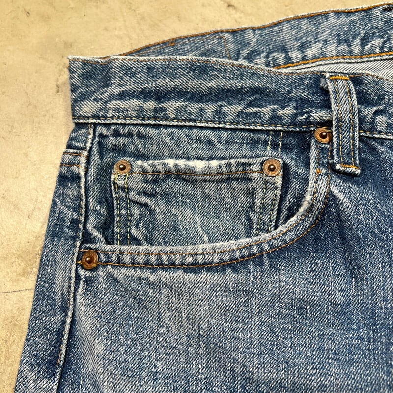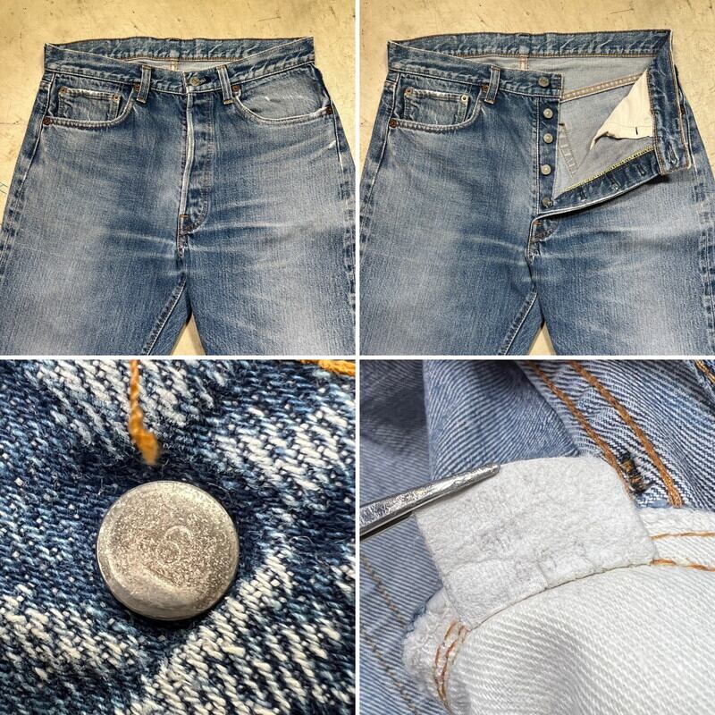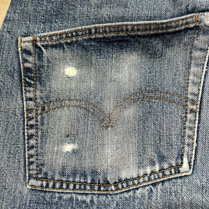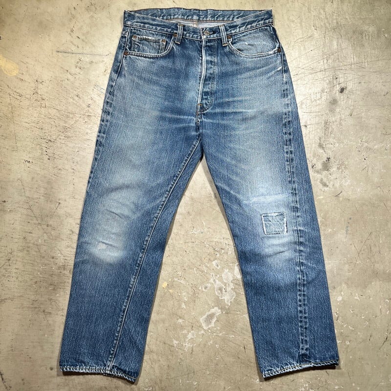 70年代頃のLevi's501デニム66前期モデルです。フロントトップボタン裏刻印6、ウォッチポケット裏チェーン、バックポケット裏シングル、スモールe。色は4割程ですが、ヒゲが入りバランス良い色落ちをした個体です。ポケットスレーキ縁、左膝にリペアがございます。左脛には別のデニム生地でリペアされています。ウエストは実寸W32インチですので、男女共に穿きやすいサイズ感だと思います。細かな擦れやダメージはあるものの全体的にはまだコンディションも良いので、これからのエイジングを楽しめる1本です。
