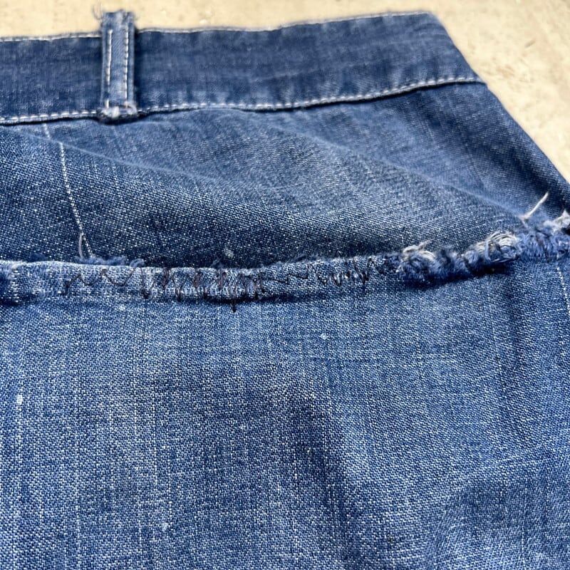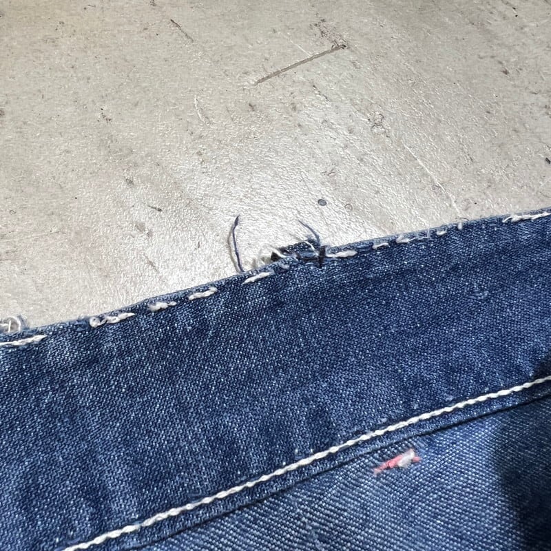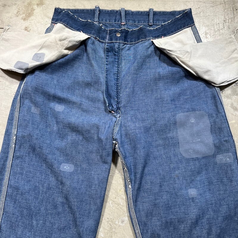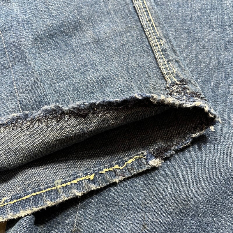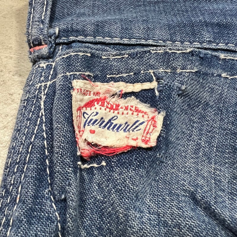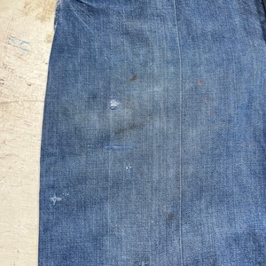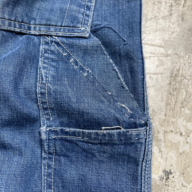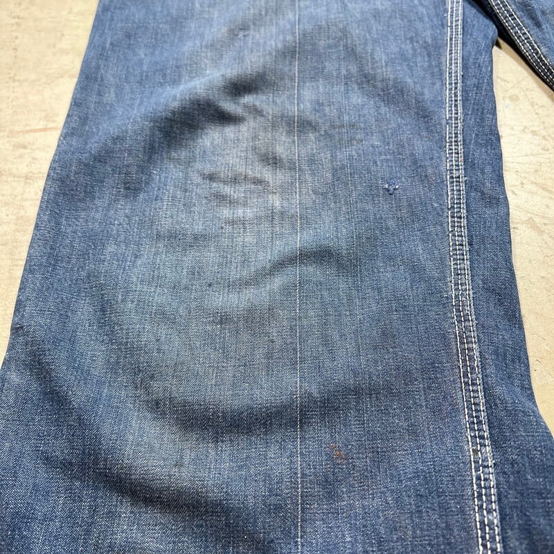 50年代頃のcarharttデニムペインターパンツです。カーハートは1889年、アメリカのミシガン州デトロイトにて設立したワークウェアブランドです。ご紹介するこちらはハートタグと呼ばれる古いタイプのタグが付くモデルです。右のウォッチポケットにタグが残りますが、ダメージが有る為縫い直しされています。トップボタンは筆記体のcarhartt、フロントはTALONのセミオートマチックジッパーが使用されています。バックポケットや裾、背面中央ステッチ付近にリペアがございます。フロントには小さなダメージがいくつか見られます、裏から薄手の接着芯で補強しています。センタープレスの様なラインが前後共に入っています。その他バックポケット等ステッチ飛びなどございますが、薄汚れも相まってヴィンテージワークウェアらしい良い雰囲気です。この年代辺りのカーハートはただでさえなかなか出ないですが、デニムとなるとより一層見つかりづらいと思います。ダメージやリペアはありますが、ウエスト実寸W33インチのゴールデンサイズですのでお勧めです。レングスは80cm以上ありますので、裾のダメージが気になる方はロールアップ、または裾上げしても良いかもしれません。古いカーハートをお探しの方は是非この機会にいかがでしょうか。