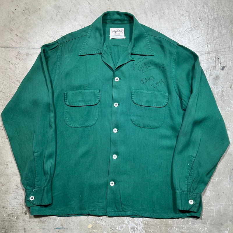50年代頃のManhattanレーヨンギャバジンオープンカラーシャツです。Manhattanは1857年にManhattan Shirt Companyとして設立された大手シャツメーカーです。ご紹介するこちらは、グリーン単色が目を惹く1着で、襟とフラップにステッチの入る袋縫い仕様です。トップはループボタンで開襟スタイルです。ボタンは両袖1個づつ欠損している以外は全て欠損無く揃っています。左胸付近に誰かのサインがマジックで書かれています。左袖や背面ヨーク付近には黒っぽいシミ汚れが大きく入ります。その他にも薄汚れがございます。目立つダメージは特にございません。Mサイズです。汚れやサインが有りますが、これもアジだ!と捉えてくださる方はいかがでしょうか。はっきりとした色味のギャバシャツは使い易いと思いますのでお好きな方は是非。