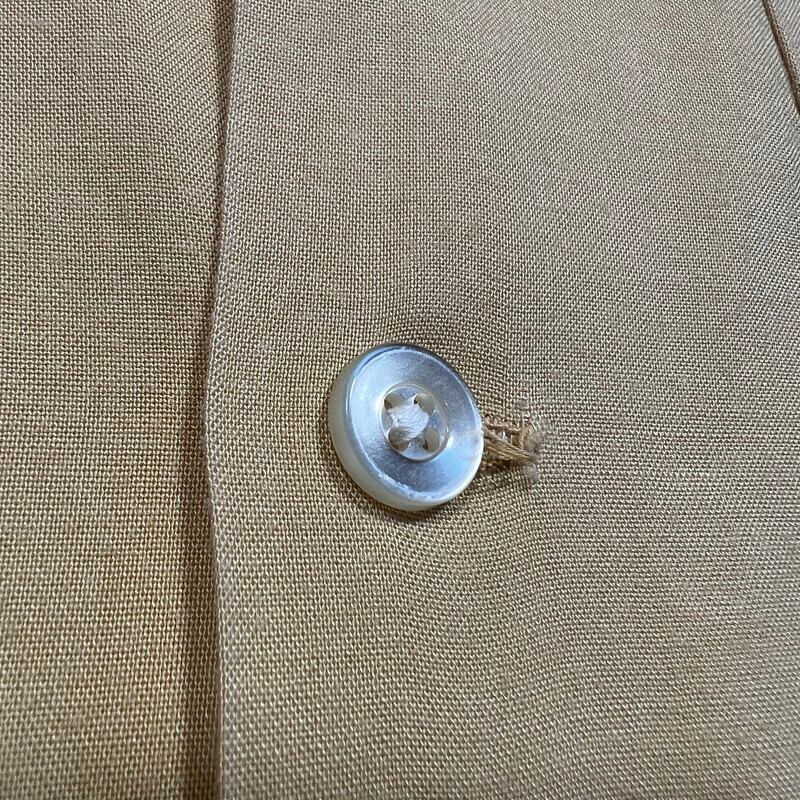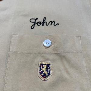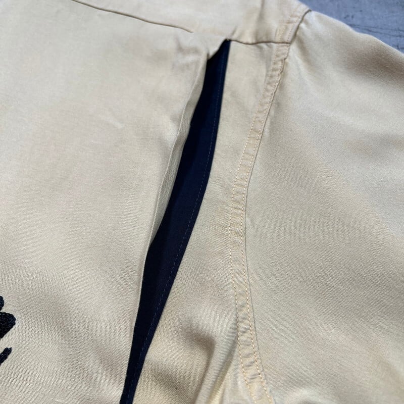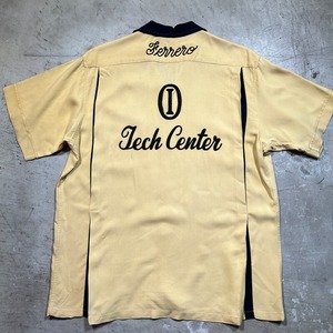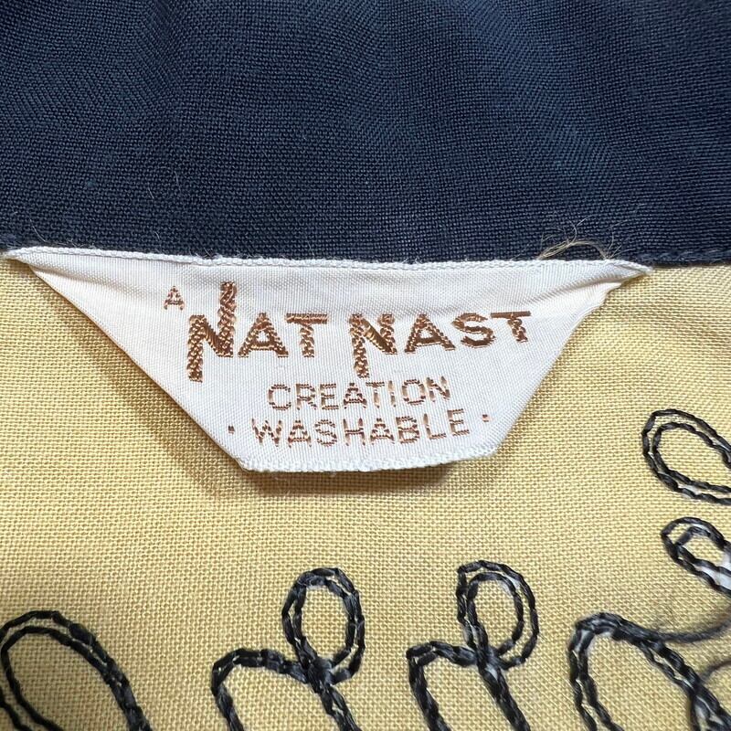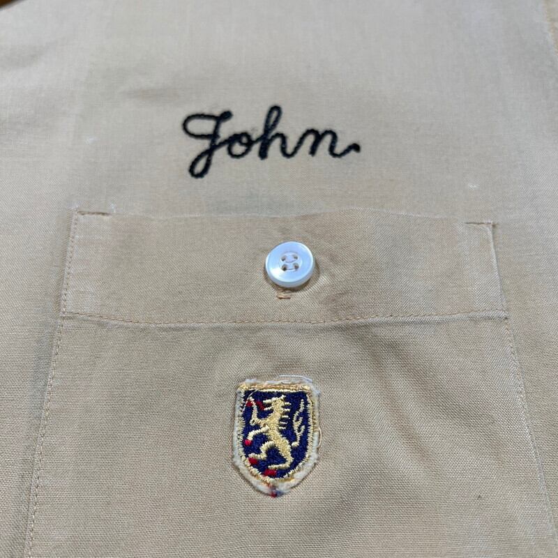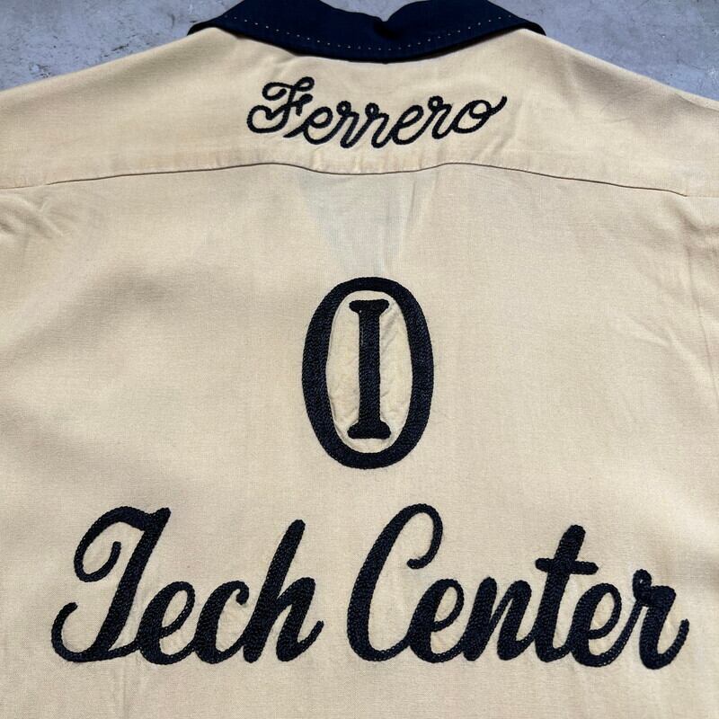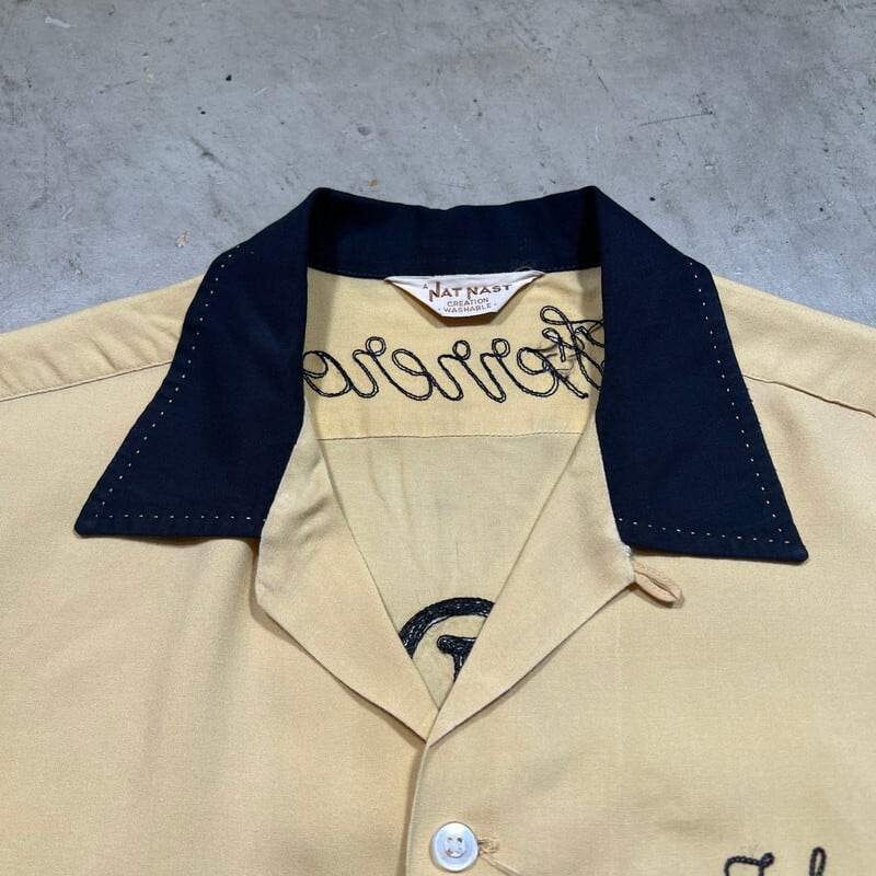 50年代頃のNAT NAST レーヨンボーリングシャツです。NAT NASTは1946年ミズーリ州カンザスシティーで創業したボーリングシャツ等を作り続けている老舗ブランドです。ご紹介するこちらは、チョコレートスプレッドで有名なヌテラなどを製造するFerrero社のテックセンターの刺繍が入った1着です。袋縫いの襟にステッチが施されており、ループボタンの付く開襟仕様です。左胸ポケットに小さなエンブレム型のワッペンが付きます。胸元と背面にはチェーンステッチが施されています。落ち着いた色味のイエローとブラックのコンビが渋さを醸し出しています。生地に若干の擦れ等はございますが、目立つ汚れやダメージは無く非常にコンディションの良い個体です。Lサイズで良い大きさのシャツです。無地のタンクトップにさらっとラフに合わせてみてはいかがでしょうか。