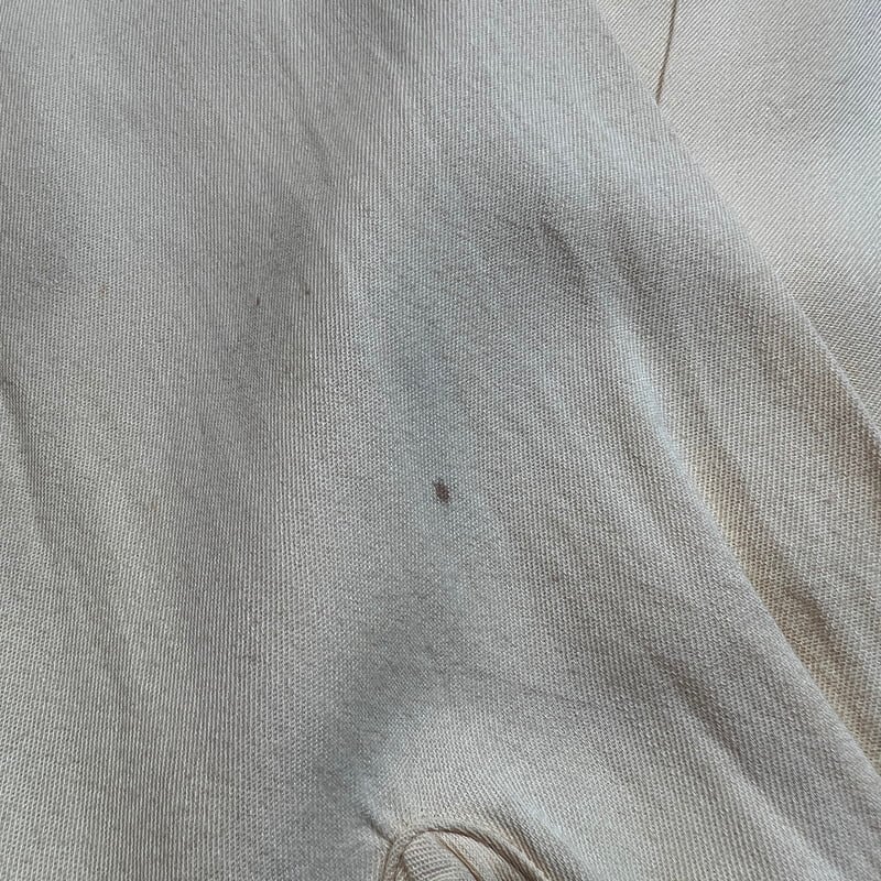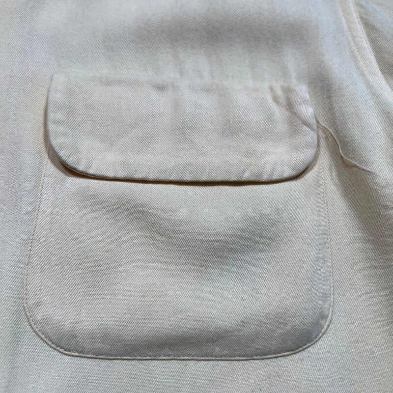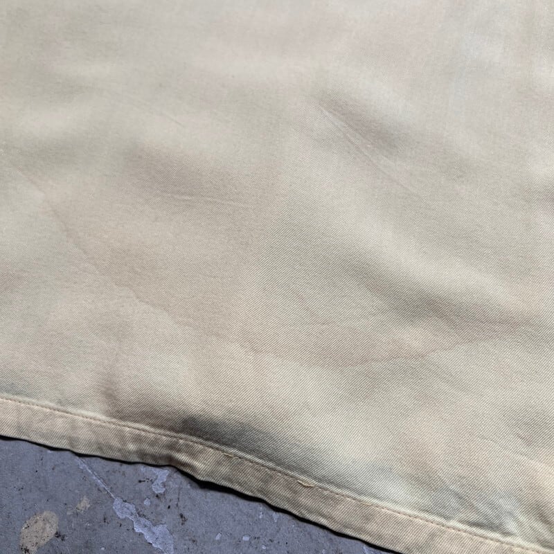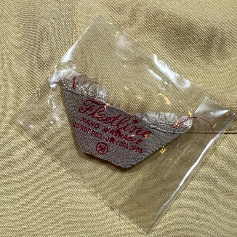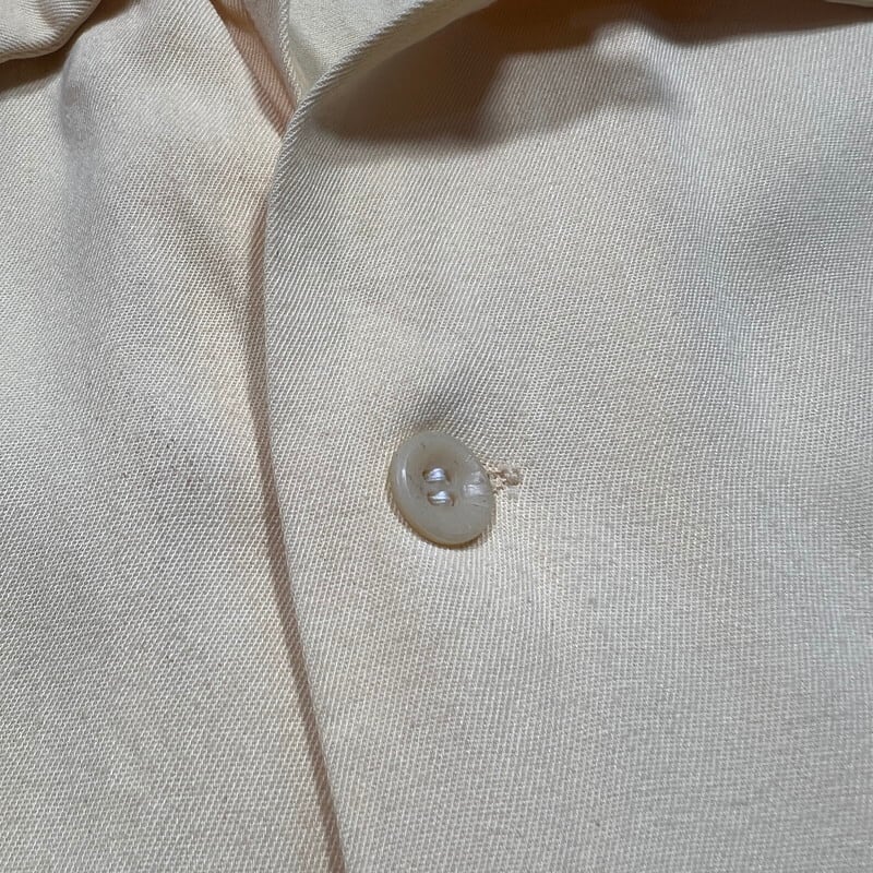 50年代頃のFleetlineレーヨンギャバジンオープンカラーシャツです。ブランドの詳細は不明ですが、ウェスタンシャツ等も手掛けていたシャツメーカーの様です。ご紹介するこちらは、淡い無地のイエローベースで、袋襟にループボタンが付く開襟仕様の1着です。首元にタグが付いておりましたが、取れてしまったので袋に入れて付属いたします。全体的に薄汚れがあり、背面にシミ跡も見られます。ボタンがいくつか取り換えられています。背面にいくつか生地の擦れによる軽いダメージはございますが、その他目立つ大きなダメージはございません。淡いカラーで合わせやすいので一枚あると重宝するアイテムです。お好きな方は是非いかがでしょうか。