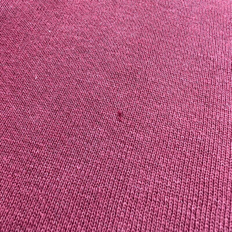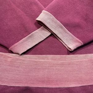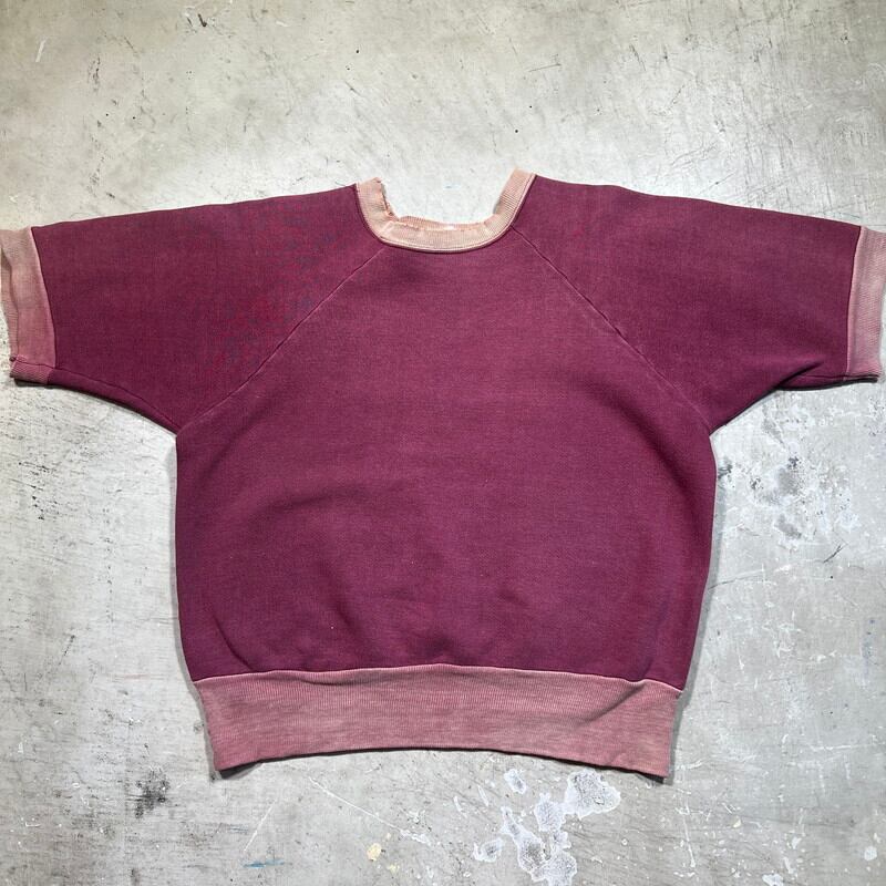 50年代から60年代頃のRusell Southern 2トーンS/Sスウェットシャツです。タグの半分が擦り切れていますが、ラッセルサザン社で間違いないかと思います。元々は同色だったようですが、エンジボディに薄いベージュの様な色味のトリムで経年により2トーンに変化しています。首元は2本針、その他は内縫いで縫製されています。フロントには装飾は無く背面にペンキプリントが入ります。全体的に褪色しており、首リブや、左脇付近等に細かなダメージがございます。M表記ですが、縮みが入っていますので、Sサイズ相当かと思います。身幅はありますが、着丈が短いので女性にお勧めしたい1着です。バックプリントという点もヴィンテージスウェットとしては評価が高いと思いますので、サイズが合う方は是非いかがでしょうか。