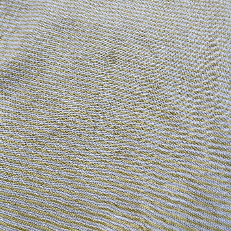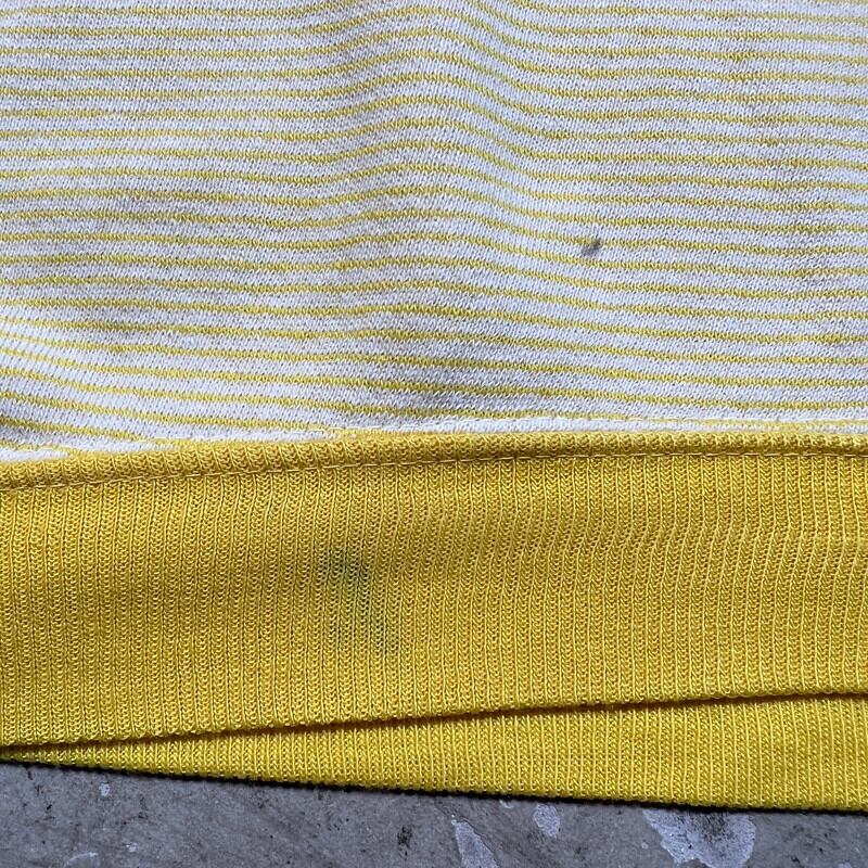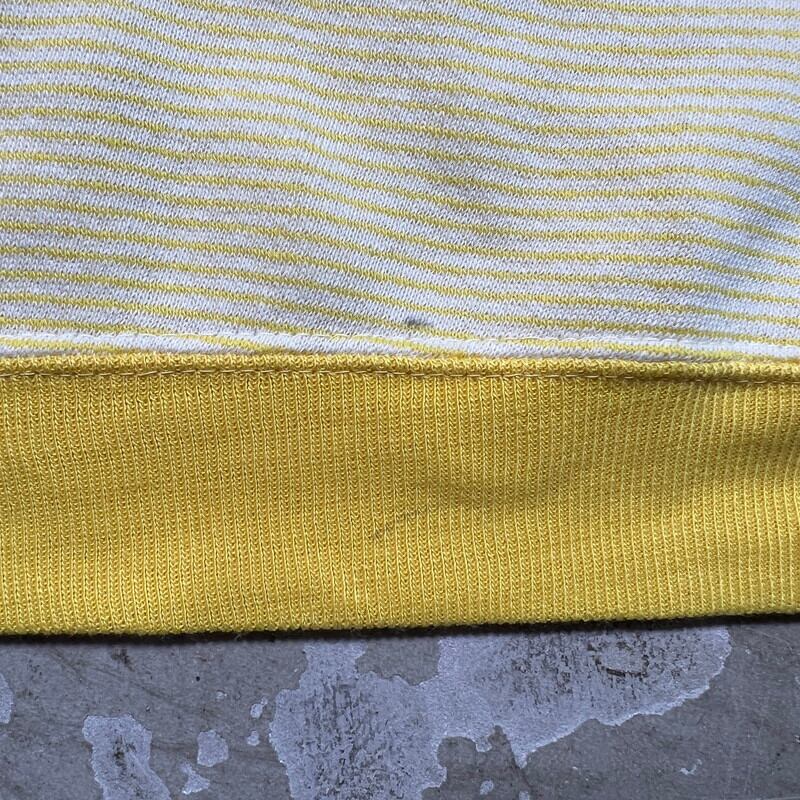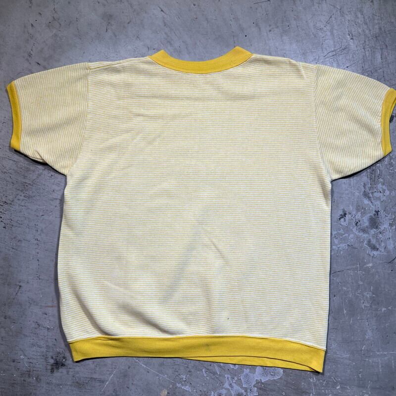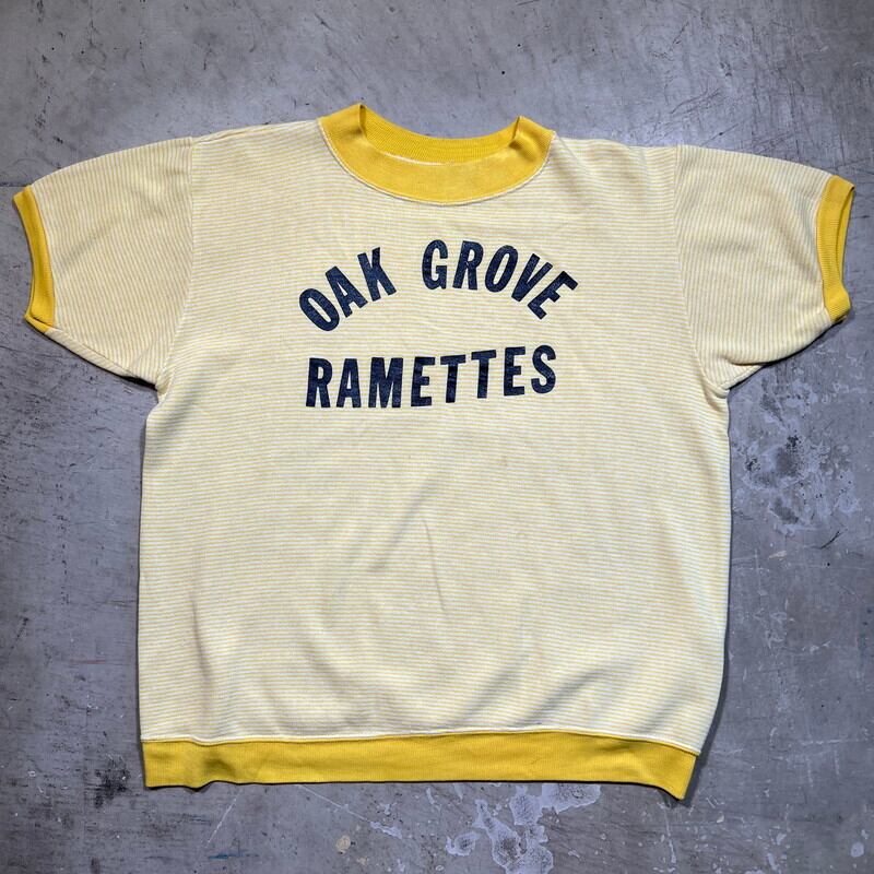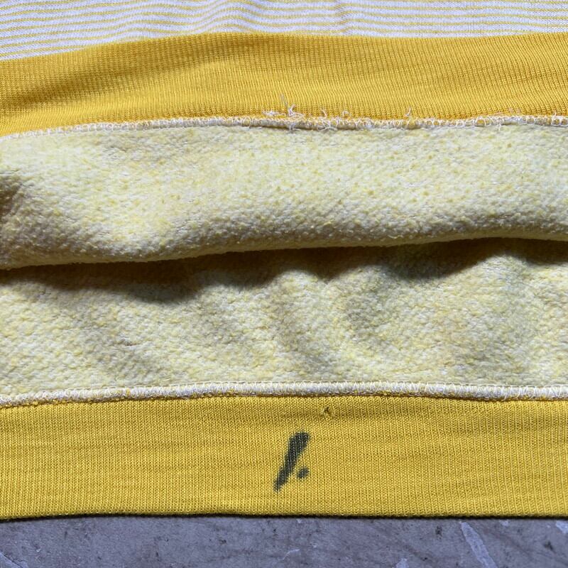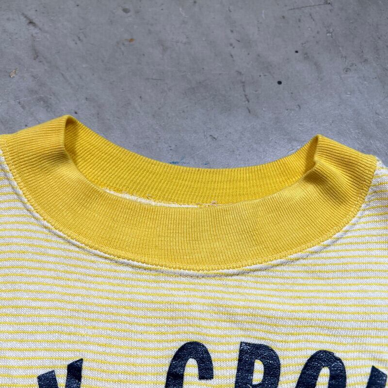 60年代から70年代頃の、UnknownボーダーS/Sスウェットシャツです。タグが欠損していますのでボディメーカーは不明です。様々なブランドが同タイプのスウェットを製造していたようなので、当時のトレンドだったのかもしれません。イエローのトリムに細かなボーダーが入り、フロントにはOAK GROVE RAMETTES とペンキプリントが施されています。もしかするとイリノイ州にある小さな村のチアリーダーのチームで使用されていたのかもしれません。サイズはM相当はあるかと思います。小さなシミや裾リブ内側にインク汚れやピンホール、ステッチ飛び等見られますが、コンディションはまずまず良好かと思います。夏らしい綺麗な色味ですので、デニムにサンダル等と合わせてみてはいかがでしょうか。