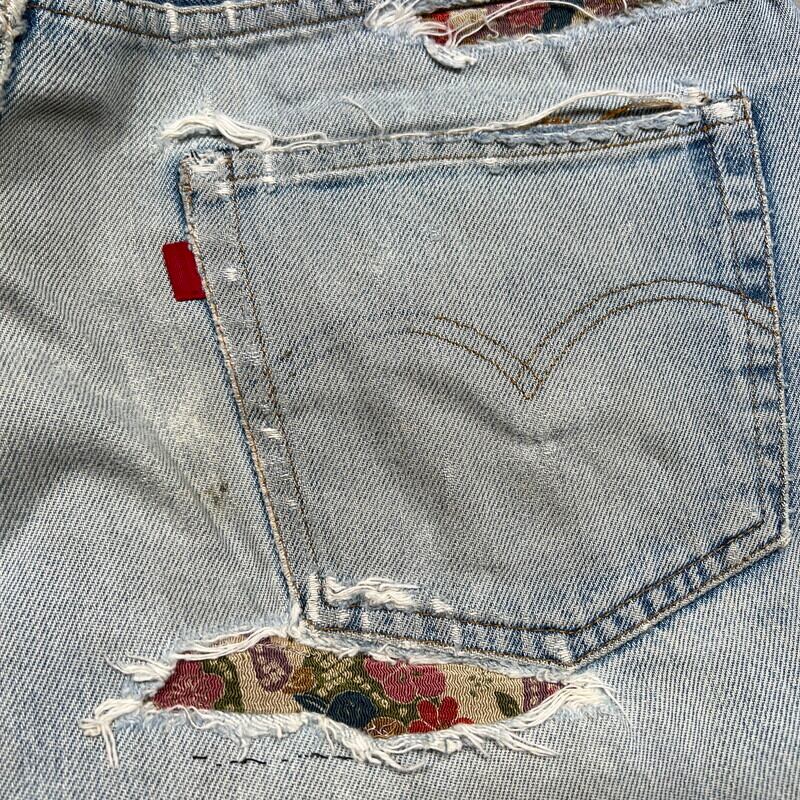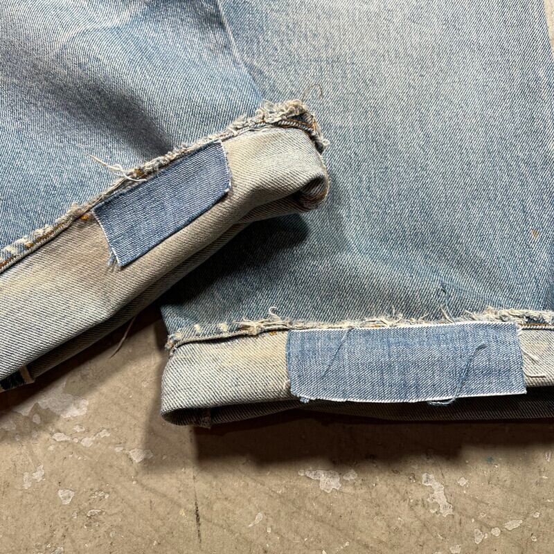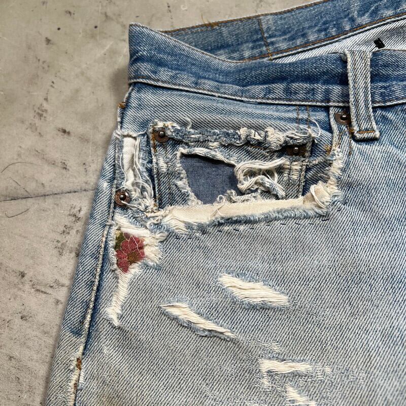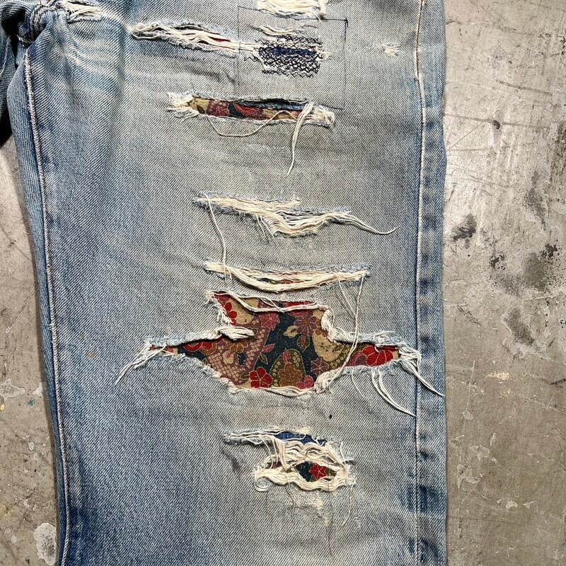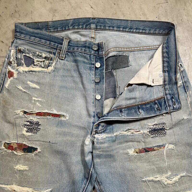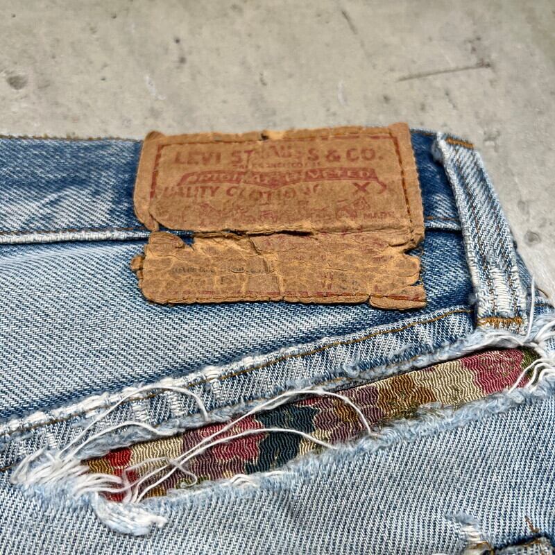 80年代のLevi's 501 デニムパンツです。ボタン裏ドット刻印、縮率10%、プリント赤タブ、スモールe、アウトシームセルヴィッジ。1980年製造の初期の赤耳モデルです。全体的に色落ちし、ダメージが多く入る個体です。ポケット縁やスレーキもダメージがございます。フロントとバックのダメージ箇所は裏から和柄の着物地を当ててリペアされています。裾にもダメージがあり、セルフリペされています。小股部分のダメージはリペアされていません。背面の生地が薄くなっている箇所は薄い接着芯で補強しております。その他ダメージも多いですが、和柄の着物カスタムは久しぶりに見ましたので、なかなか面白い1本だと思います。恐らく全てセルフでリペアされており、直しながら大切に穿かれていたのでしょう。ウエストの表記はW38ですが、実寸はW36インチです。程よくゆったりとしたシルエットですので、ラフな感じにビーチサンダル等と合わせていただくのも良いかもしれません。色味は薄くダメージ+リペア有の個体ですが、サイズ感も良いのでグランジ系がお好きな方は是非いかがでしょうか。