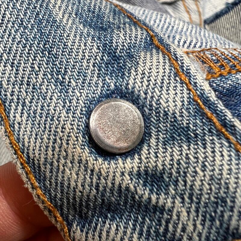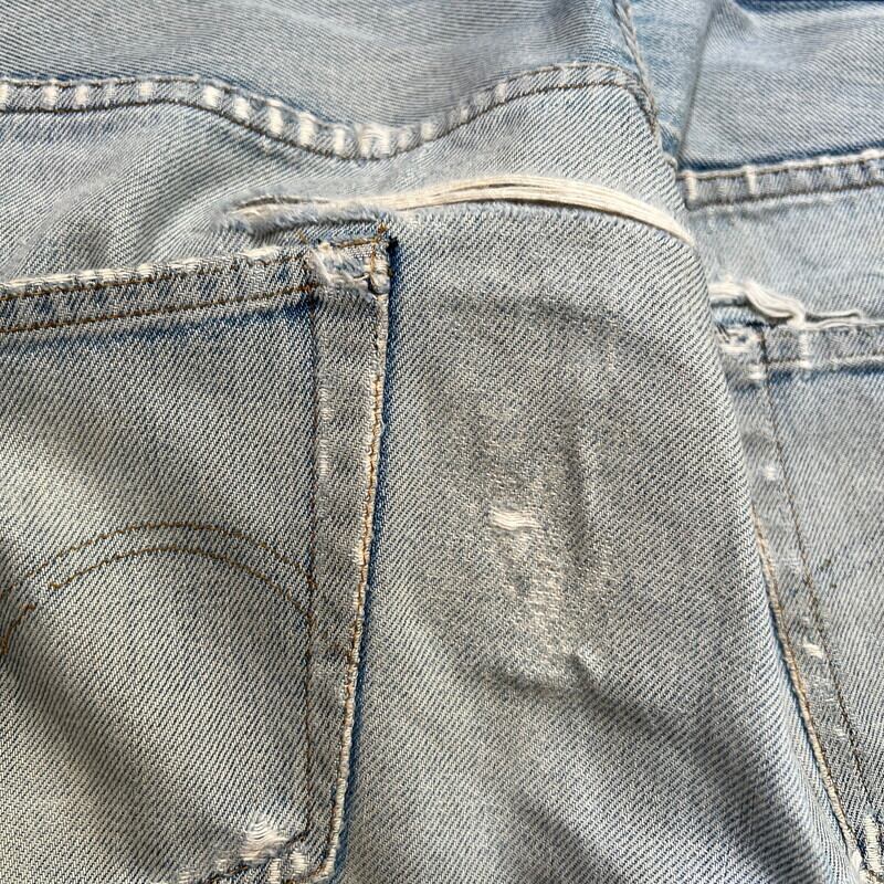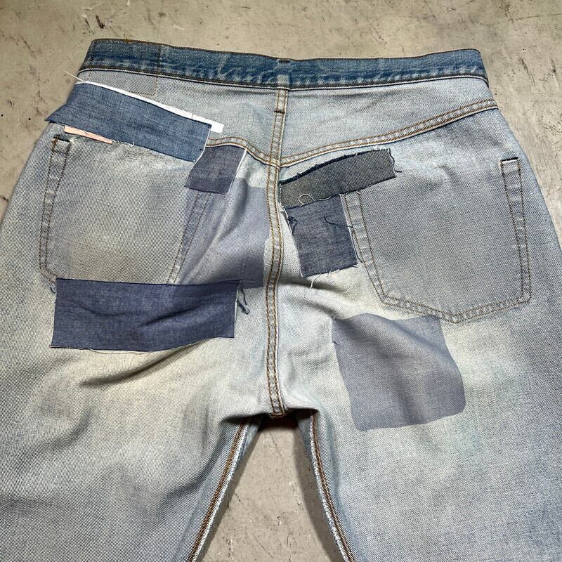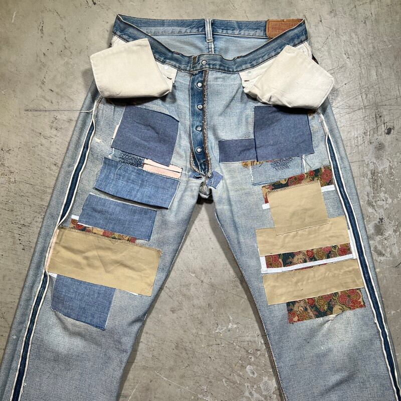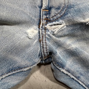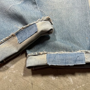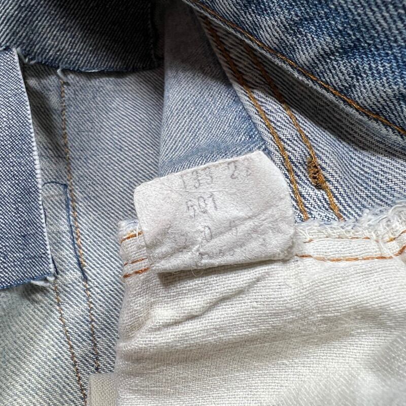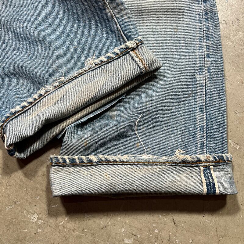 80年代のLevi's 501 デニムパンツです。ボタン裏ドット刻印、縮率10%、プリント赤タブ、スモールe、アウトシームセルヴィッジ。1980年製造の初期の赤耳モデルです。全体的に色落ちし、ダメージが多く入る個体です。ポケット縁やスレーキもダメージがございます。フロントとバックのダメージ箇所は裏から和柄の着物地を当ててリペアされています。裾にもダメージがあり、セルフリペされています。小股部分のダメージはリペアされていません。背面の生地が薄くなっている箇所は薄い接着芯で補強しております。その他ダメージも多いですが、和柄の着物カスタムは久しぶりに見ましたので、なかなか面白い1本だと思います。恐らく全てセルフでリペアされており、直しながら大切に穿かれていたのでしょう。ウエストの表記はW38ですが、実寸はW36インチです。程よくゆったりとしたシルエットですので、ラフな感じにビーチサンダル等と合わせていただくのも良いかもしれません。色味は薄くダメージ+リペア有の個体ですが、サイズ感も良いのでグランジ系がお好きな方は是非いかがでしょうか。