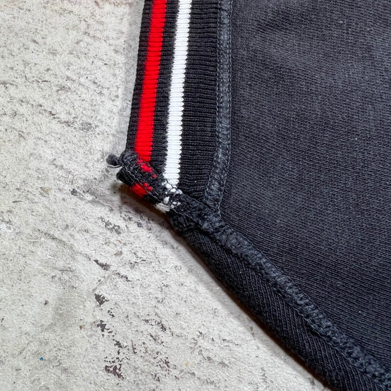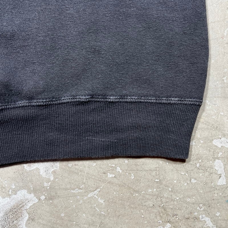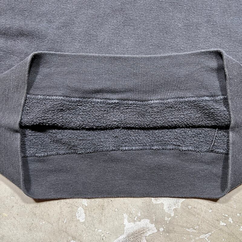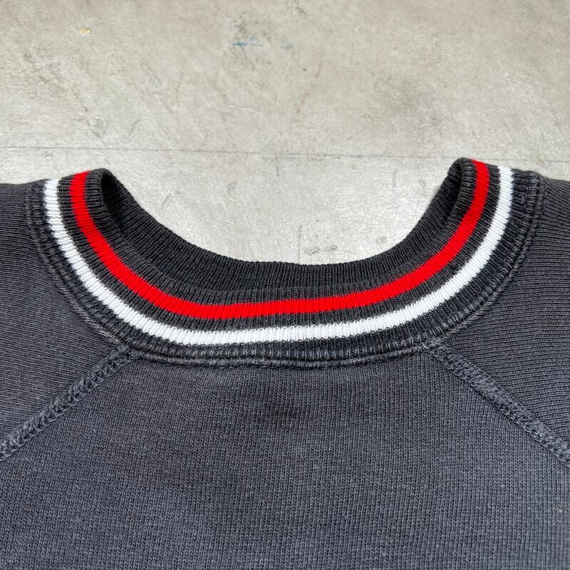 60年代頃のリブライン半袖スウェットシャツです。タグが欠損していますので確実ではありませんが、恐らくChampionのランタグ期で間違いないのかなという印象です。リブに2色のラインが入り、ボディはプリントの入らない無地タイプです。ヴィンテージスウェットでは絶大な人気を誇るブラックカラーで、墨黒っぽくフェードした具合が溜まらない1着です。左肩付近に小穴ダメージがございます。その他擦れ等はございますが、比較的コンディションは良好です。S~Mサイズ相当ですが、生地は柔らかくまだ幾分はスチームで伸ばせるかもしれません。経年を楽しめる希少なブラックカラーですので、お探しだった方は是非いかがでしょうか。