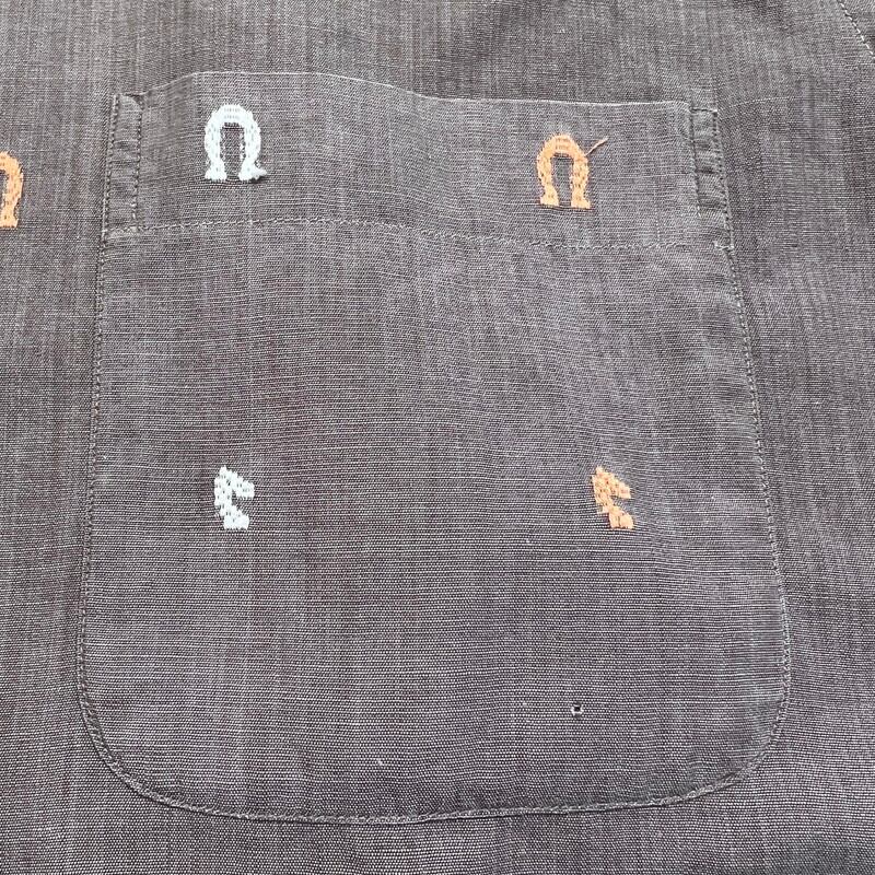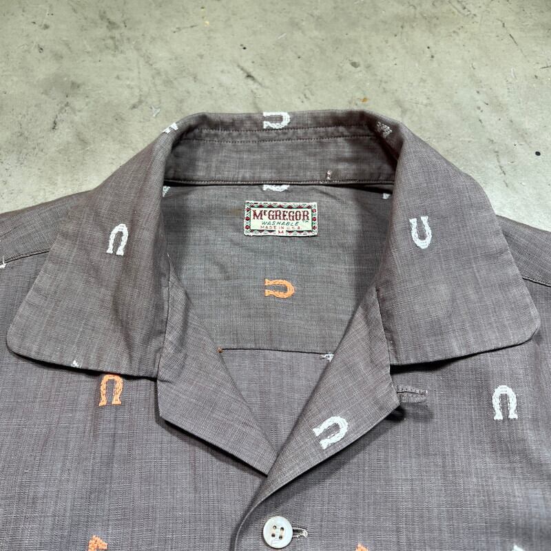 50年代頃のMcGREGOR ンオープンカラーシャツです。McGREGORは1921年に創業した、100年を越える老舗アメリカンカジュアルブランドです。ご紹介するこちらは、チャコールカラーのシャンブレー生地に馬の横顔と馬蹄が2色で刺繍されたデザインです。コットンかと思われますが記載はございません。袋襟ですが襟芯を入れる事が出来るタイプで、50年代後半頃のモデルかと思われます。目立つ汚れはございませんが、首元と胸ポケット、腹部や裾辺り等にいくつか小さなピンホールがございます。その他は比較的コンディションの良い個体です。Mサイズですので、男女問わず着やすいサイズ感だと思います。古いマクレガーをお探しだった方は是非いかがでしょうか。色味も合わせやすくオススメです。