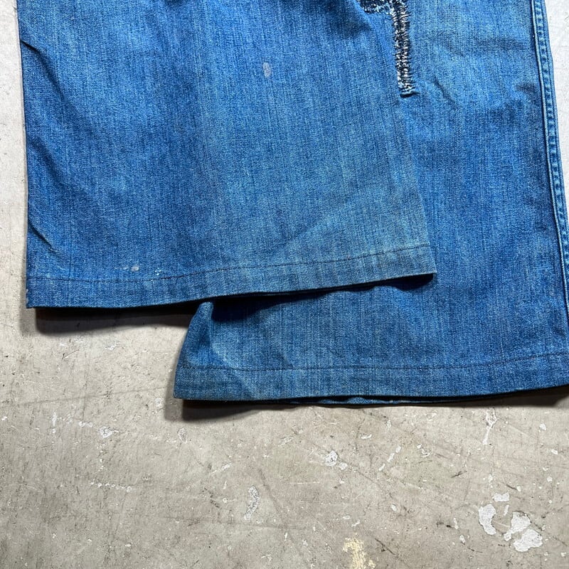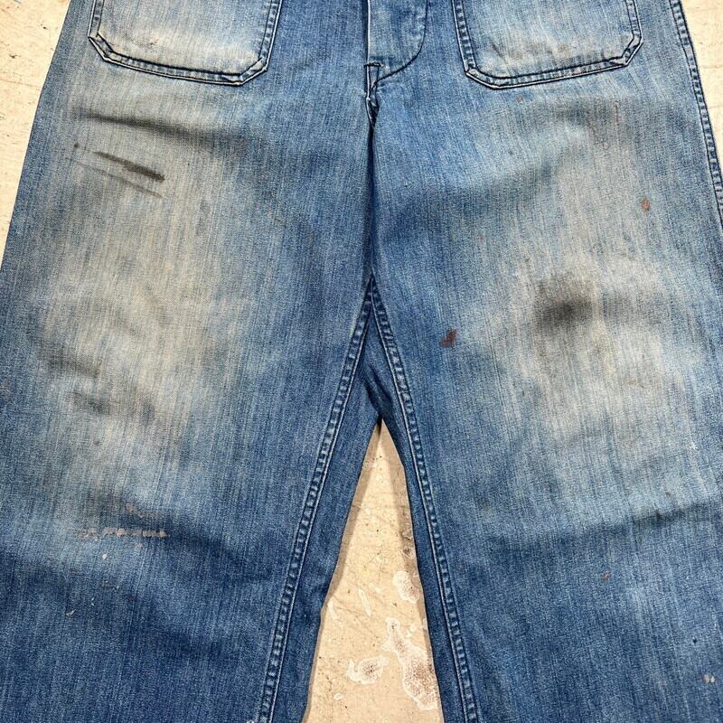 50年代頃のU.S.NAVYデニム、シルエットはフレアタイプです。ズドンとゆったりとしたフレアですが、裾の広がりは緩めですのでバギーパンツの様なシルエットです。全体的に程よい色落ちをしており、ペンキ汚れ等も相まって良い雰囲気の1本です。右足の裾付近とふくらはぎ部分にリペアが3か所ございます。フロントのフライボタンが1つ交換されています。その他は比較的コンディションは良好です。ウエストは実寸でW30インチですので、男女共に良いサイズかと思います。レングスは短めですので、革靴も良いですが、サンダルとの相性も良さそうです。サイズが合う方は是非いかがでしょうか。