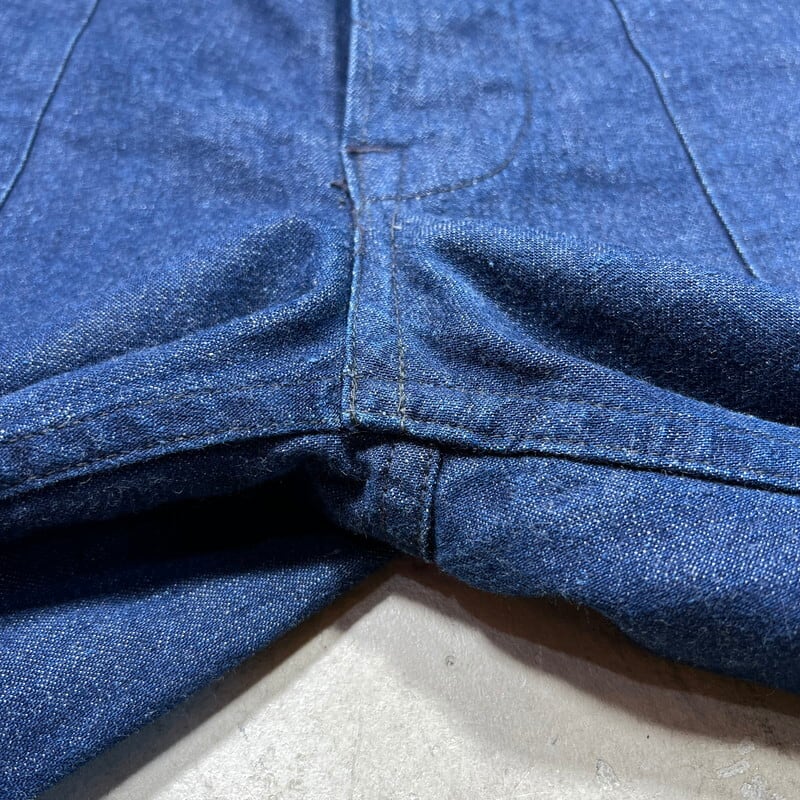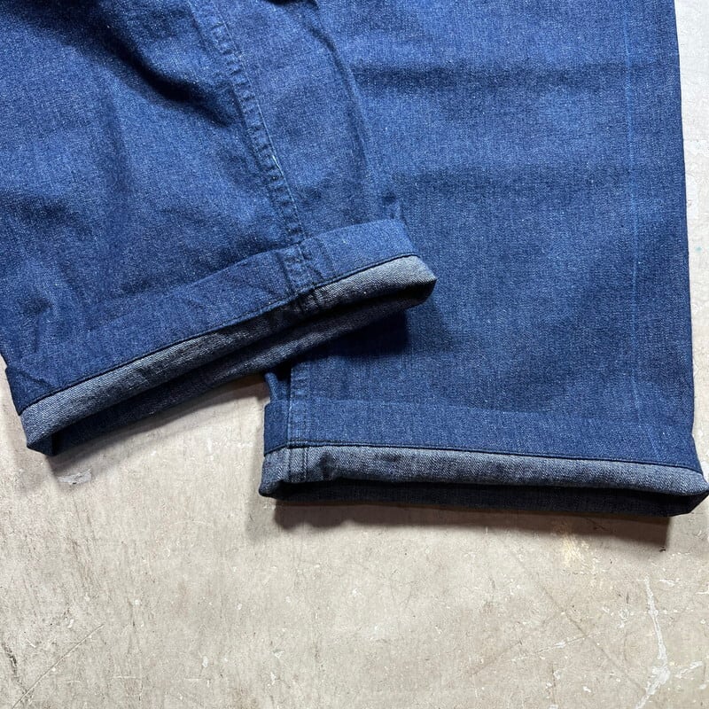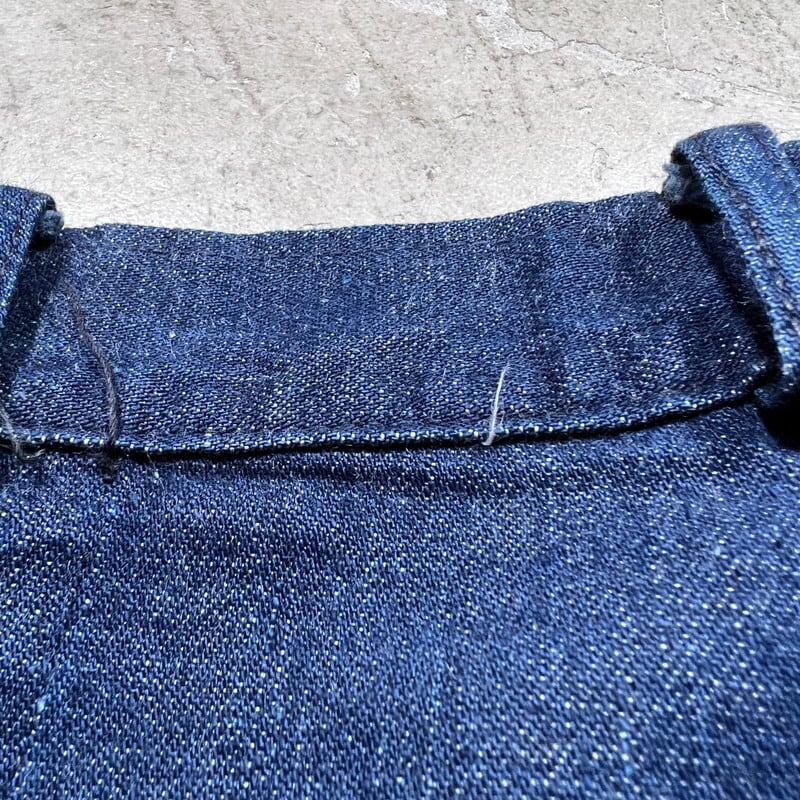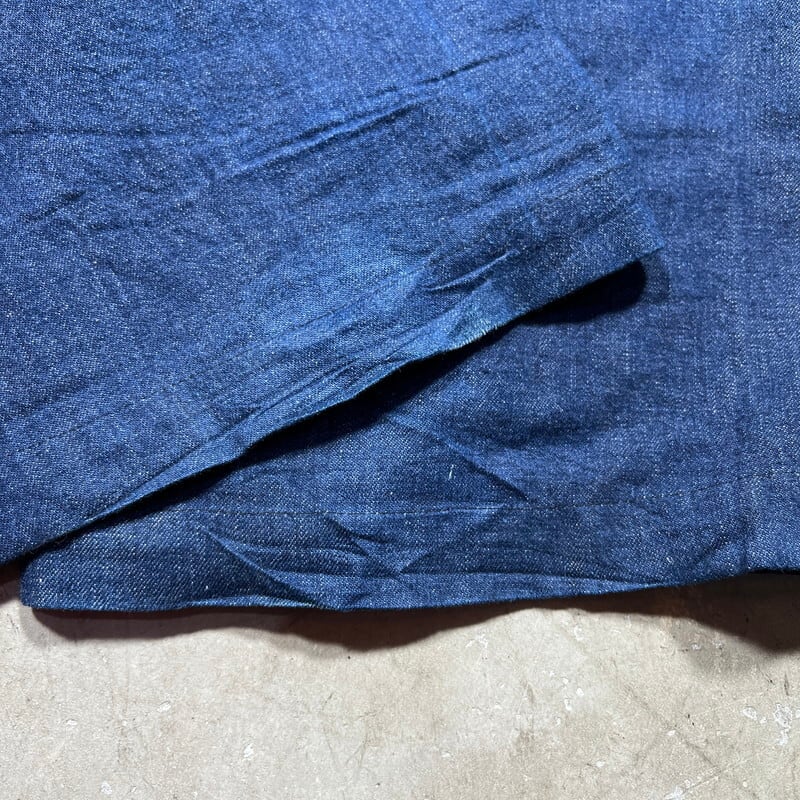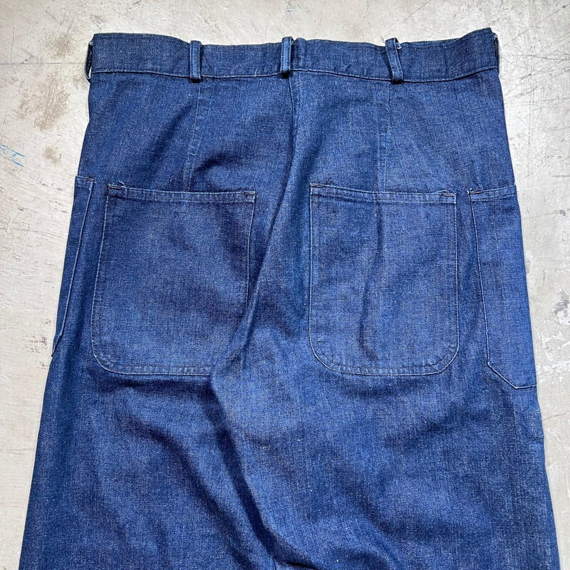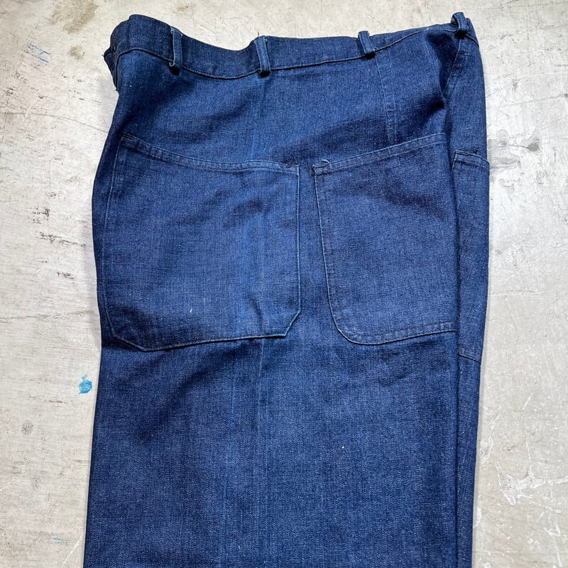 SPECIAL!! 30年代から40年代頃のU.S.NAVY デニムダンガリートラウザーズです。アウトシームの無い通称”巻きパン”と呼ばれる希少な1本です。ワイドでゆったりとしたストレートシルエットで、色残りも8~9割とまさに極上コンディションです。フロントのボタンも欠損無く揃っております。ウエスト背面についていたであろうタグは欠損しています。ウエストのステッチが一部飛んでいます。右のハンドポケット下にリペアが1箇所ございます。裾にはロールアップをしていた跡と若干色落ちが見られます。ウエストは実寸でW34インチとゴールデンサイズです。リペアこそございますが、濃紺でこのサイズは本当に見つからないと思います。コレクションとしても申し分なく、着用してもエイジングを楽しめるスペシャルピースです。