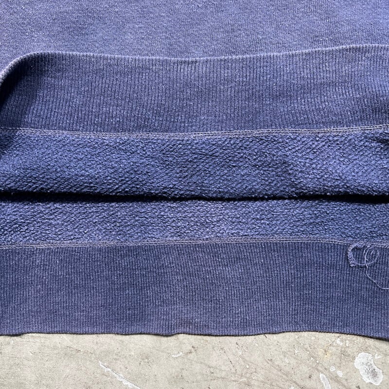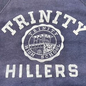 60年代頃のCHAMPIONラグランカレッジスウェットシャツです。大文字ランタグが使用されたアイテムです。コットンボディホワイトのラバープリントが入ります。TRINITY HIKLLERSはペンシルバニア州ワシントンで設立された高校のアスレチッククラブの名称です。ネイビーボディが経年で褪色し、素晴らしいナス紺カラーへと変化しています。リブにステッチ飛びや細かな擦れ等ございますが、大きなダメージや汚れはございません。Lサイズでサイズ感も良く、王道なアメカジスタイルにお勧めな1着です。ヴィンテージスウェットとしてはコンディションも良いので、お探しだった方は是非この機会にいかがでしょうか。