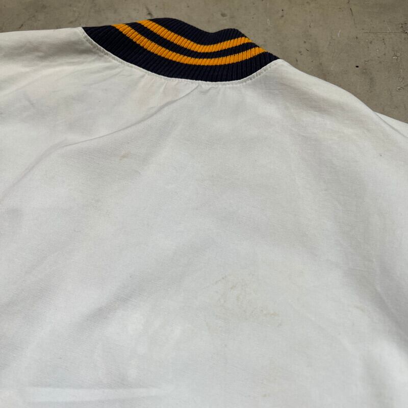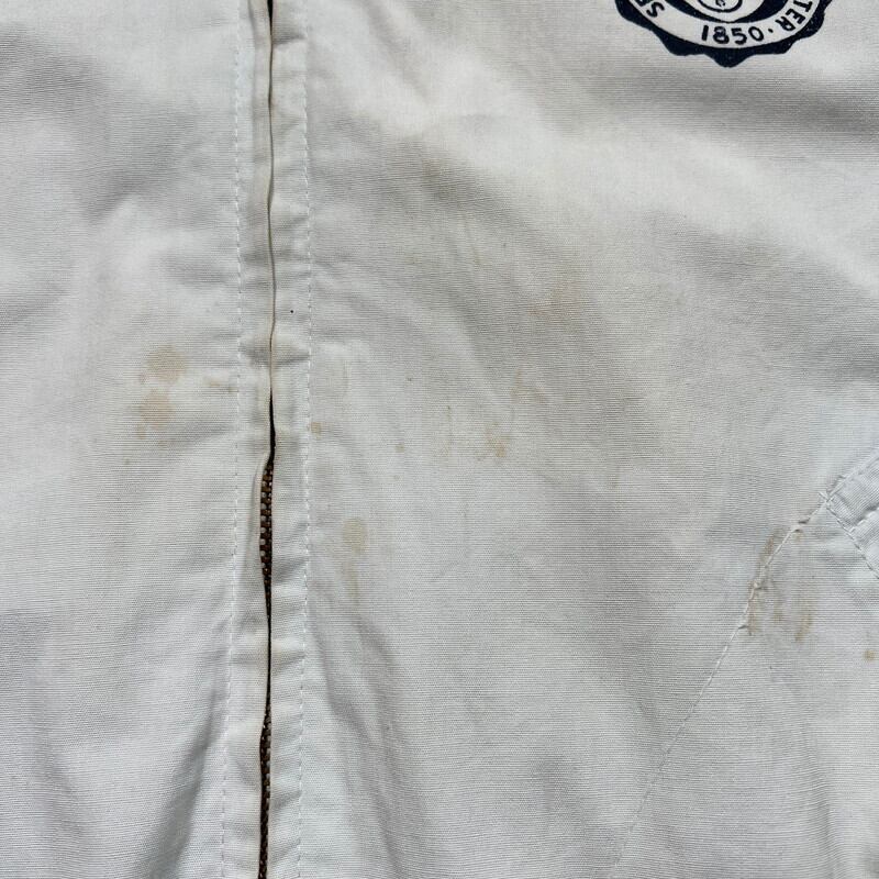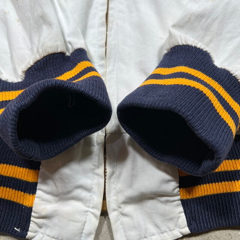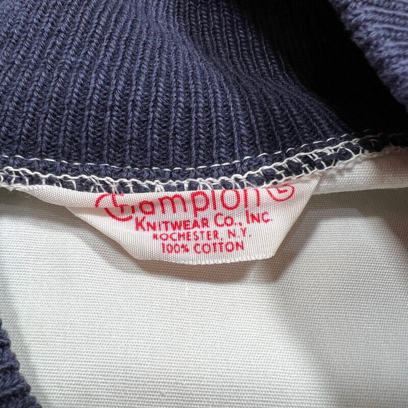 60年代頃のChampionコットンスタジャンです。ボディ、リブ共にコットン100%のジャケットです。フロントはブラスのTALONジッパーが使用されています。胸元には1850年にニューヨーク州で設立されたロチェスター大学のプリントがラバーで施されています。全体的に薄汚れ等の使用感があり、袖等にシミが見られます。ジッパー付け根付近に縫い直しされた形跡がございます。際立つダメージは特にございません。Lサイズ表記ですので、軽く羽織るにはちょうど良いサイズ感だと思います。シャンブレーシャツにチノと合わせてプレッピーのようなスタイルでも使い易いと思いますので、軽いライトアウターをお探しだった方はこの機会にいかがでしょうか。