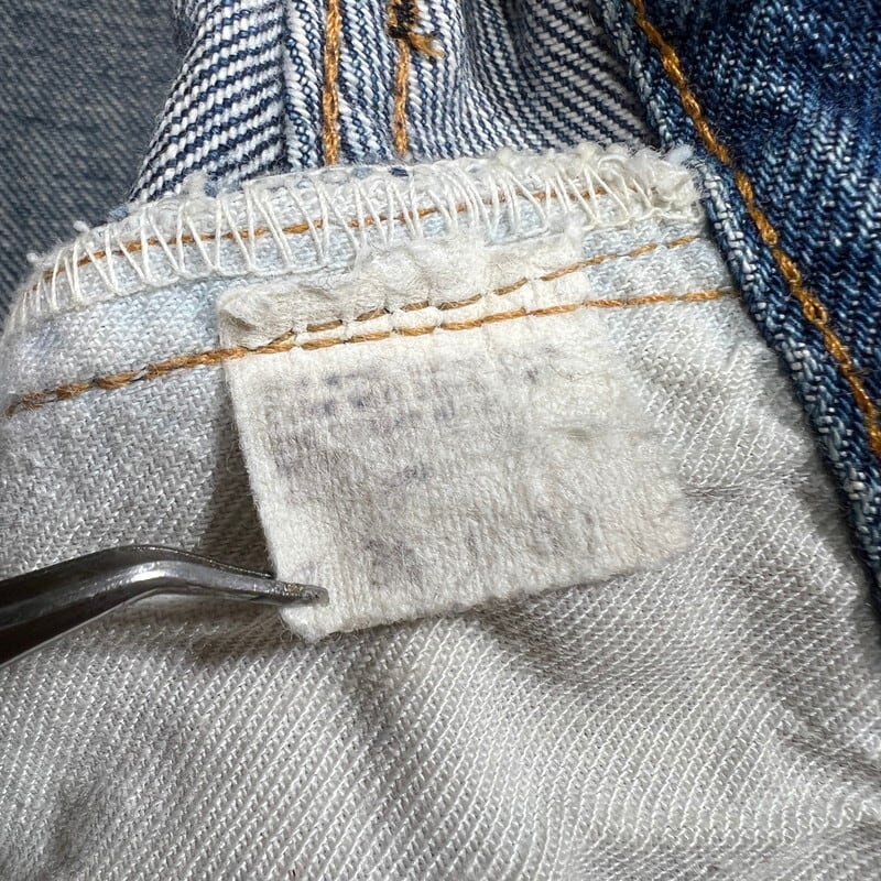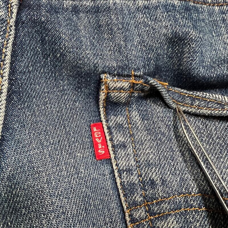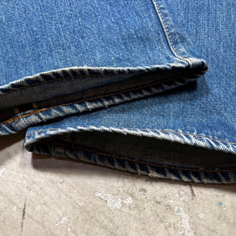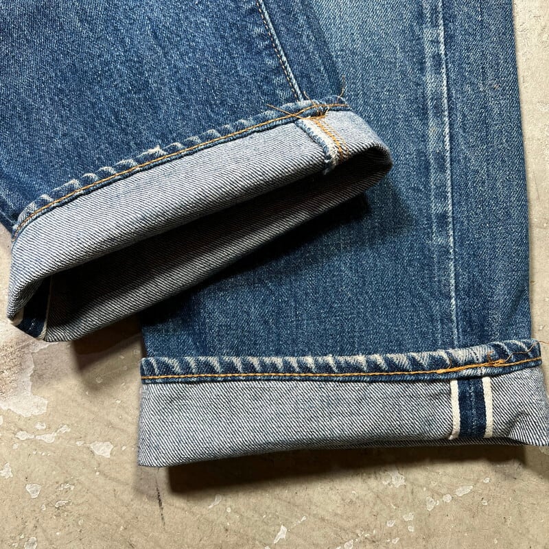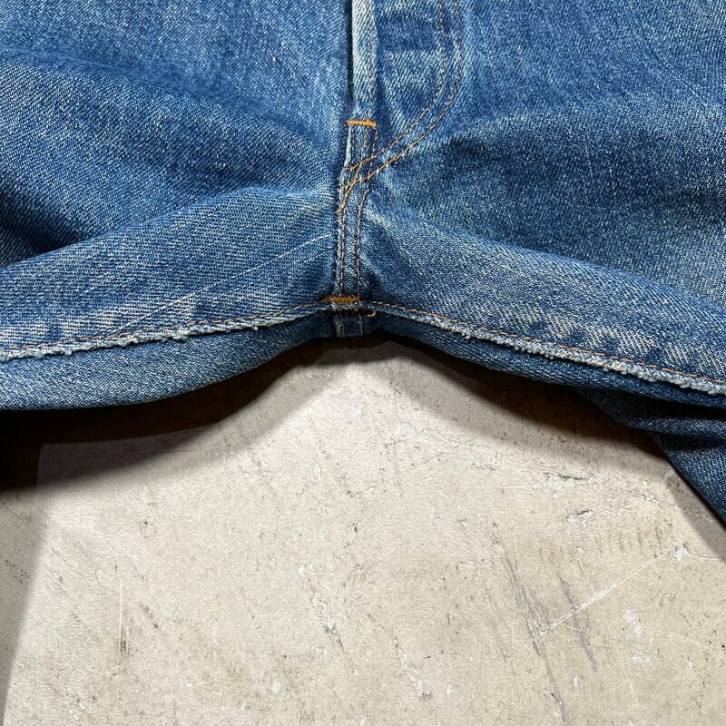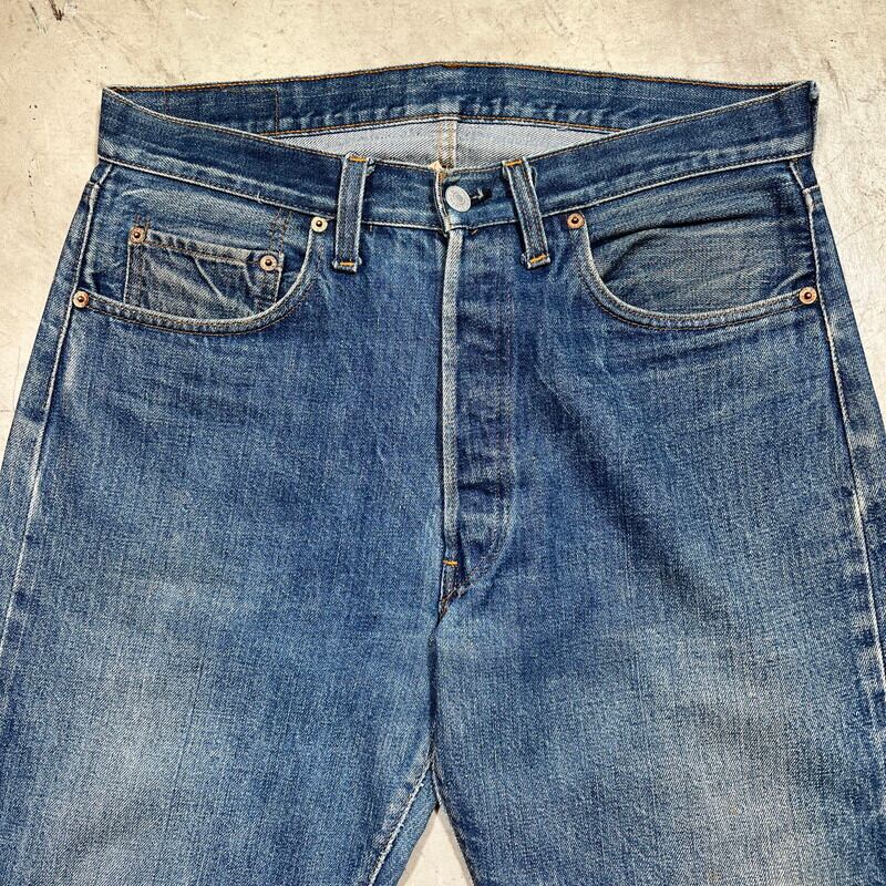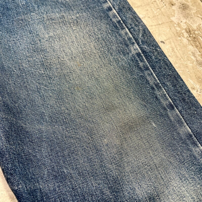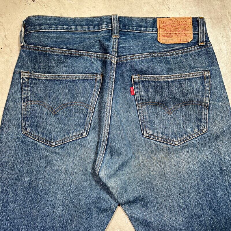 70年代のLevi's 501 デニムパンツです。通称”66前期"と呼ばれるモデルです。フロントトップボタン裏刻印6、ウォッチポケット裏チェーン、バックポケット裏シングル、赤タブスモールe。濃淡の利いた良い色落ちで非常に雰囲気の良い個体です。内股や裾に若干の擦れはあるものの久しぶりにダメージやリペアの無い良個体が入荷しました。色残りは5割程ですがサイズバランスも良くレングスもオリジナルです。欠損しがちな紙パッチも印字がはっきりと読める状態で残っています。ウエストはW34インチ表記で、実寸はW33インチとゴールデンサイズです。穿き込めばこれからのエイジングも充分楽しんでいただける1本です。66モデルでもコンディションの良い個体は見つかりづらくなり、価格も高騰傾向にありますので、お探しだった方はこの機会を是非お見逃しなく。