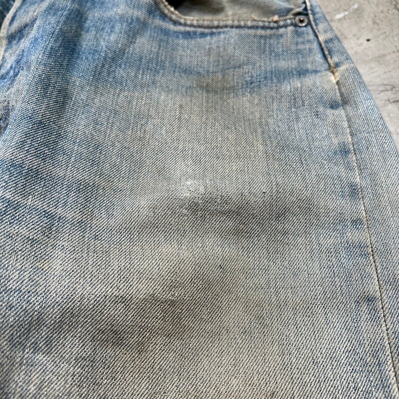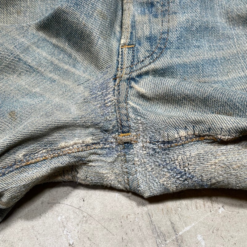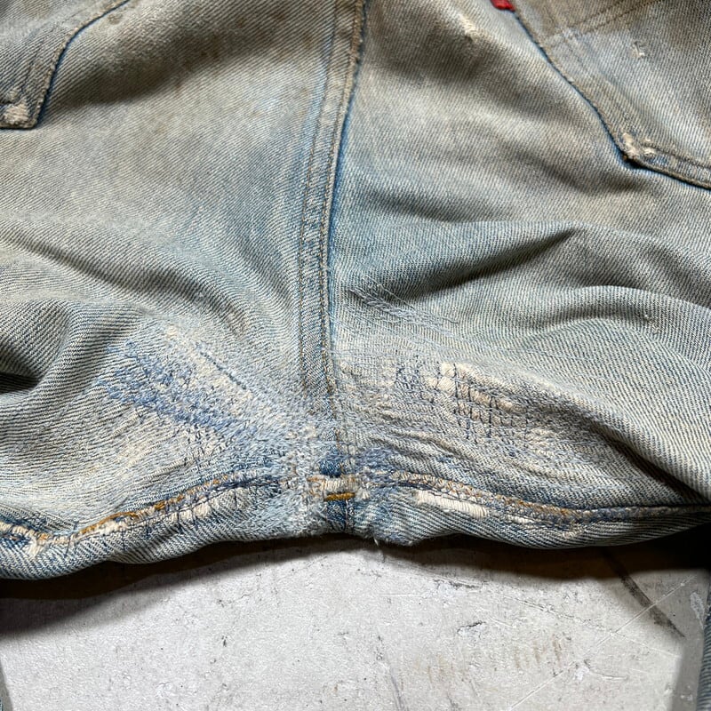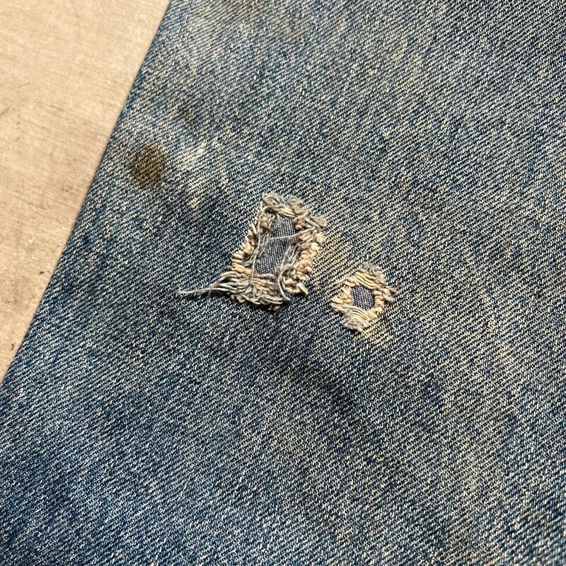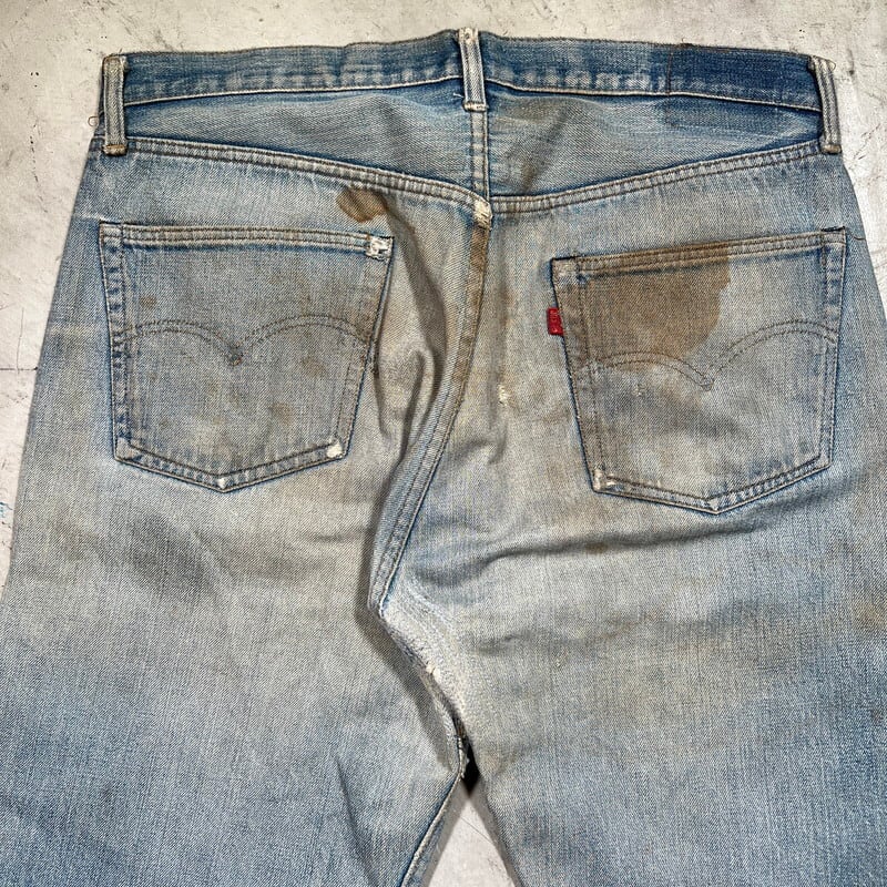 70年代頃のLevi's 501 デニムパンツです。通称”66前期”と呼ばれるモデルです。フロントトップボタン裏刻印6、ウォッチポケット裏チェーン、バックポケット裏シングル、赤タブスモールe、紙パッチ欠損。全体的に使用感が強く、ダメージやリペアのある個体です。股付け根からお尻にかけて®ペアが施されています。両膝や裾付近にダメージがございます。右脛付近にもハンドリペアが見られます。色味は薄めですが、全体的に汚れが入っておりダメージと相まってグランジ感の強い1本となっております。ウエストは実寸でW36インチありゆったりとした大きさです。ダメージや汚れの入る個体ですが、気兼ねなくラフに着用できますので、そのままのグランジ感を楽しむも良し、リペアでカスタムするも良しな1本でオススメです。