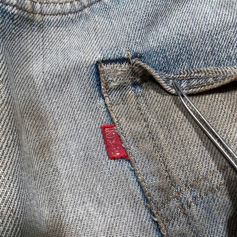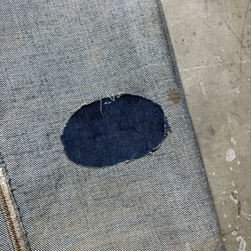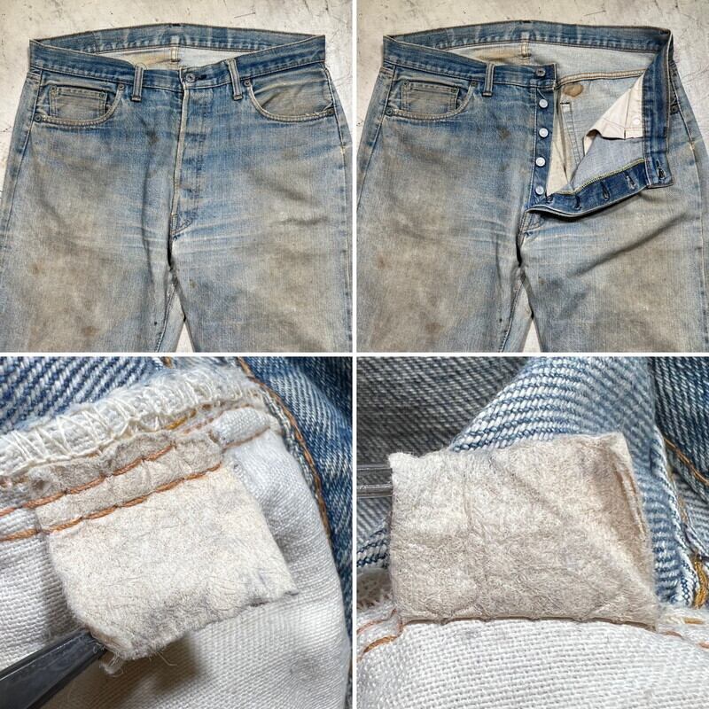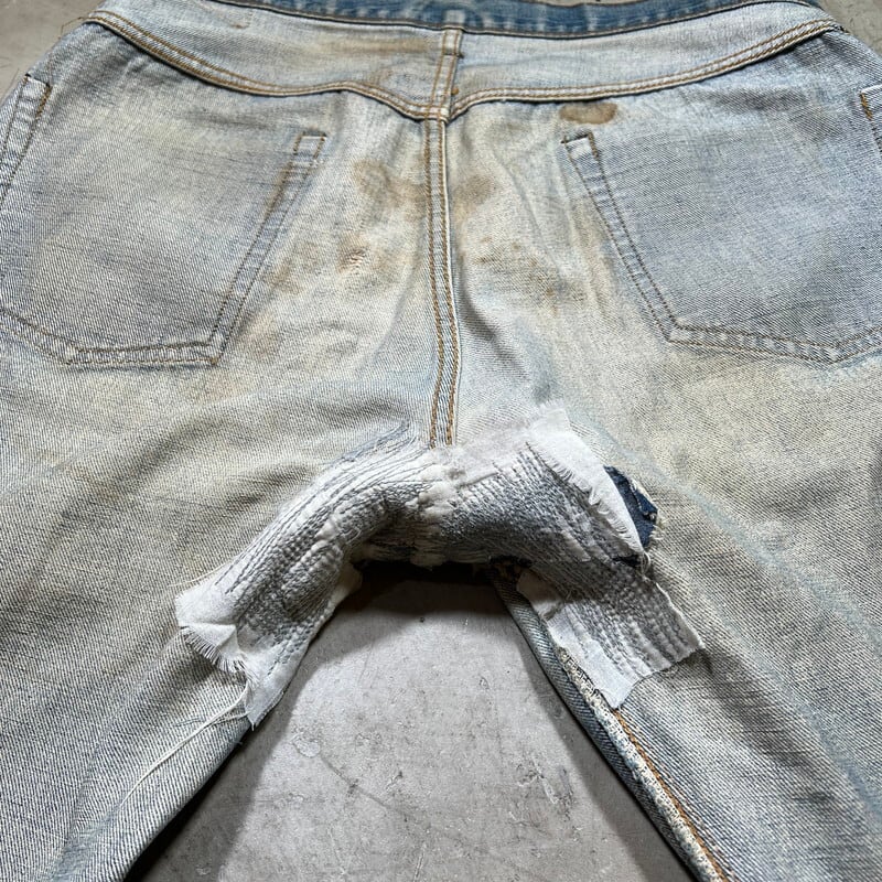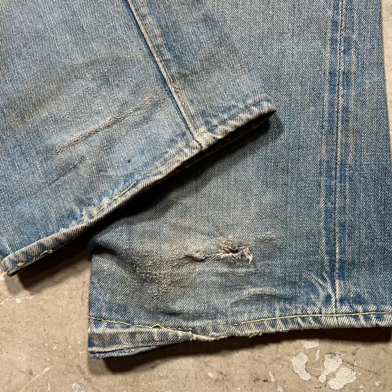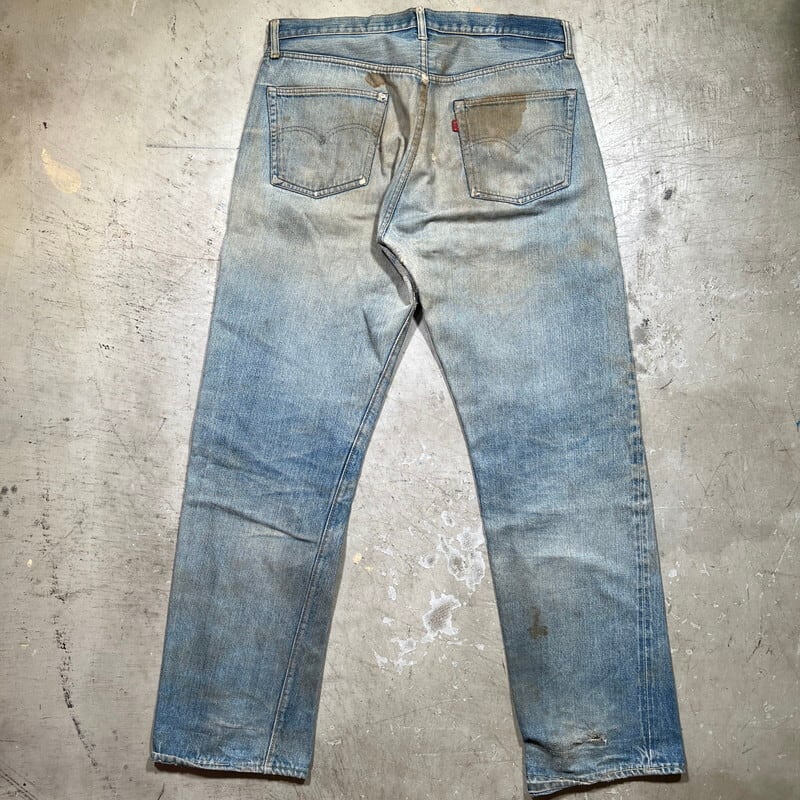 70年代頃のLevi's 501 デニムパンツです。通称”66前期”と呼ばれるモデルです。フロントトップボタン裏刻印6、ウォッチポケット裏チェーン、バックポケット裏シングル、赤タブスモールe、紙パッチ欠損。全体的に使用感が強く、ダメージやリペアのある個体です。股付け根からお尻にかけて®ペアが施されています。両膝や裾付近にダメージがございます。右脛付近にもハンドリペアが見られます。色味は薄めですが、全体的に汚れが入っておりダメージと相まってグランジ感の強い1本となっております。ウエストは実寸でW36インチありゆったりとした大きさです。ダメージや汚れの入る個体ですが、気兼ねなくラフに着用できますので、そのままのグランジ感を楽しむも良し、リペアでカスタムするも良しな1本でオススメです。