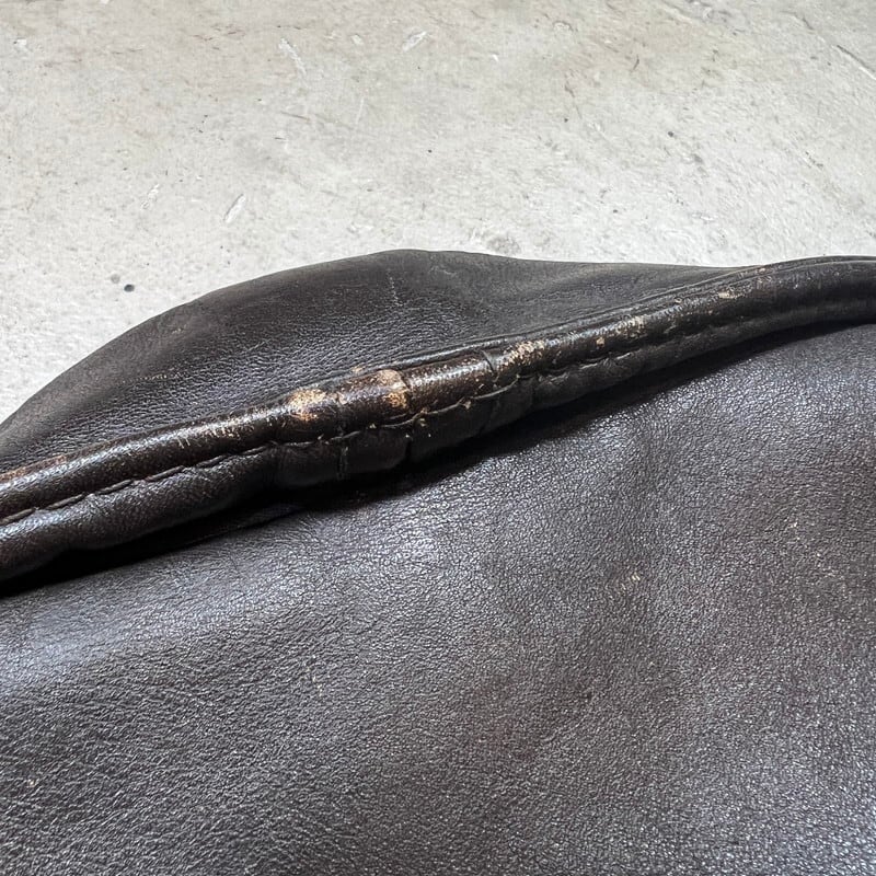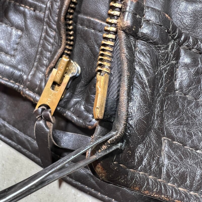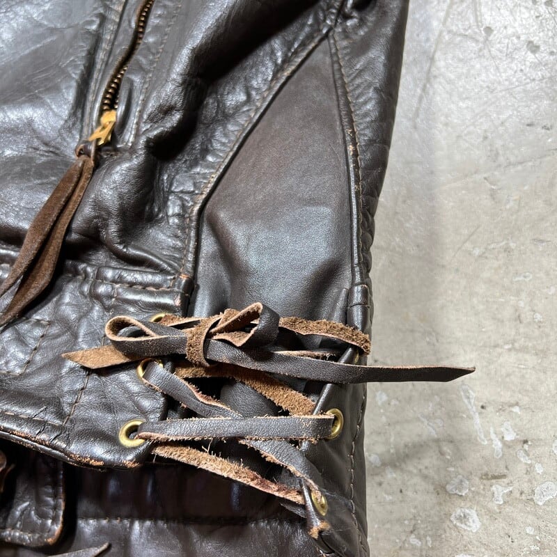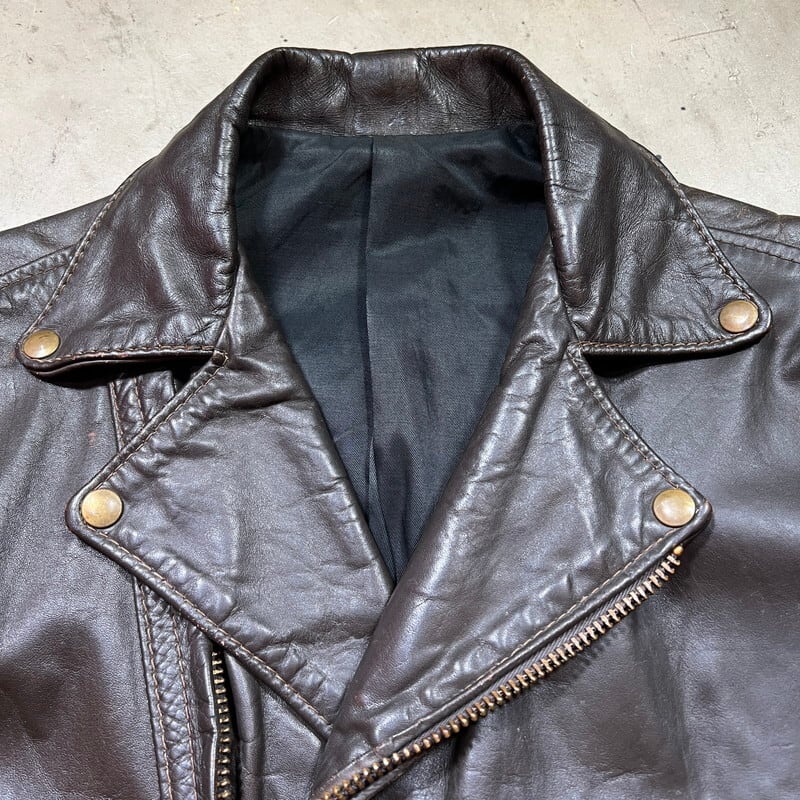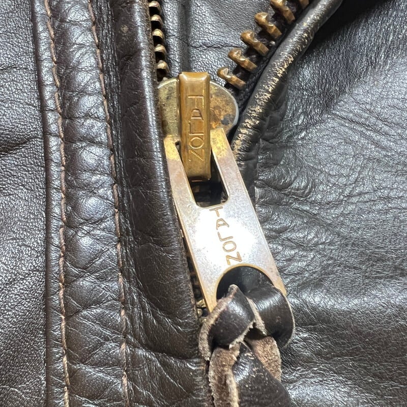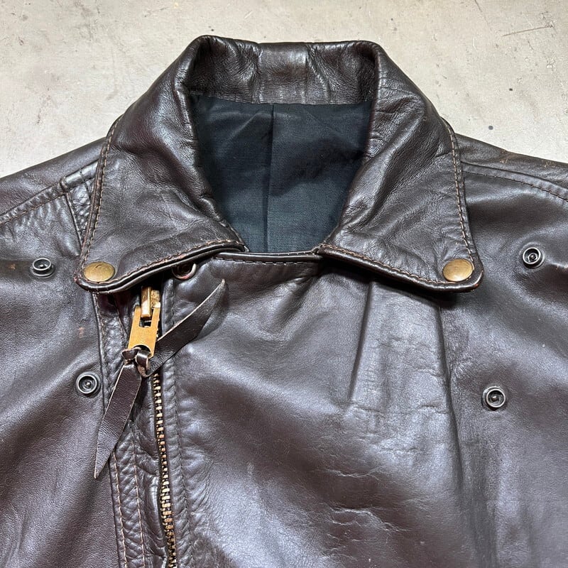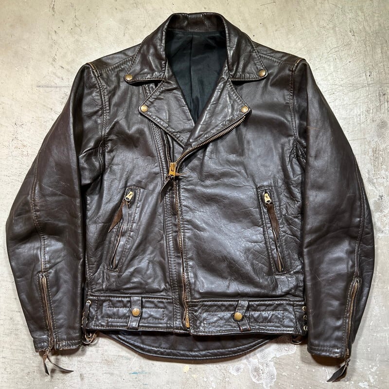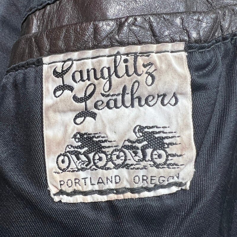 70年代後半から80年代初頭頃のLanglitz Leathers Columbia ライダースジャケットです。1947年にThe Leather Garment Shopという小さなショップから始まったブランドで、1950年以降に現在のLanglitz Leathersへと社名を変更しています。ご紹介するこちちらは、ラングリッツの中でも定番と言えるコロンビアというモデルで、定番のブラックでは無く珍しいダークブラウンカラーです。フロントがダブル仕様のライダースジャケットです。フロントはブラスのデカTALONジッパー、ポケットと袖はベル型のTALONジッパーが使用されています。ジッパーは全てスムーズに開閉出来、差し込み部付け根は若干擦れはあるものの良好です。内側の白タグはUSA表記の入らないタイプです。内ポケットには元の所有者の名前がスタンプされておりますが、製造年の記載はございません。裏地はギャバジン織のサテンが使用されています。袖先や裾、背面などに擦れは見られますが致命的なダメージは無くコンディションは良好かと思います。ポケットスレーキも汚れは少なく良好です。サイズ表記はありませんが、38~40程の大きさで、シルエットがとにかく綺麗です。古いモデルでここまで状態やサイズの良い個体はなかなか出ません。是非、キングオブレザーと呼ばれる所以を感じてください。バイカーの方はもちろんですが、タウンユースとしても使い易いと思いますので、古いラングリッツをお探しだった方はこの機会をお見逃しなく。カラーも被りにくくオススメです。