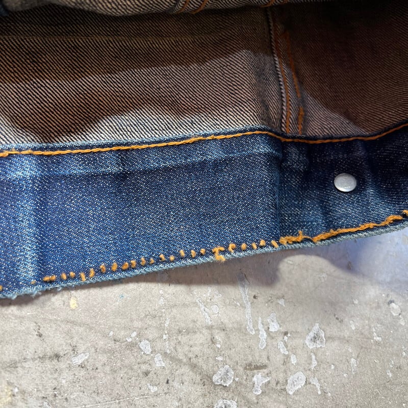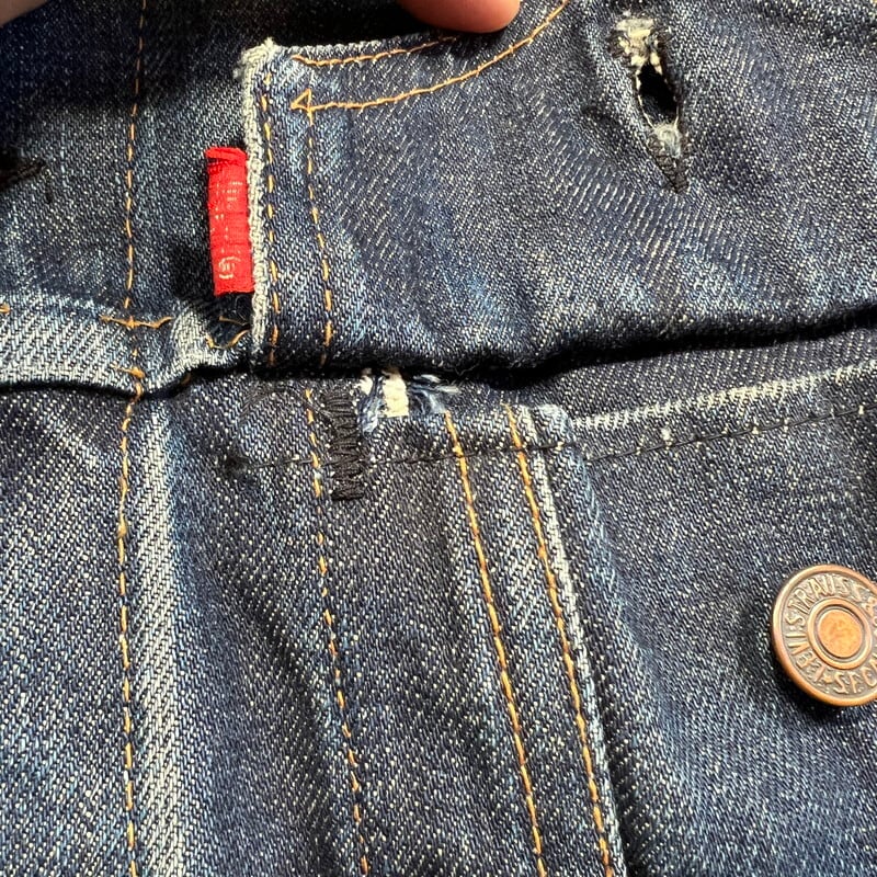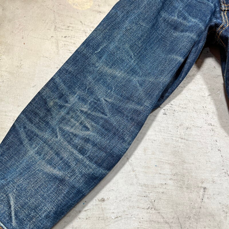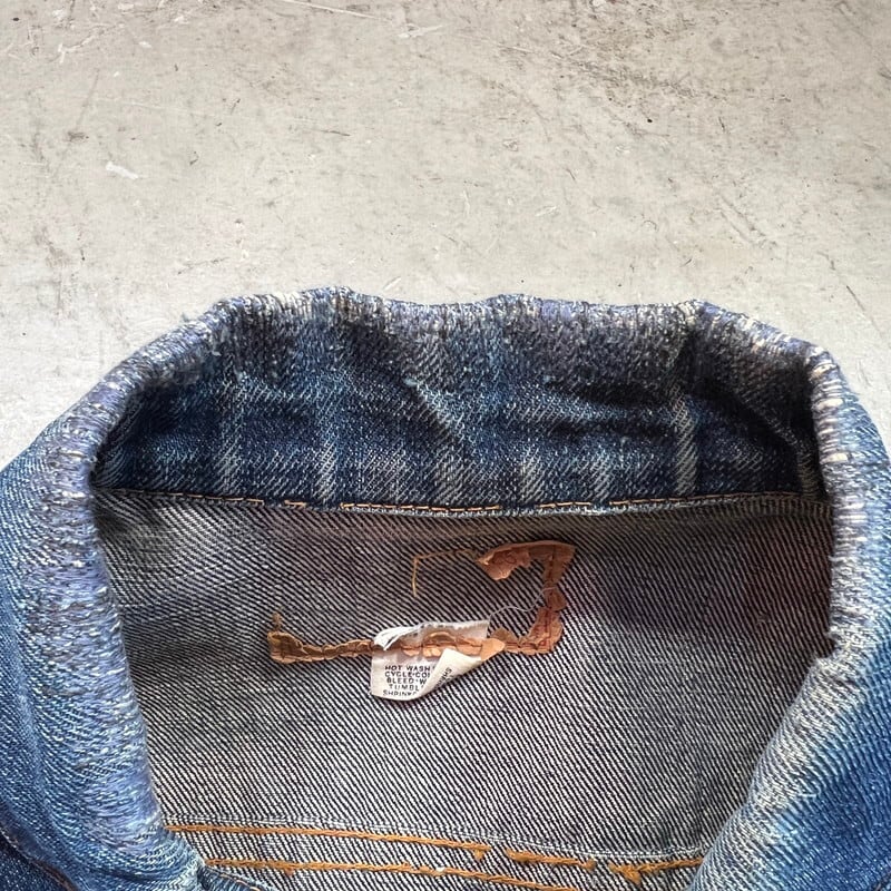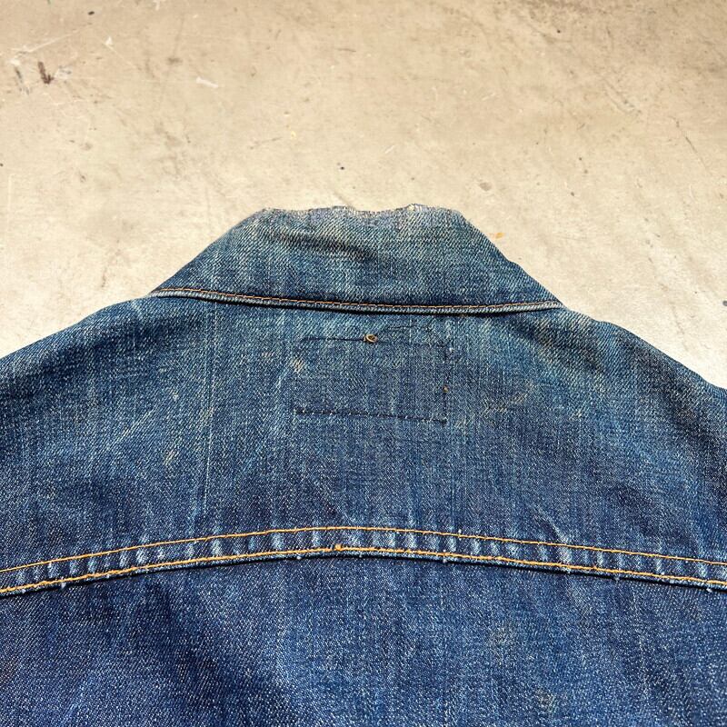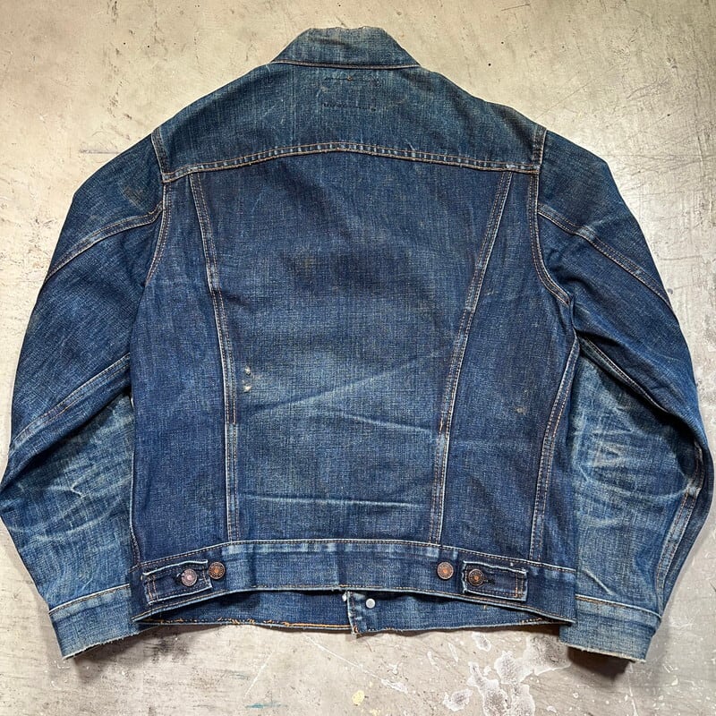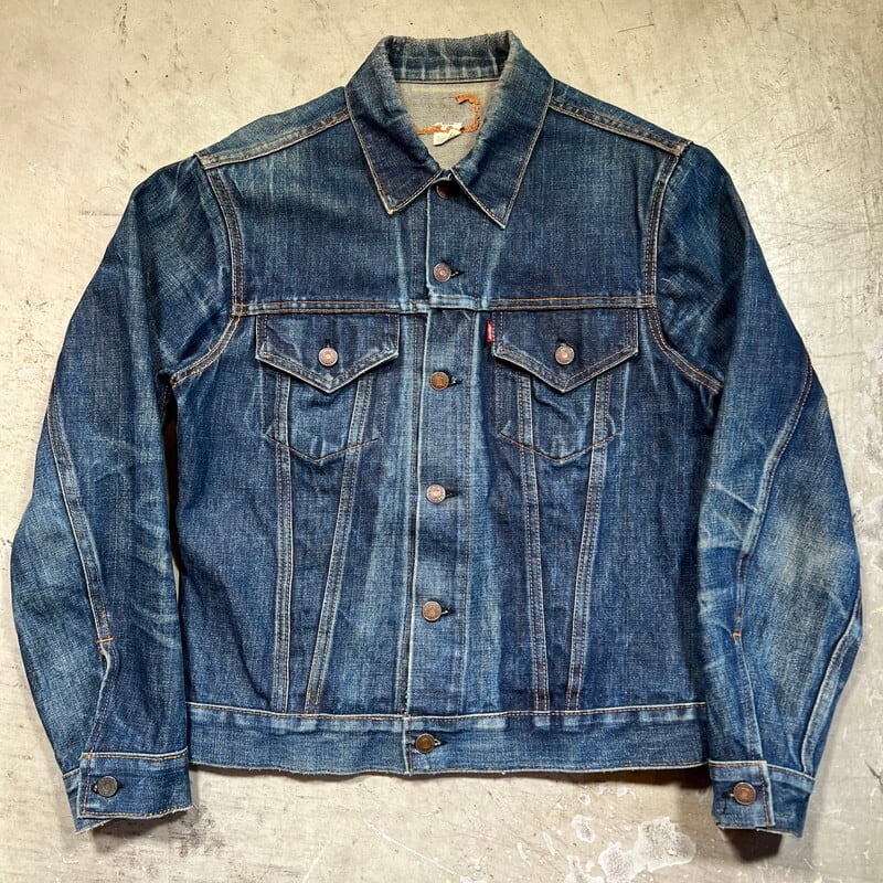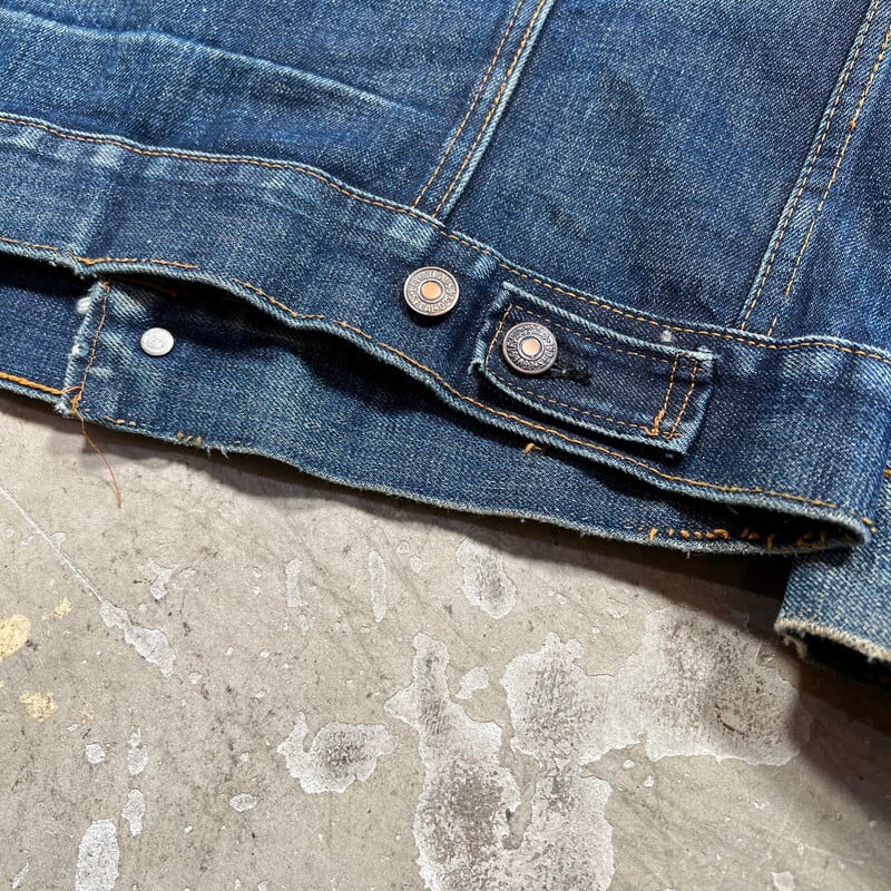 60年代頃のLEVI'S 70505デニムトラッカージャケットです。小紙パッチ、ボタン裏ドット刻印、赤タブBig E、不均等V、ポケット裏シングル、閂ブラック。所謂4thと呼ばれるモデルです。557の3rdに比べ着丈も長いのでファッション性も高く様々なスタイリングに使える優れものです。ご紹介するこちらはのフロントボタン横や袖のハチノスがくっきりと濃淡が付いた個体です。少し糊が残っているようで、糊付けして着用されていたのかもしれません。襟にリペア補修があります。袖先はステッチ飛びや擦れによるダメージがございます。背面には小さなダメージが見られます。裾はステッチ切れが多く見られます。紙パッチがほとんど欠損しています。サイズ表記が確認できませんが、実寸は40といったところでしょうか。リペア等ございますが、濃淡のついた色味が非常に雰囲気も良く、これからのエイジングも楽しめる1着だと思います。濃いめな個体を探されていあた方や袖のハチノスがお好きな方は是非この機会いかがでしょうか。
