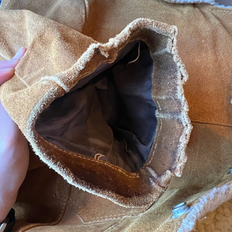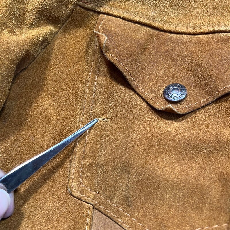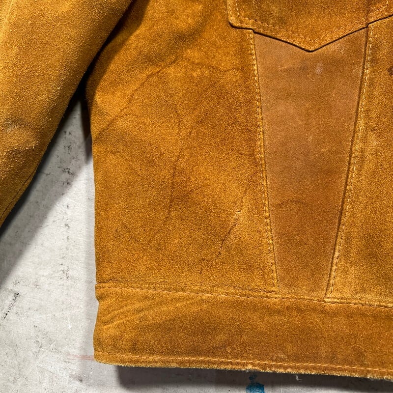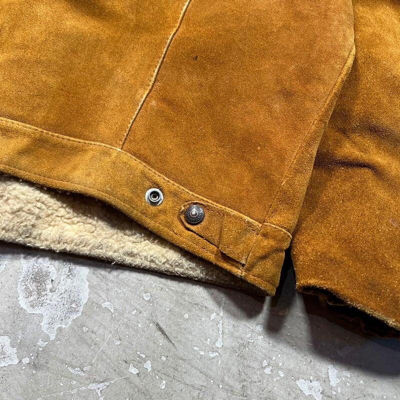 50年代頃のLEVI'Sスエードボアジャケットです。ショートホーンタグが付くモデルで、明るめな色味のスエードが使用された1着です。ボディ裏地にアクリルボアが付き、袖内側はサテン地のライニングが施されています。赤タブは均等VのBig Eです。ボタンは全てスナップ式で問題なく開け閉めできます。全体的に薄汚れがあり、小傷等が見られます。ひび割れのようにシワが入っており、裂けてはいませんが表面のみ擦れたようになっています。袖先は破れた箇所を補修した形跡がございます。袖先内側のライニングにも破れが見られます。サイズ表記はありませんが、身幅に比べ着丈と袖丈が短い印象です。もしかすると袖先は当時に詰められているのかもしれません。身幅的には38~40位でしょうか。小柄な女性ががばっと羽織るのも良いかもしれません。短丈で、袖も短めなので、レイヤードを楽しまれてはいかがでしょうか。
