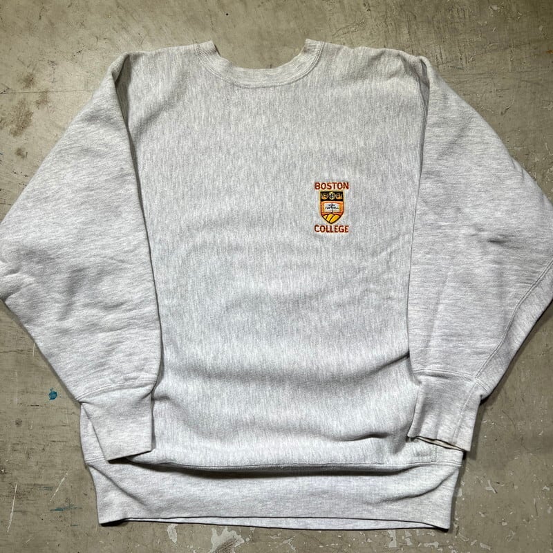 90年代のChampionリバースウィーブスウェットです。1863年に設立されたBOSTON COLLEGEのエンブレムが胸元に刺繍されています。首元にうっすらと汚れはありますが、その他全体的に汚れやダメージは無くコンディションの良い個体です。XL表記でサイズ感も良く男女共に合わせやすいアイテムです。リバースのカレッジ物ではプリント物が多いですが、小さく刺繍が入る個体は比較的少ないのかなという印象です。シンプルなデザインですので合わせやすいのでお好きな方は是非いかがでしょうか。