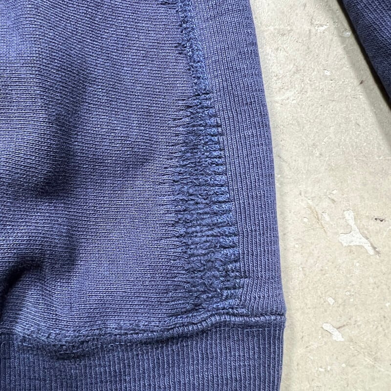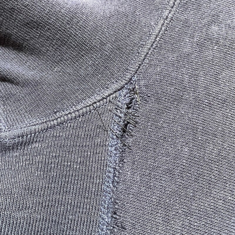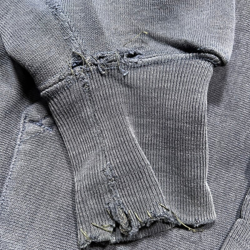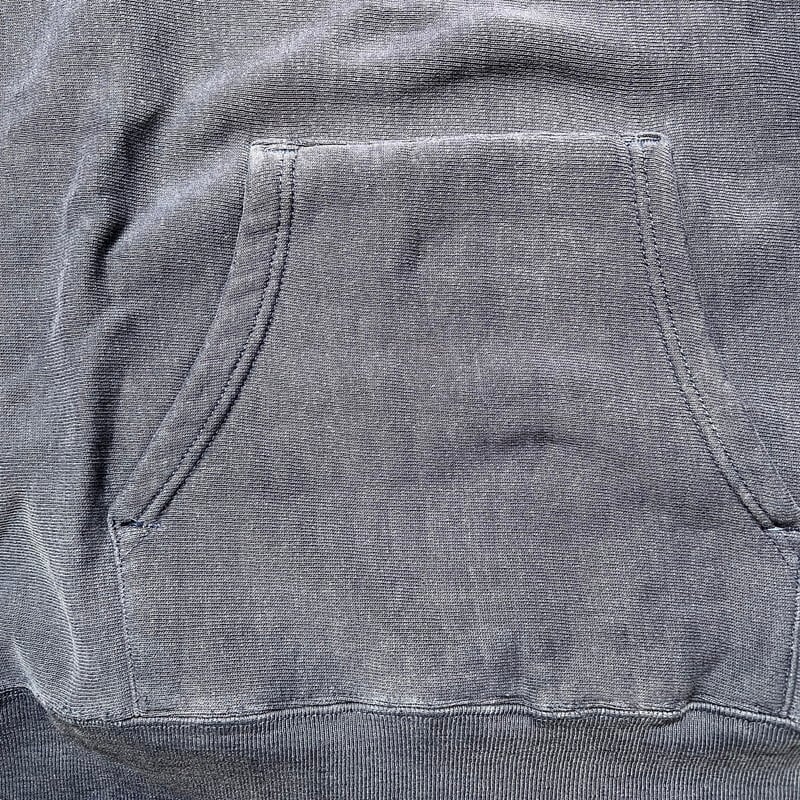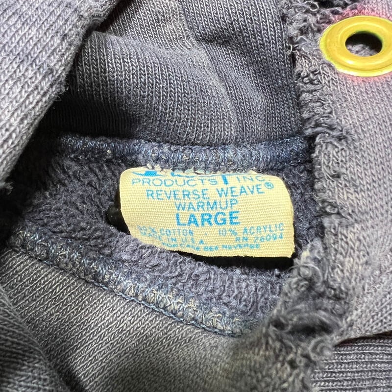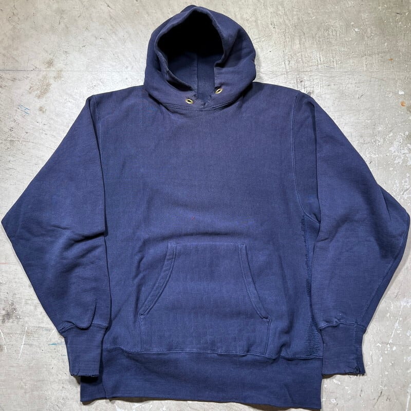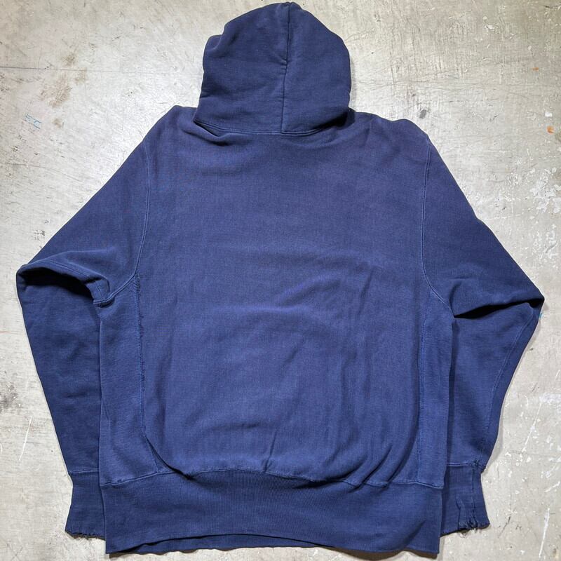 70年代のChampionリバースウィーブスウェットパーカーです。単色タグが付くこちらは、目無しのソリッドボディで、全体的に褪色し、フード周りが特にフェードしております。ハトメ付近にダメージがあり、脇の縫い目付近にもダメージがございます。袖先にもダメージが見られ、簡易的に補修もございます。LARGE表記で程よくゆとりのあるグッドサイズです。全体的に使用感は強く、色褪せもございますが、ヴィンテージスウェットらしい良い雰囲気です。年々単タグ期の目無しモデルも見かける機会が減っていますので、お探しだった方はこの機会をお見逃しなく。