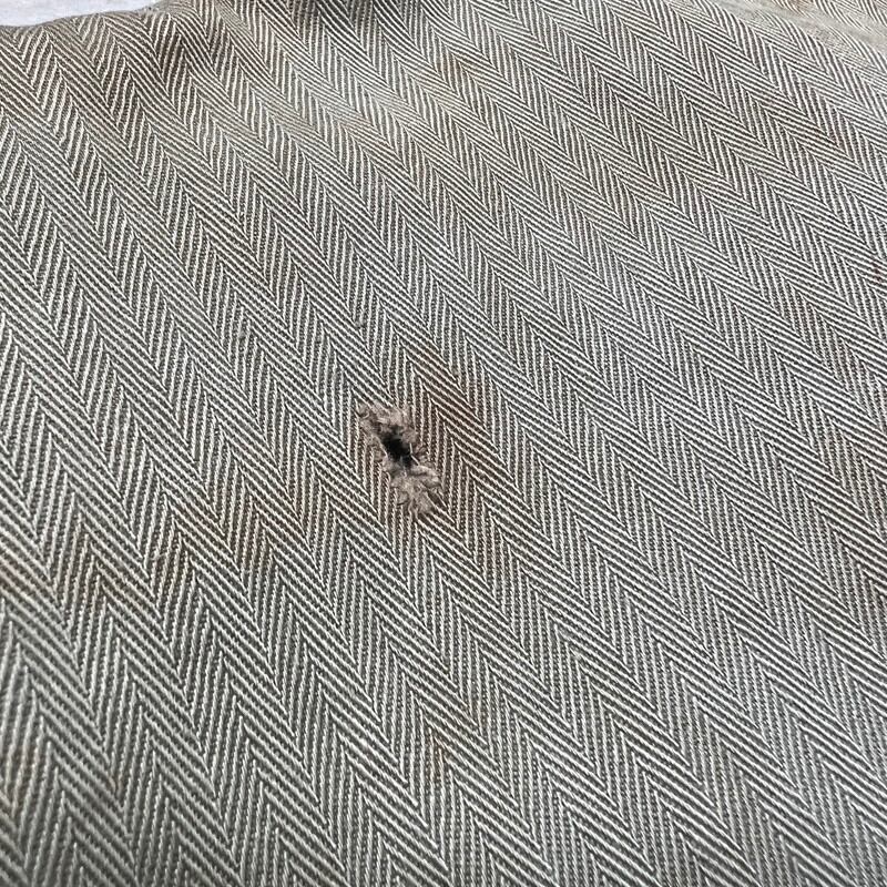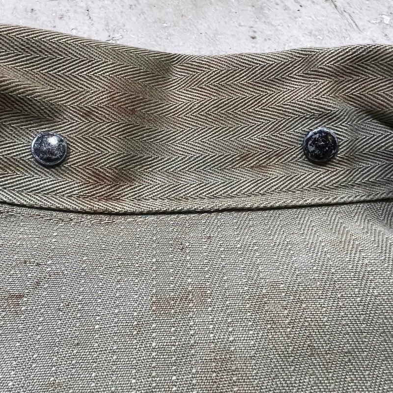 40年代頃のUSMC P-44HBTユーティリティージャケットです。カバーオールタイプのP-41の後継モデルとして仕様を変更して作られたのがこのP-44です。P-41のカバーオールタイプの下部のポケットを排除した代わりにM-35の様に横から出し入れするポケットを胸元に配置したデザインが特徴的です。ボタンは全てUSMCの浮彫ドーナツボタンが使われております。全体的に汚れなど使用感があり、左肩後ろに1cm程のダメージがございます。袖先にも擦れによるダメージがございます。サイズ表記はございませんが、恐らく38~40相当かと思われます。全体的な汚れや小さなダメージは見られますが、生地自体はしっかりしており、雰囲気のあるヴィンテージミリタリーウェアです。意外にも当店では初の入荷のアイテムで、40年代のHBTアイテムは年々枯渇しておりますので、お探しだった方は是非この機会にいかがでしょうか。