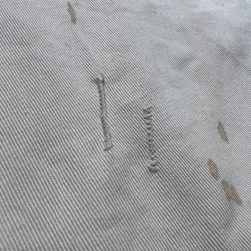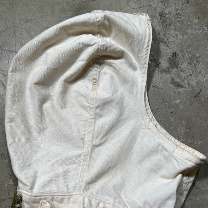 40年代のU.S.NAVY サルベージパーカーです。こちらは海軍にて危険物処理や救助用に使用されていたスモックパーカーで、後期型のモデルです。ガスマスクを着用したまま被れる大きなフード特徴的です。ボタンは元から付きませんが、フードや袖、裾のコットンの紐で絞って調整する仕組みです。全体的に薄汚れがございます。フードやフロントにシミも見られます。ステッチ飛びがいくつかございますが、目立つダメージは特にございません。右の胸ポケットの刺繍からサイズは2でM~L相当かと思います。元々オーバーサイズに作られていますので、万人受けするサイズ感だと思います。一時期に比べると見かける機会も減ったかと思いますのでお探しだった方は是非この機会にいかがでしょうか。