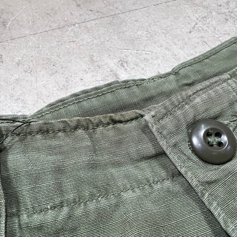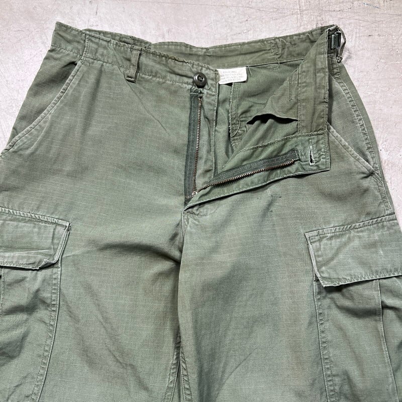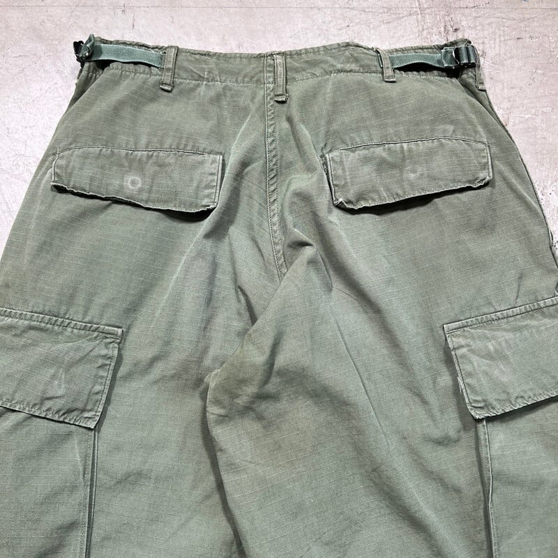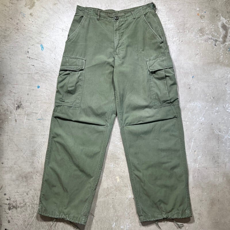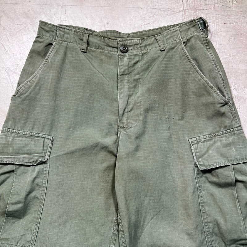 60年代のU.S.ARMYジャングルファティーグパンツです。DSA100-69-C-1197。M.L.W.CORPORATION製。生地の裂け防止の為コットンポプリンのリップストップを採用した4thモデルです。フロントはRマークのジッパーが使用されています。左腿付け根付近に糸抜けの様な箇所がございます。フラップや裾等擦れや褪色は見られますが、目立つダメージや汚れは少なくコンディションは良好です。SMALL-REGURAL表記ですが、サイドのアジャスターで最小でW25インチ、最大でW31インチまで調整が可能です。ミリタリーウェアの中でも人気の高いM-65のフィールドパンツに比べると股上は浅めで、生地も軽く穿きやすいアイテムです。1本あると重宝しますのでお持ちで無かった方やお探しだった方は是非この機会にいかがでしょうか。